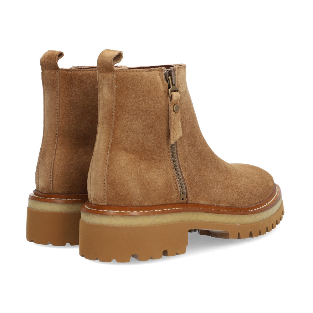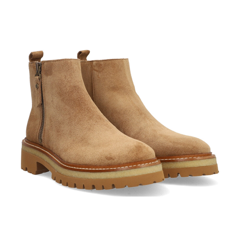 bota casual en serraje color beige natural, ideal para el día a día. diseño de caña media con cremallera lateral decorativa y tirador trasero para facilitar el calce. suela plana dentada de goma con plataforma ligera que aporta altura y comodidad. estilo urbano, versátil y muy combinable con looks relajados o de inspiración boho.