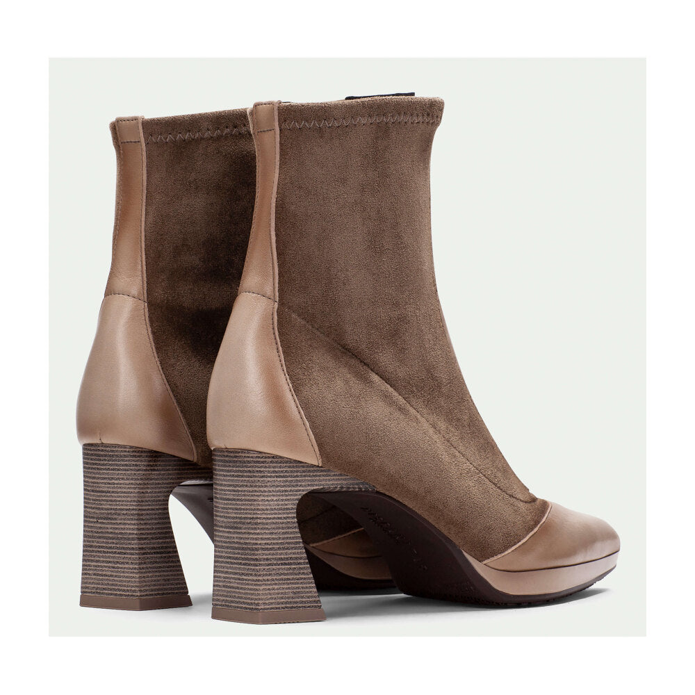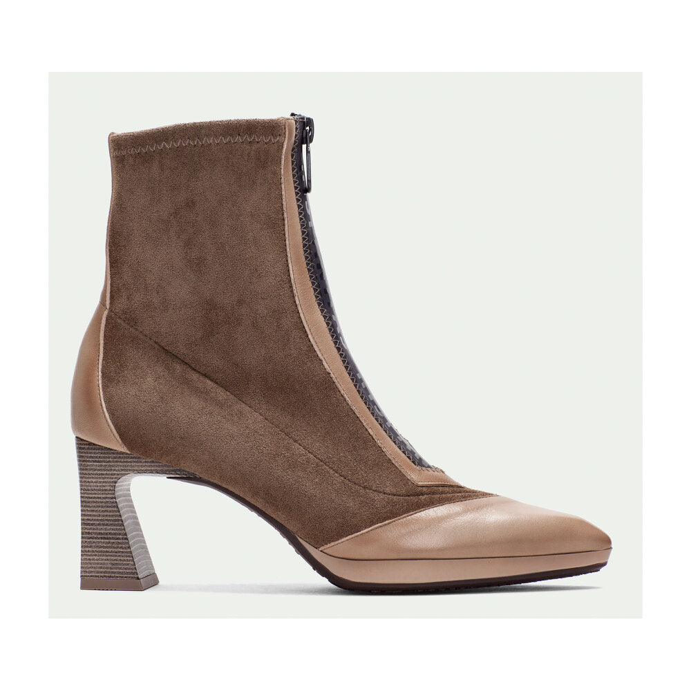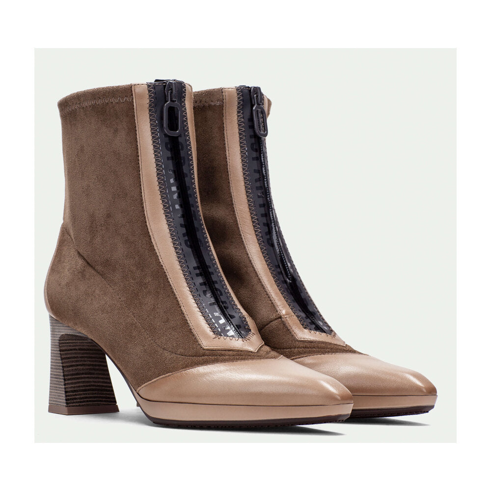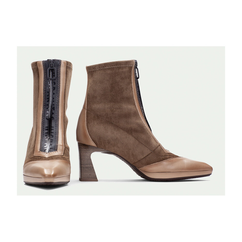Botín de tacón alto de la marca Hispanitas, que combina sofisticación y diseño contemporáneo. Elaborado en suave ante marrón con detalles en piel nude en puntera y talón, incorpora una cremallera frontal para facilitar el calce y aportar un toque moderno. Su tacón ancho proporciona estabilidad y estilo, ideal para quienes buscan un calzado distinguido y cómodo para la temporada otoño-invierno.