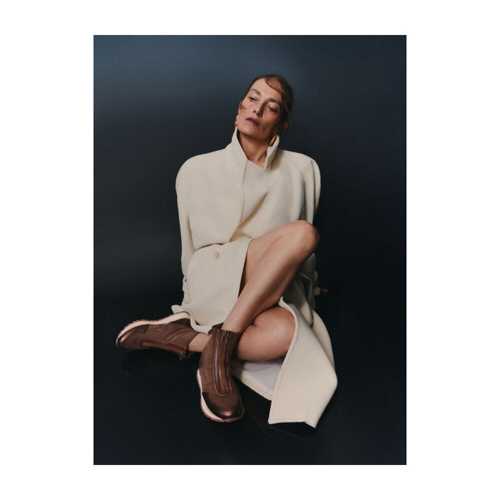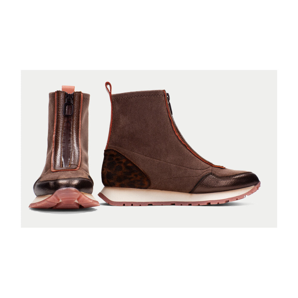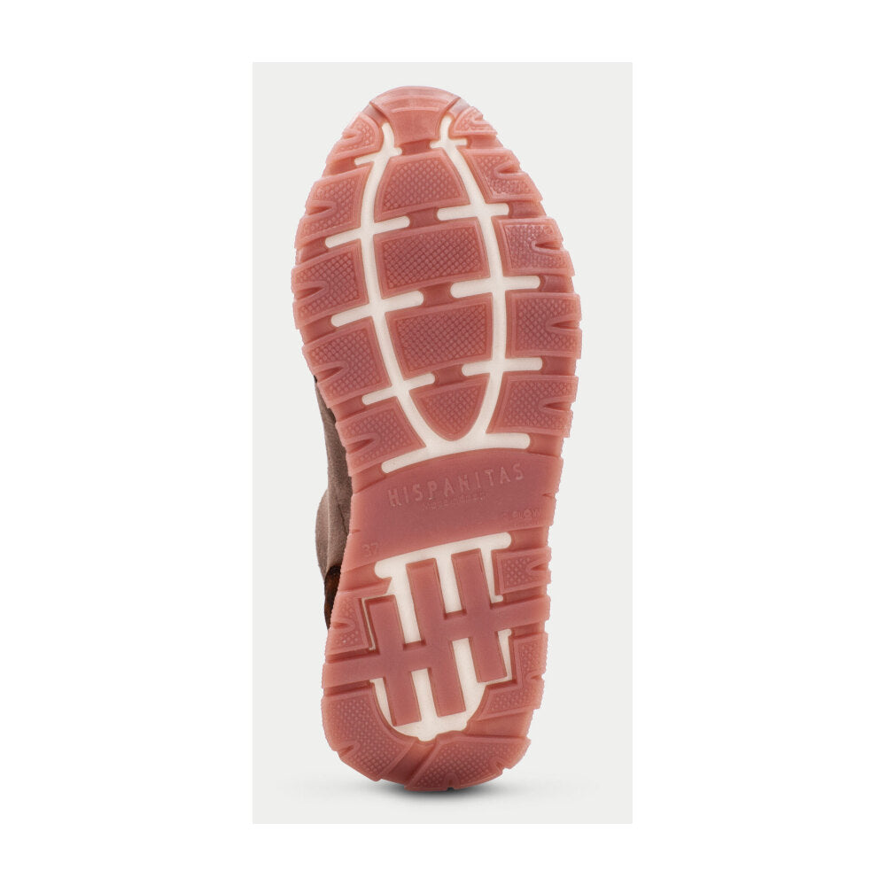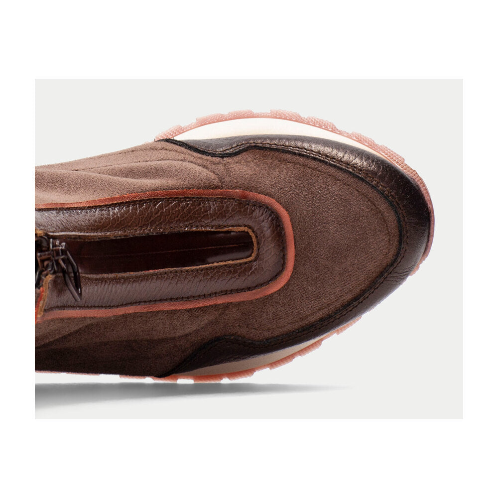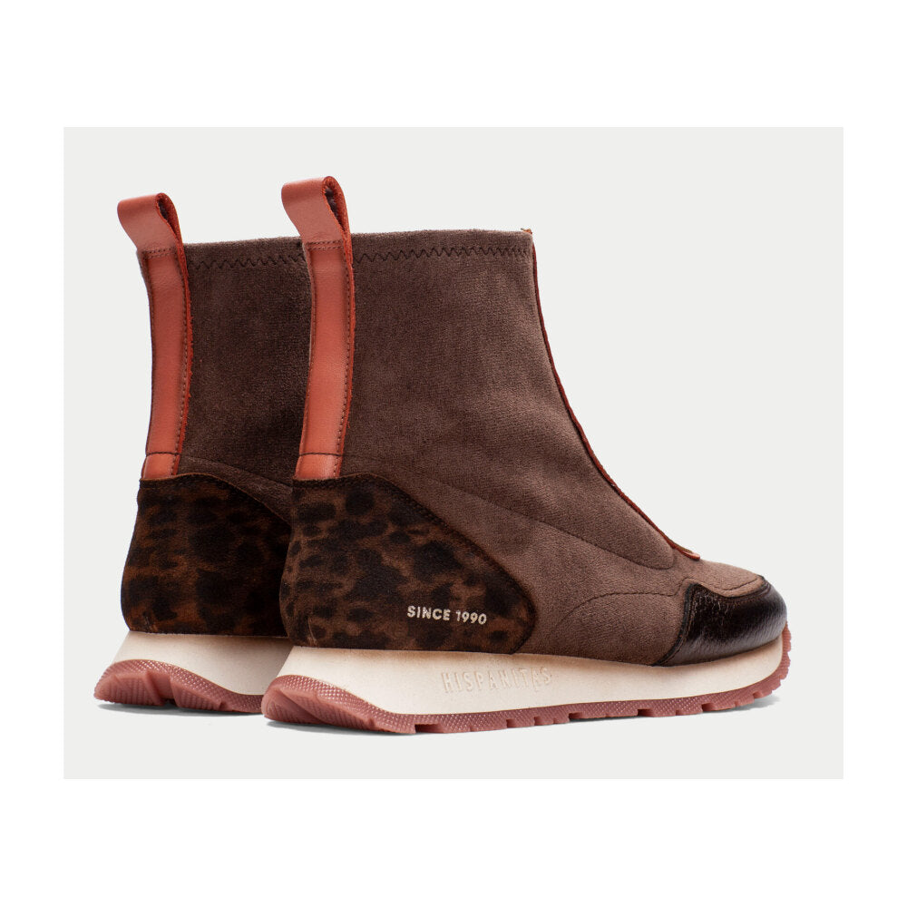 Botín tipo sneaker de la marca Hispanitas en ante marrón chocolate con detalles metálicos y pieza trasera en animal print. Incorpora una cremallera frontal funcional y un tirador trasero para facilitar el calce. Su diseño combina un estilo urbano sofisticado con un aire deportivo, ideal para los looks de diario más actuales. Suela blanca con base dentada en tono burdeos y tecnología TRIFLOW que garantiza una pisada cómoda, flexible y ligera.