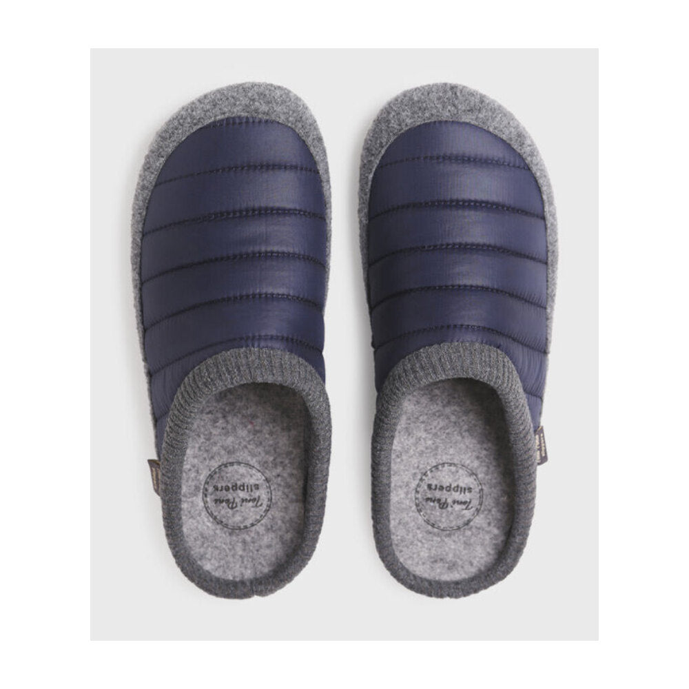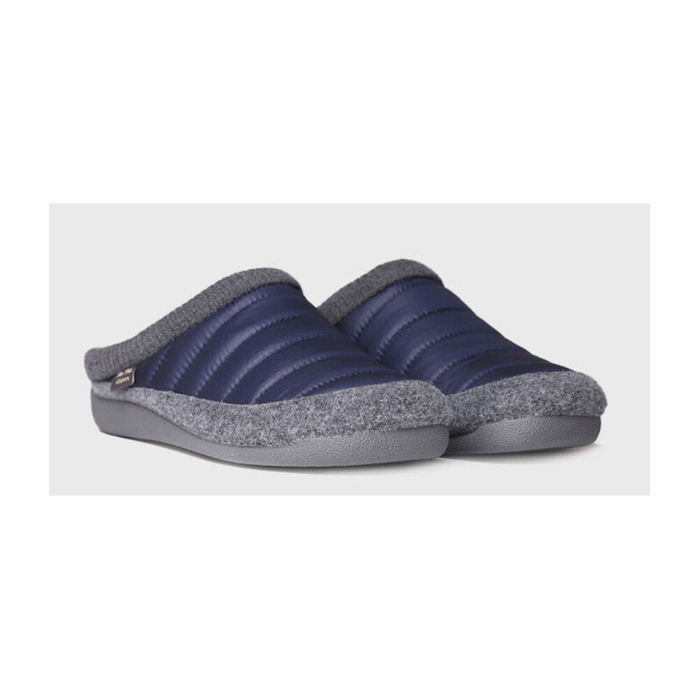 Su diseño tipo zueco abierto por detrás permite un calce rápido mientras el exterior acolchado en azul marino y los detalles en fieltro gris aportan un look moderno y acogedor