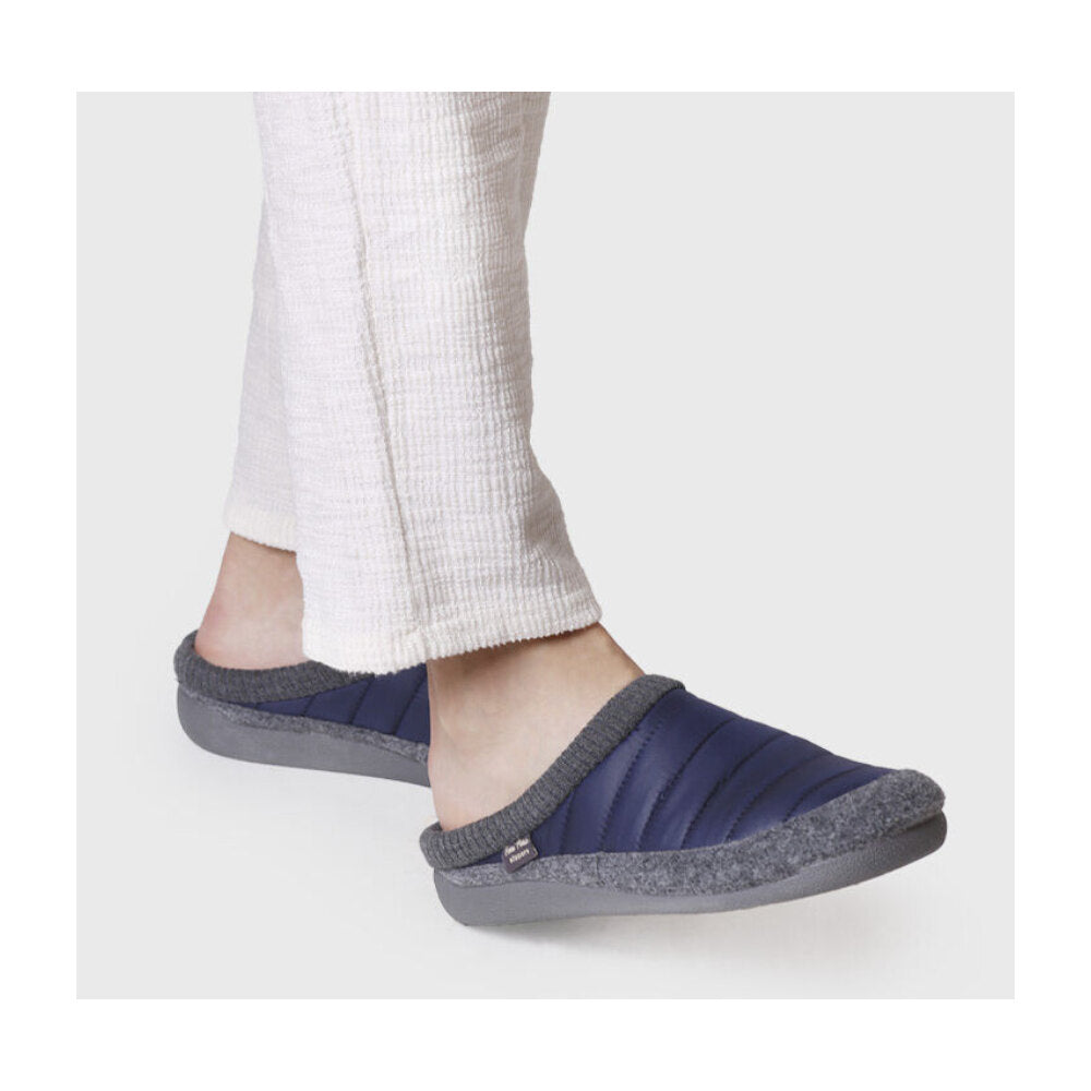 Su diseño tipo zueco abierto por detrás permite un calce rápido mientras el exterior acolchado en azul marino y los detalles en fieltro gris aportan un look moderno y acogedor