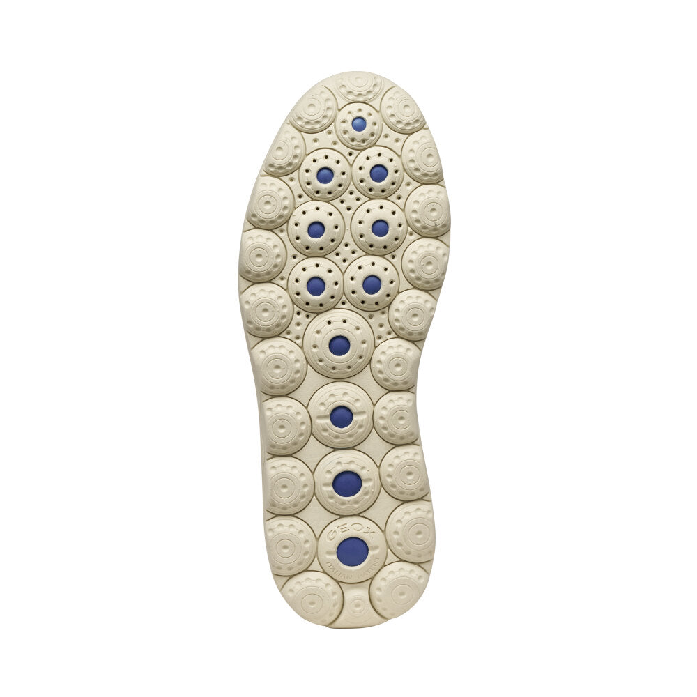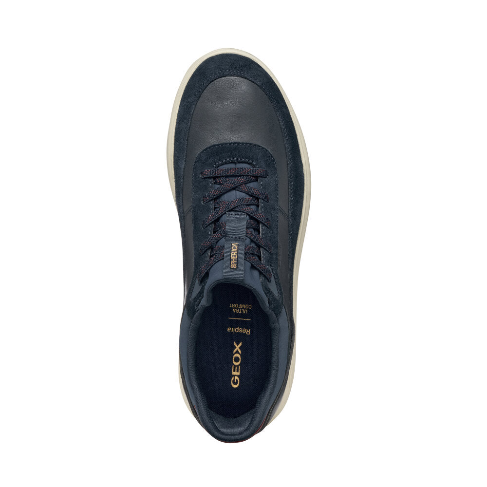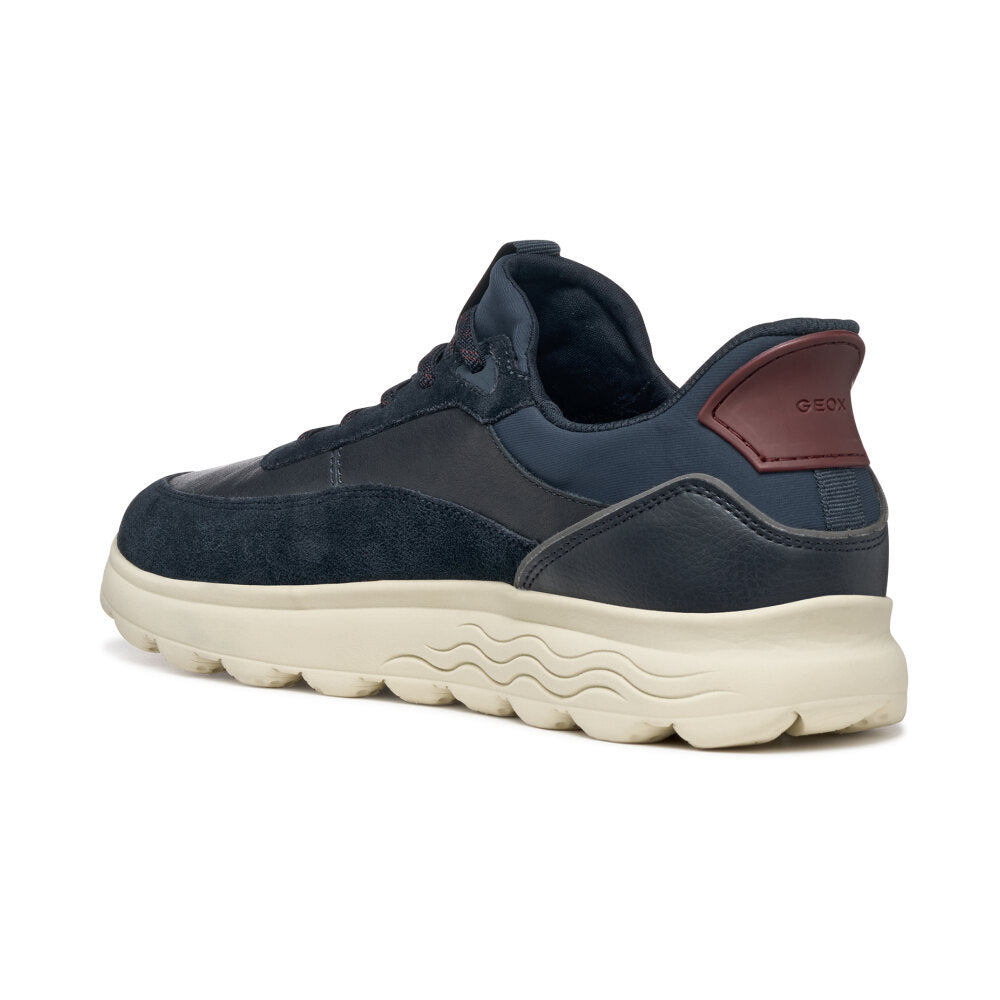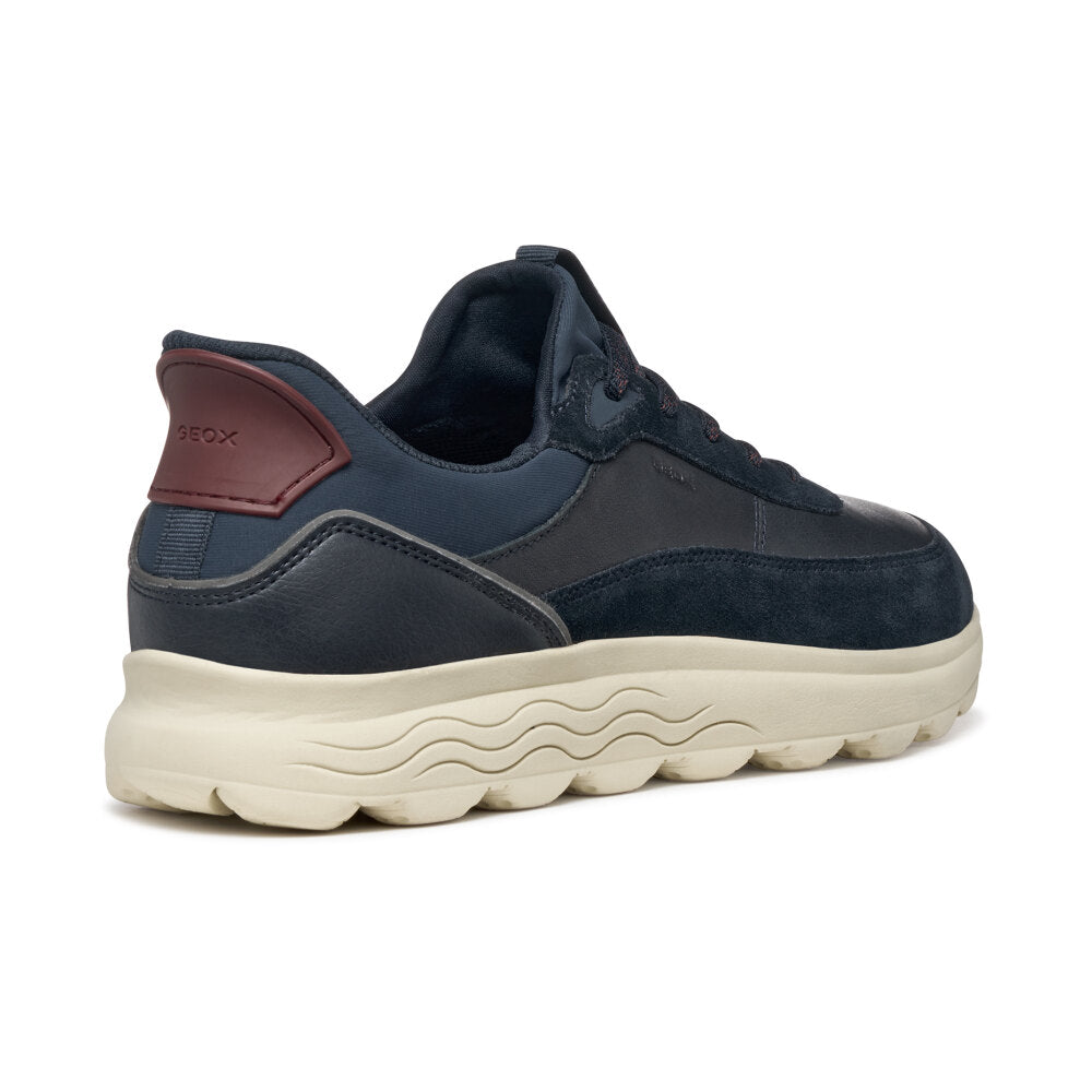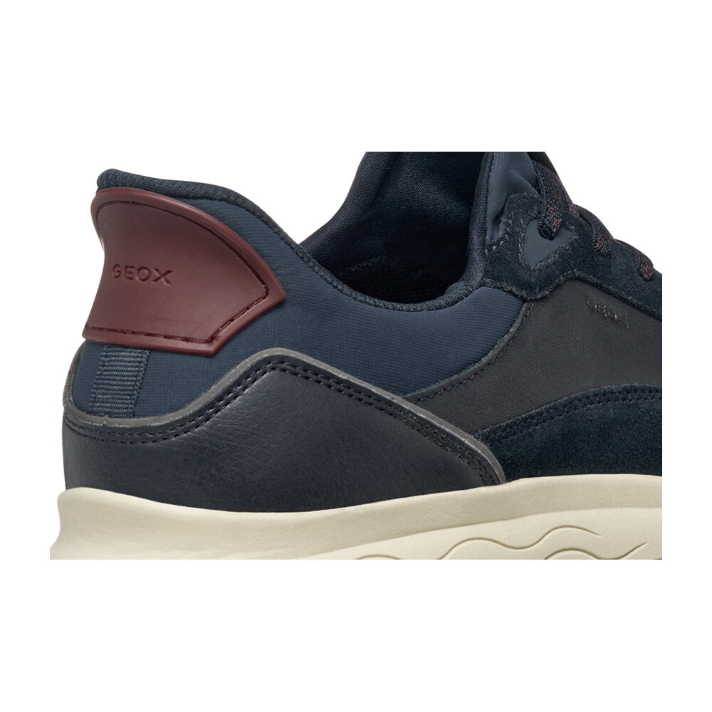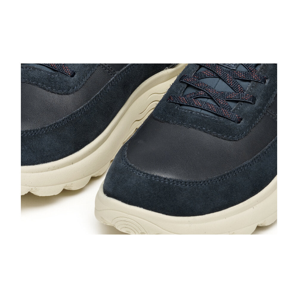 Zapatilla deportiva para hombre en tonos azul marino con detalles en granate. Combinación elegante de materiales: piel, serraje y tejido técnico, que aportan estilo y funcionalidad. La suela beige con ondas aporta un toque distintivo, mientras que el interior incorpora la tecnología transpirable patentada por Geox, ideal para el uso diario y las largas caminatas.
