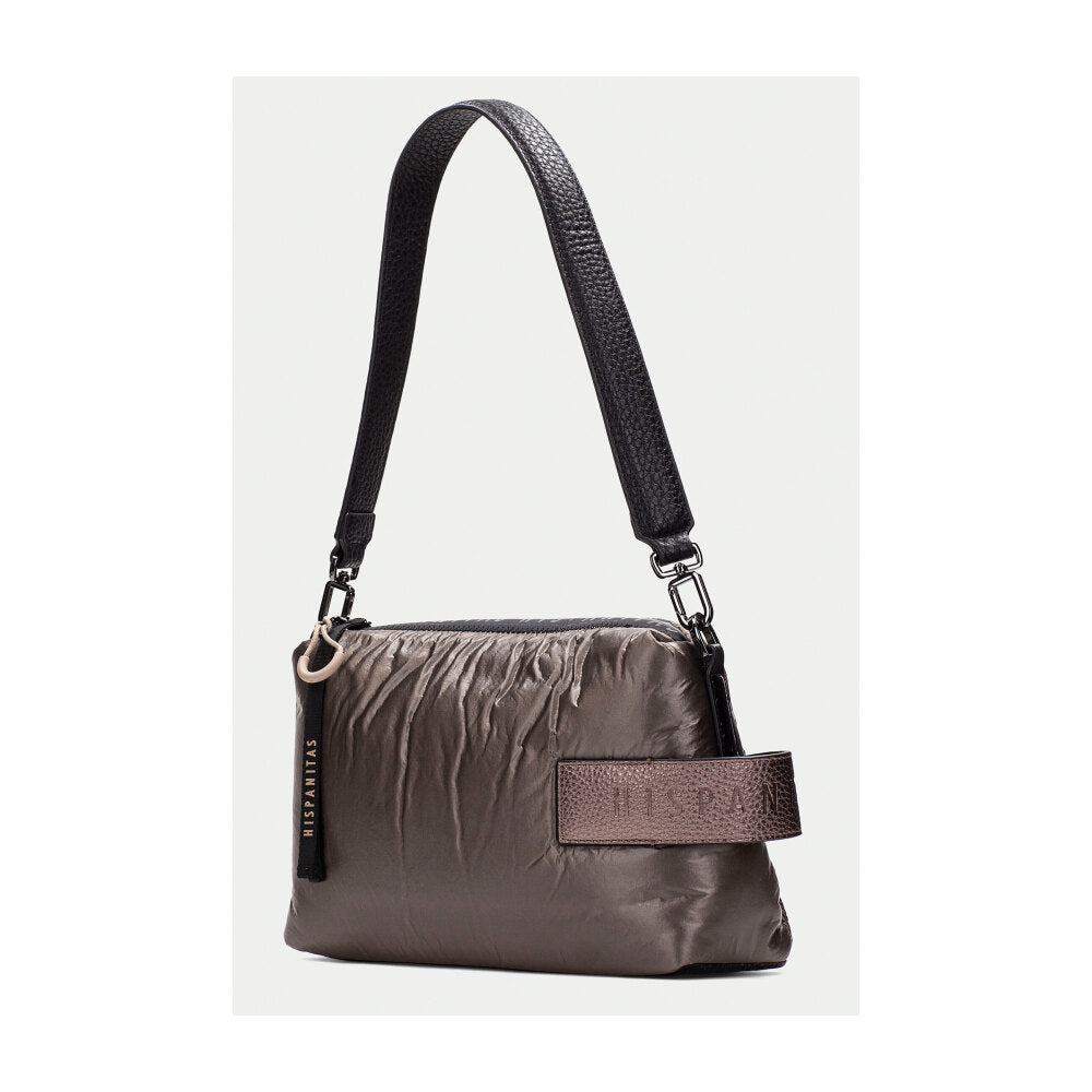 Bolso de hombro de la marca Hispanitas confeccionado en material sintético con acabado efecto acolchado en color gris metalizado, combinado con asa en símil piel negra texturizada. Presenta un diseño moderno y funcional, ideal para el día a día, con cierre de cremallera superior y detalle decorativo en el lateral con logotipo grabado sobre tira sintética. Dispone de asa desmontable con mosquetones metálicos que permite llevarlo cómodamente al hombro o cruzado. Ligero, práctico y con gran estilo, es perfecto para complementar looks urbanos con un toque contemporáneo. Fabricado con materiales sintéticos de alta calidad, respetuosos con los animales.