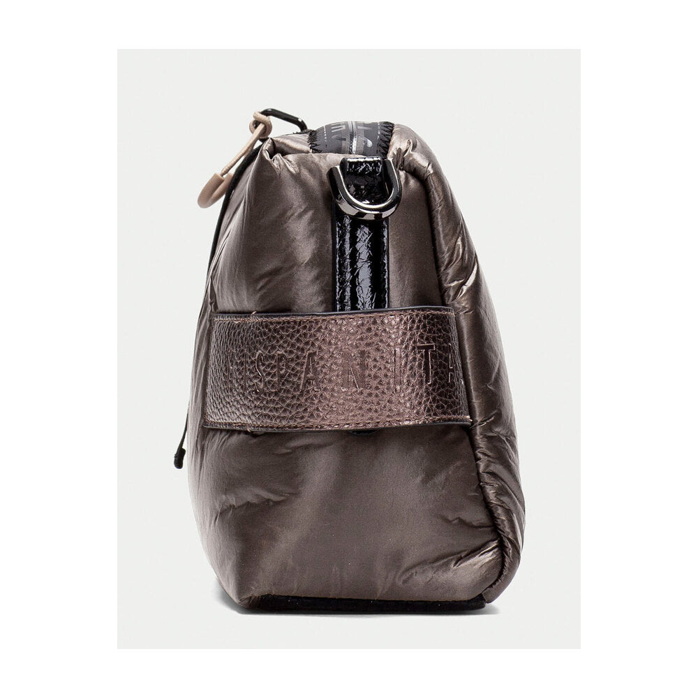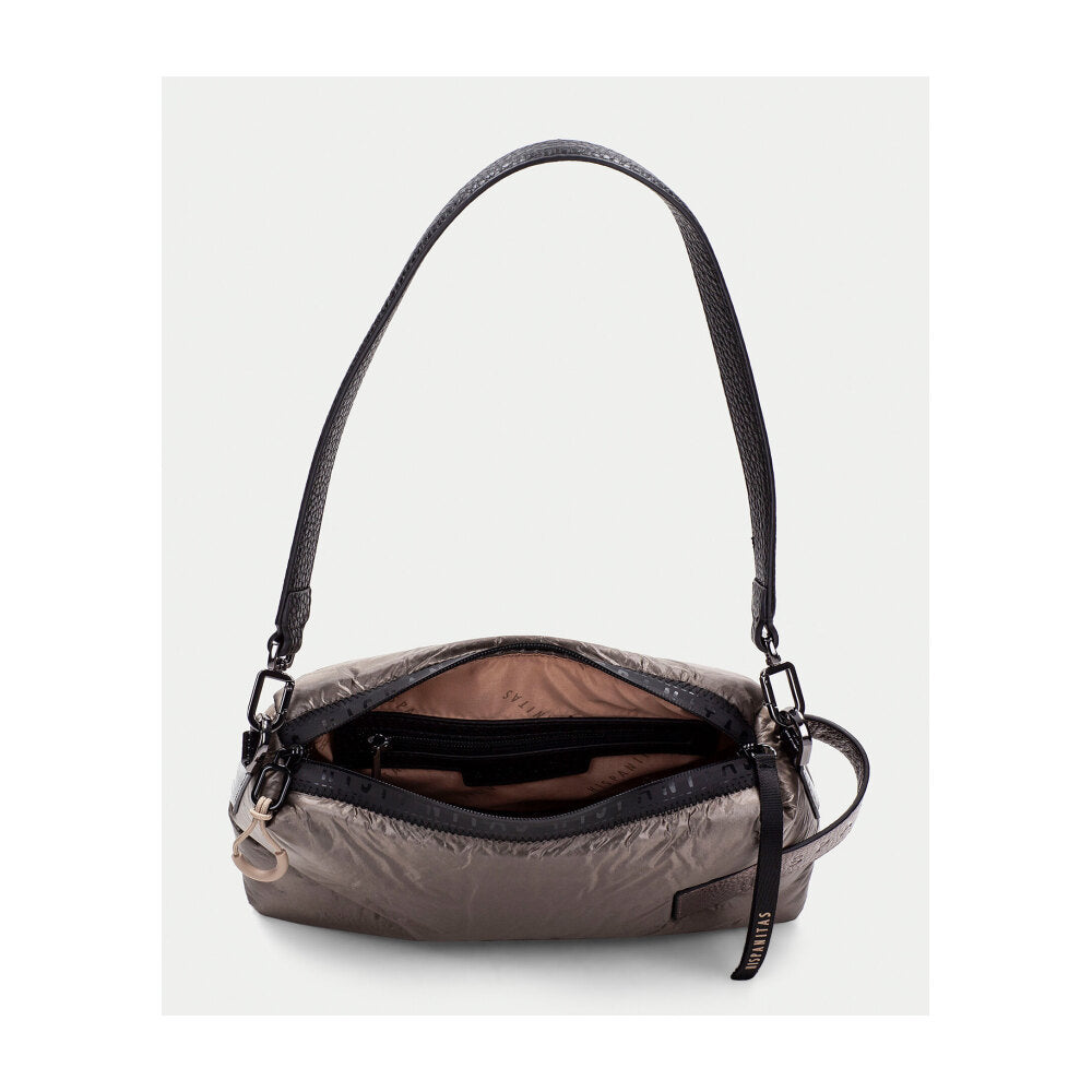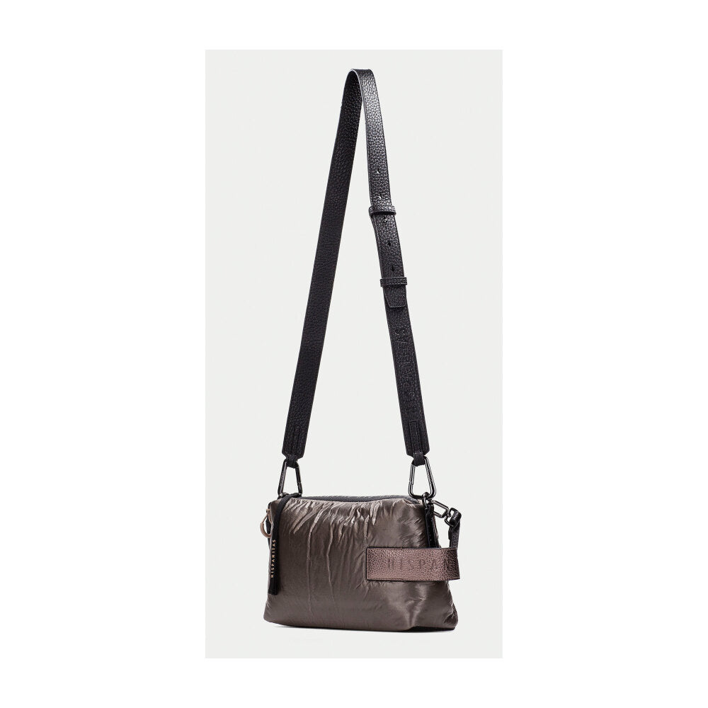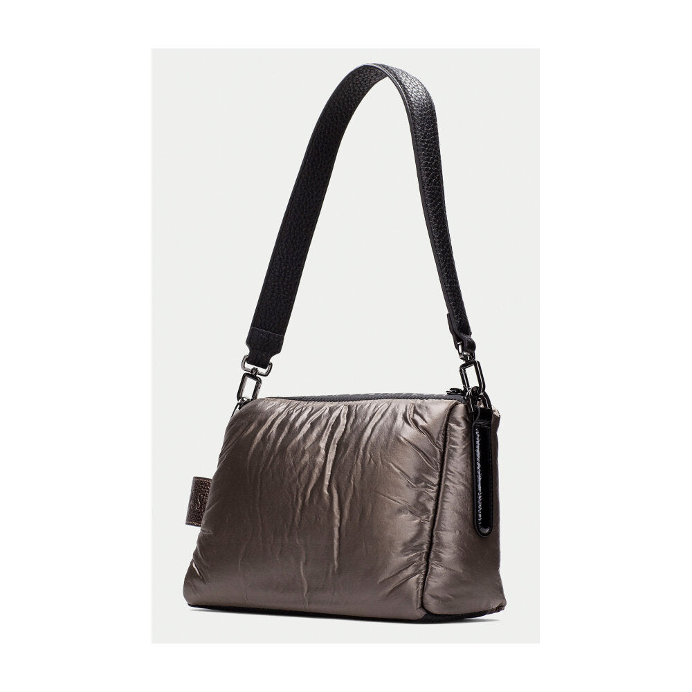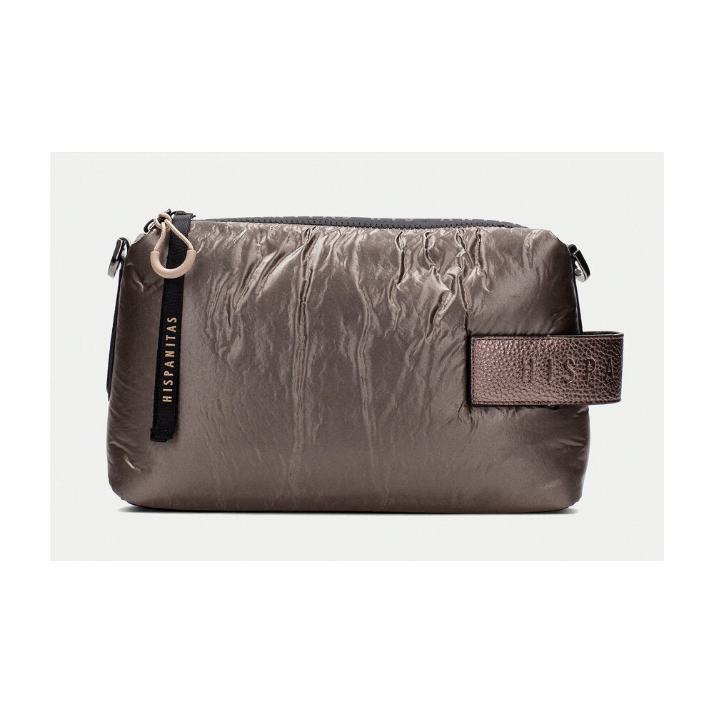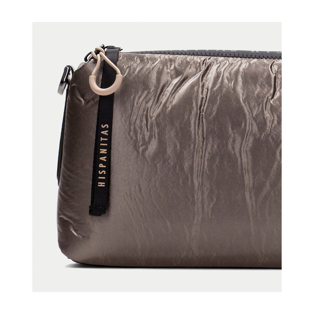 Bolso de hombro de la marca Hispanitas confeccionado en material sintético con acabado efecto acolchado en color gris metalizado, combinado con asa en símil piel negra texturizada. Presenta un diseño moderno y funcional, ideal para el día a día, con cierre de cremallera superior y detalle decorativo en el lateral con logotipo grabado sobre tira sintética. Dispone de asa desmontable con mosquetones metálicos que permite llevarlo cómodamente al hombro o cruzado. Ligero, práctico y con gran estilo, es perfecto para complementar looks urbanos con un toque contemporáneo. Fabricado con materiales sintéticos de alta calidad, respetuosos con los animales.