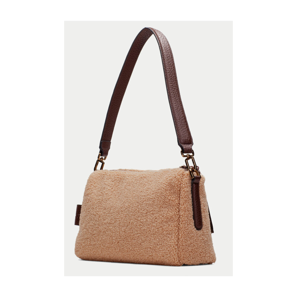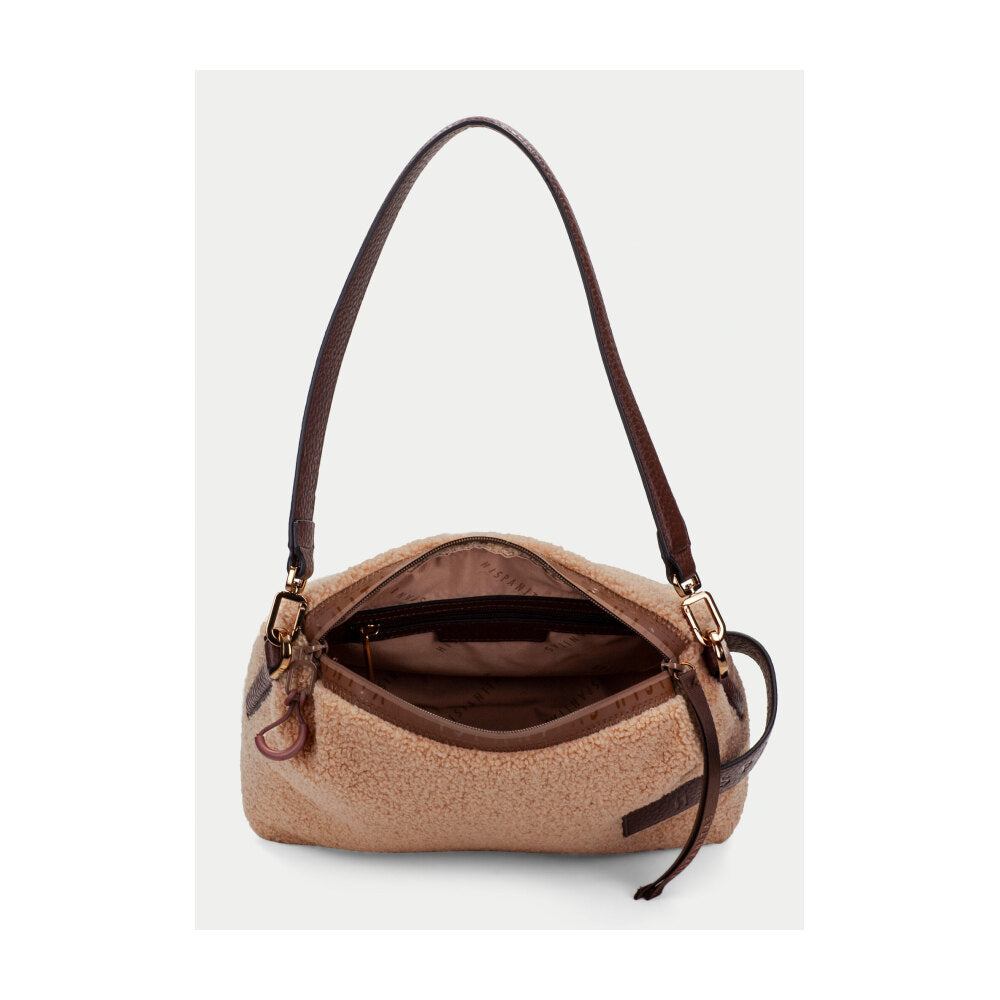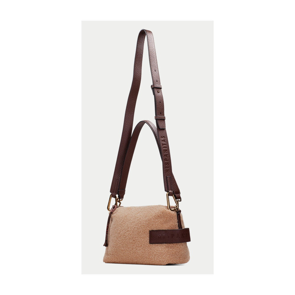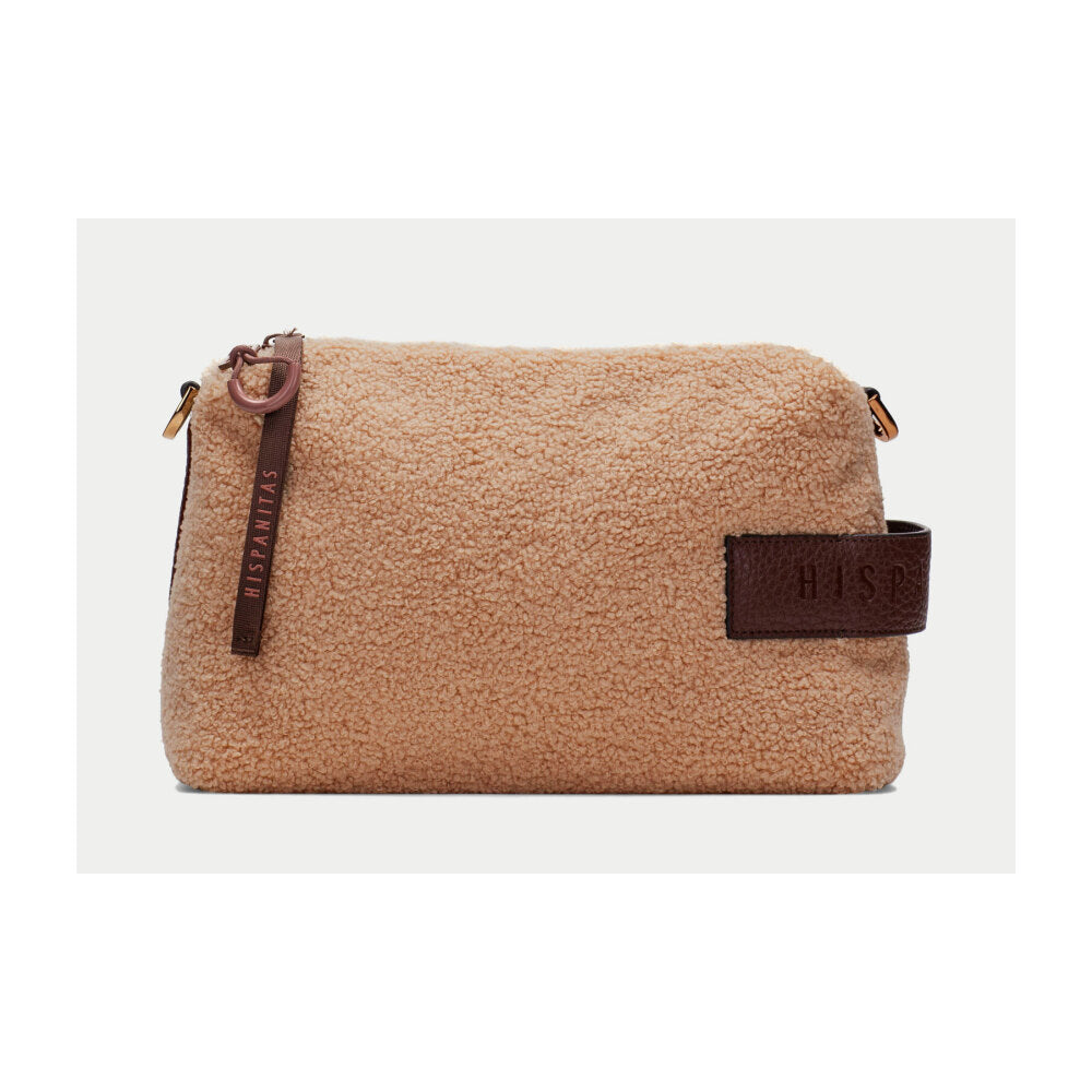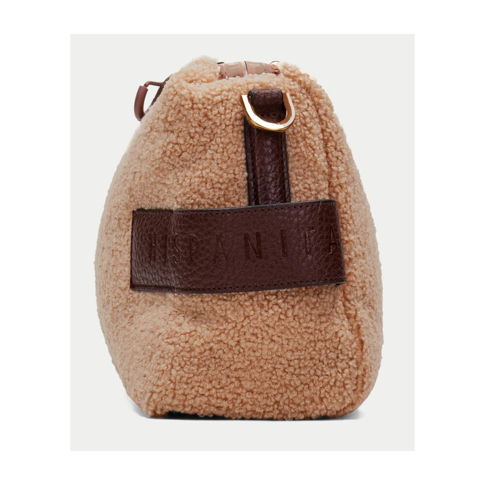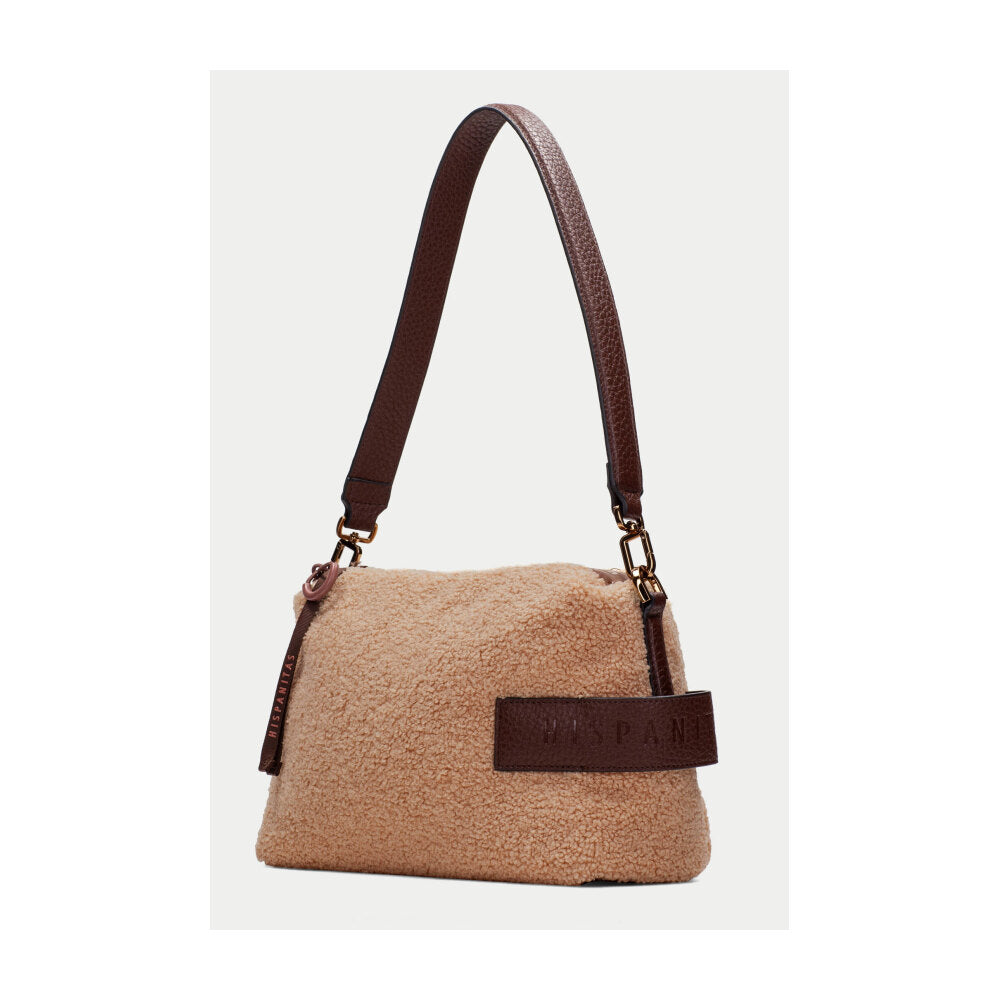 Original bolso de Hispanitas que combina tejido tipo borreguito en tono beige con detalles y asa en  marrón chocolate. Su diseño cálido y acogedor es ideal para los meses de otoño e invierno. Con cierre superior de cremallera, etiqueta grabada y un formato cómodo para el uso diario. Perfecto para quienes buscan un complemento con personalidad, tacto suave y estilo contemporáneo.