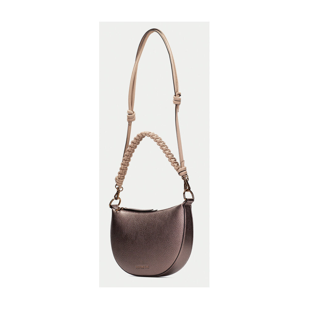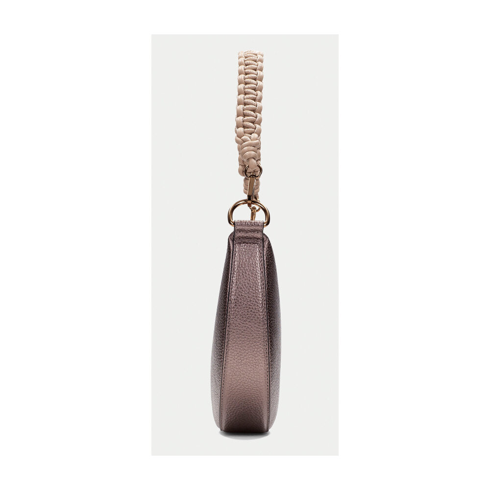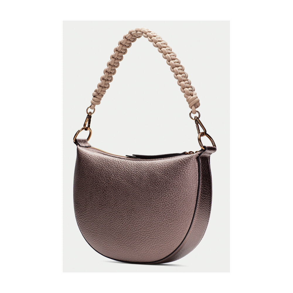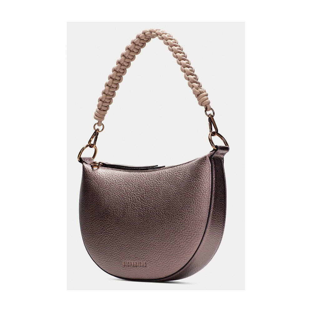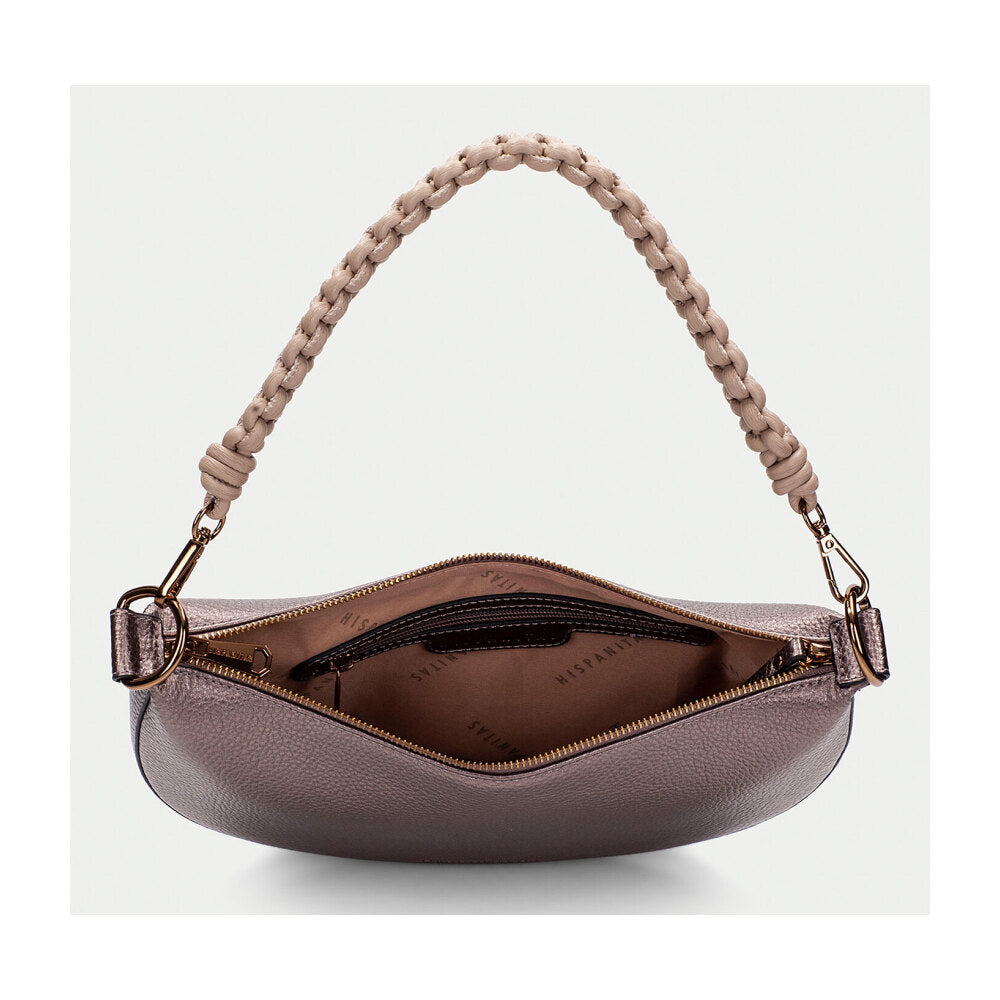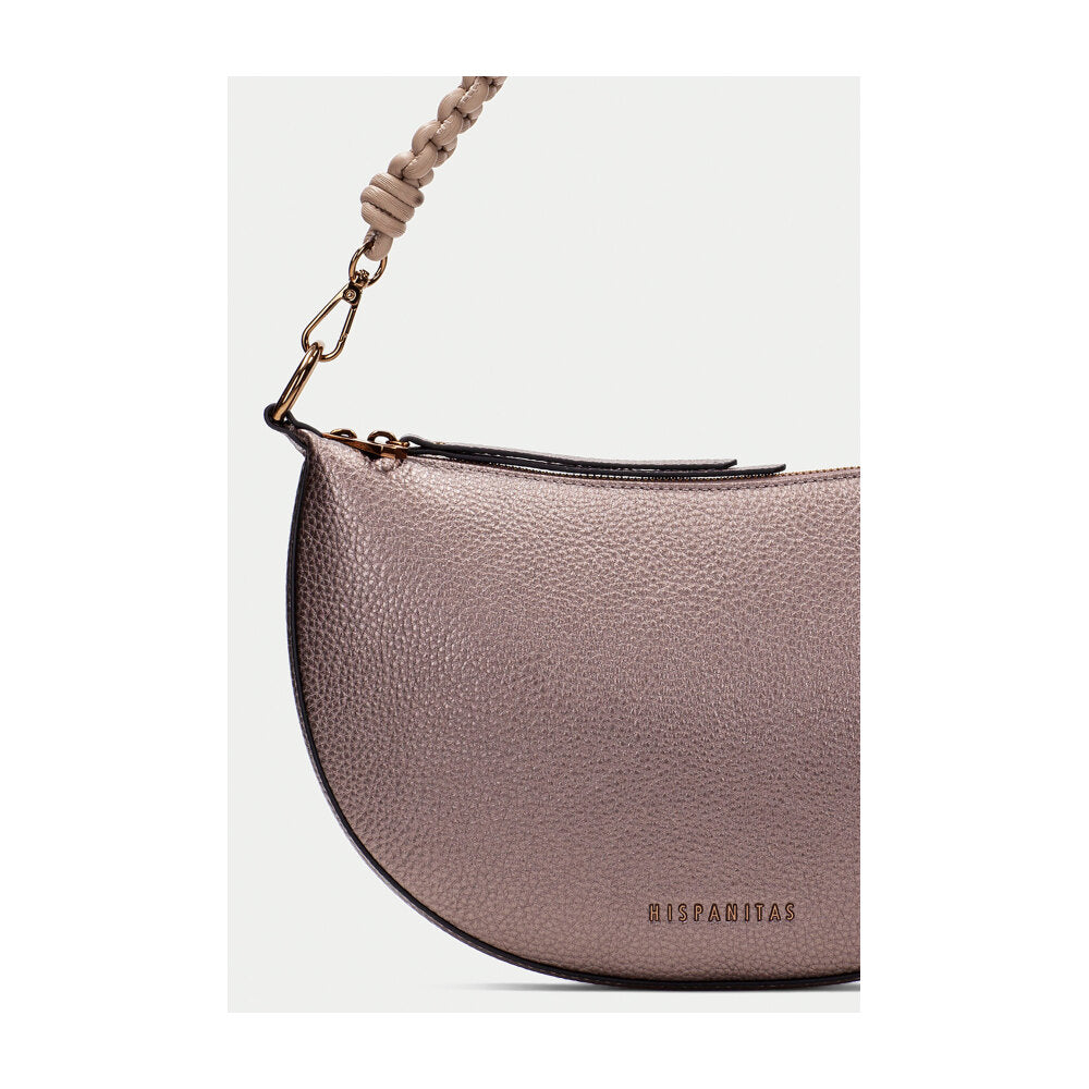 Bolso tipo hobo de la firma Hispanitas en acabado rosa metalizado con textura granulada. Su diseño semicircular y compacto se complementa con un asa corta en cordón trenzado beige, desmontable mediante mosquetones dorados. La cremallera superior mantiene el interior seguro, mientras que su diseño sofisticado pero versátil lo convierte en un complemento ideal tanto para el día como para la noche. El contraste entre el cuerpo brillante y el asa natural le otorgan un aire contemporáneo y artesanal a la vez.