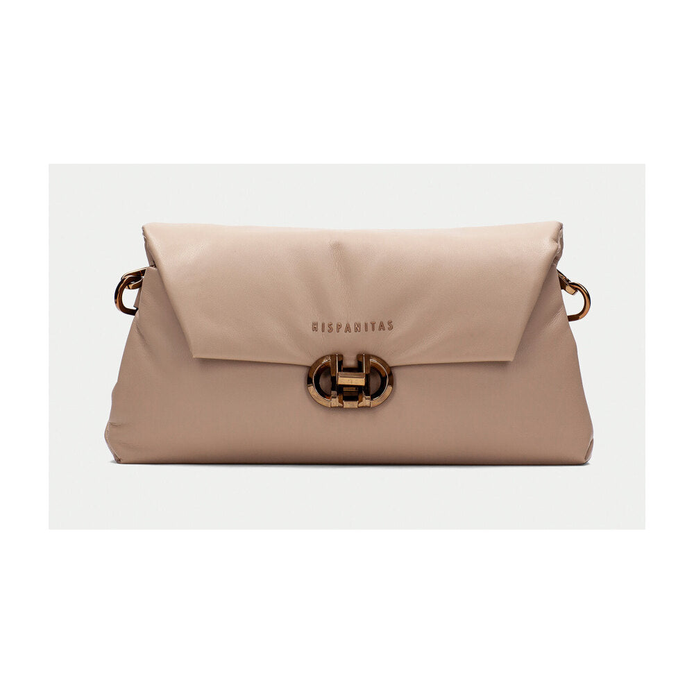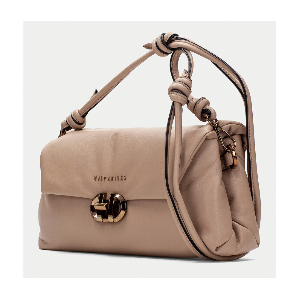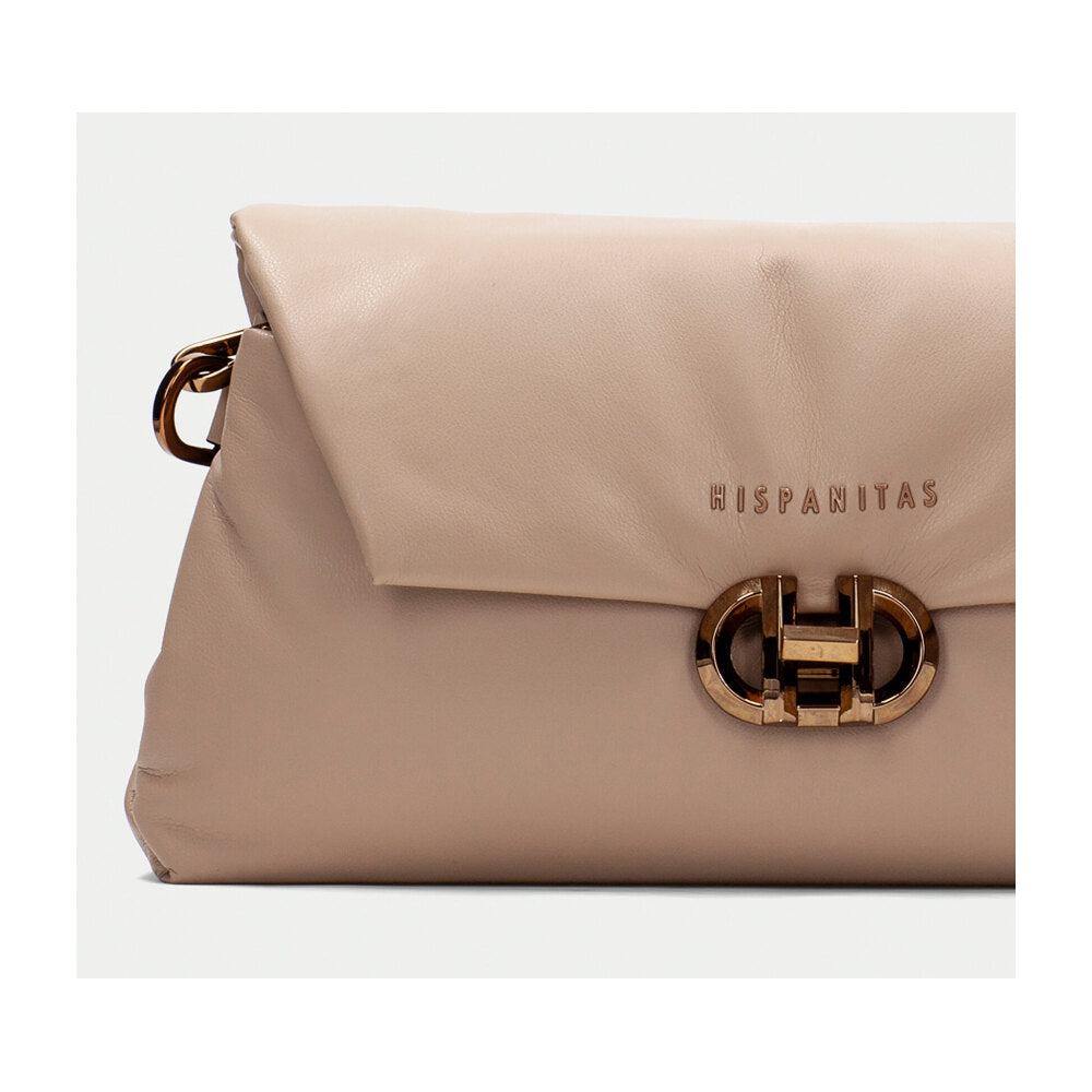 Bolso acolchado de piel en color beige claro de la marca Hispanitas. Su diseño moderno incorpora un cierre giratorio metálico dorado con el logo de la marca, asa regulable con detalles anudados y acabados suaves al tacto. Ideal tanto para looks de día como para salidas más formales. Su interior espacioso y su estética minimalista lo convierten en un accesorio versátil y sofisticado para cualquier ocasión.