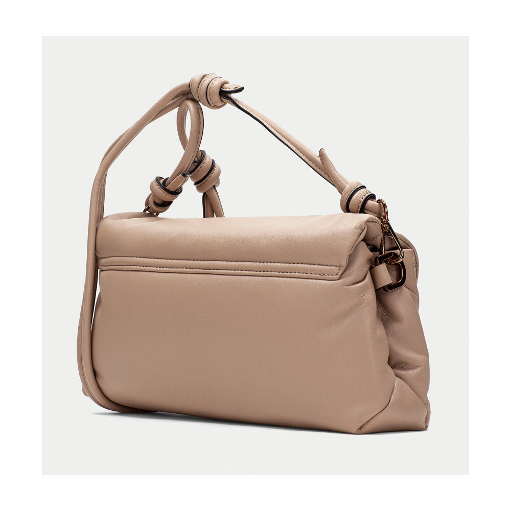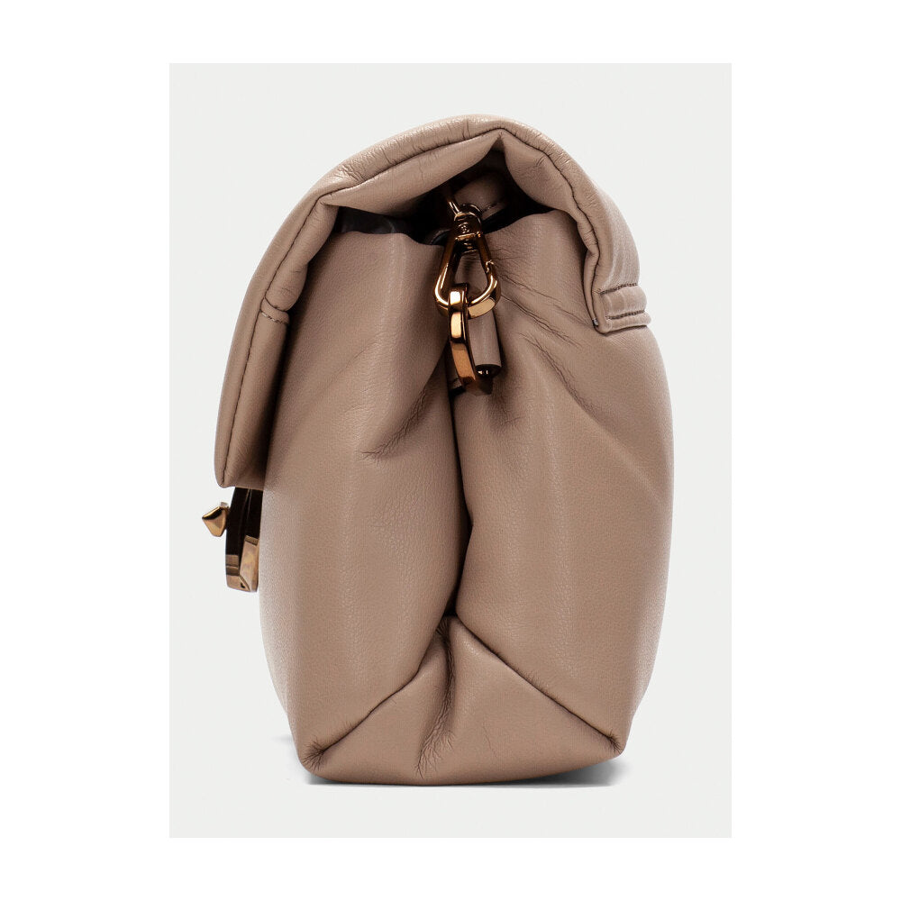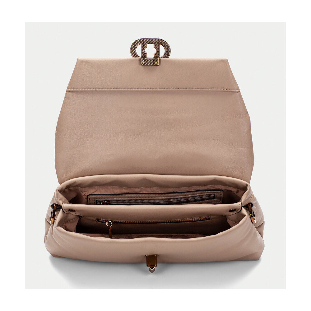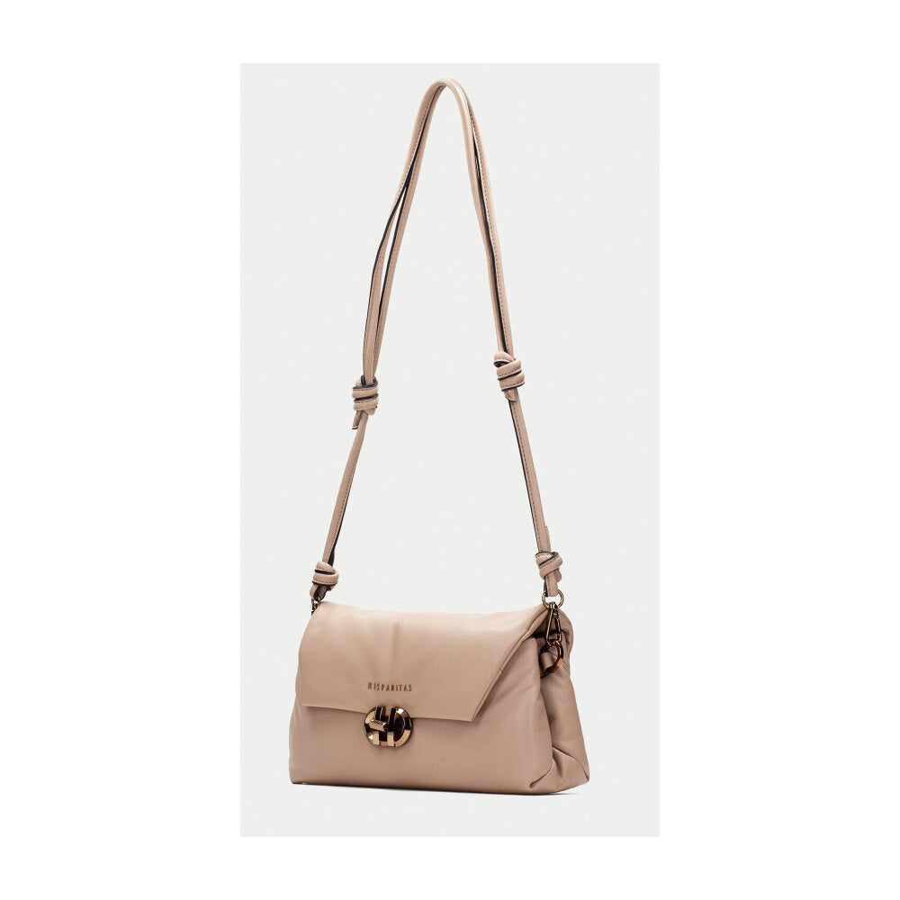 Bolso acolchado de piel en color beige claro de la marca Hispanitas. Su diseño moderno incorpora un cierre giratorio metálico dorado con el logo de la marca, asa regulable con detalles anudados y acabados suaves al tacto. Ideal tanto para looks de día como para salidas más formales. Su interior espacioso y su estética minimalista lo convierten en un accesorio versátil y sofisticado para cualquier ocasión.