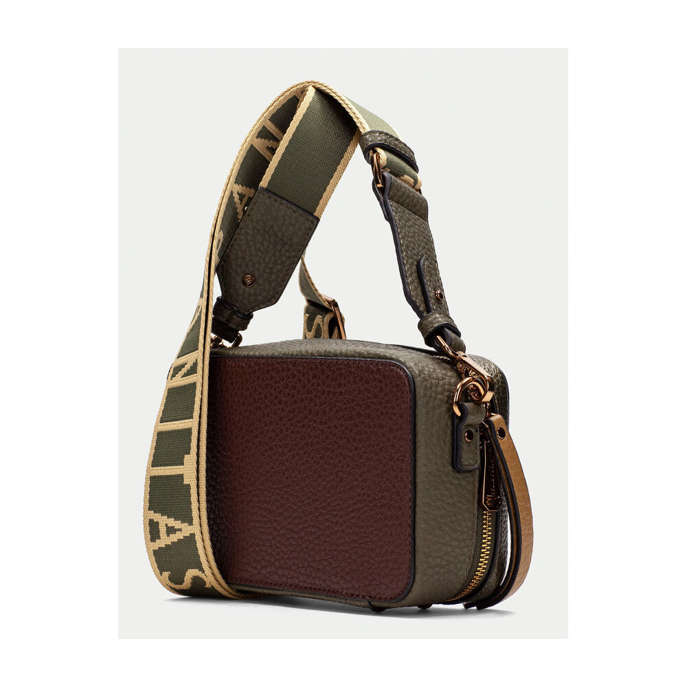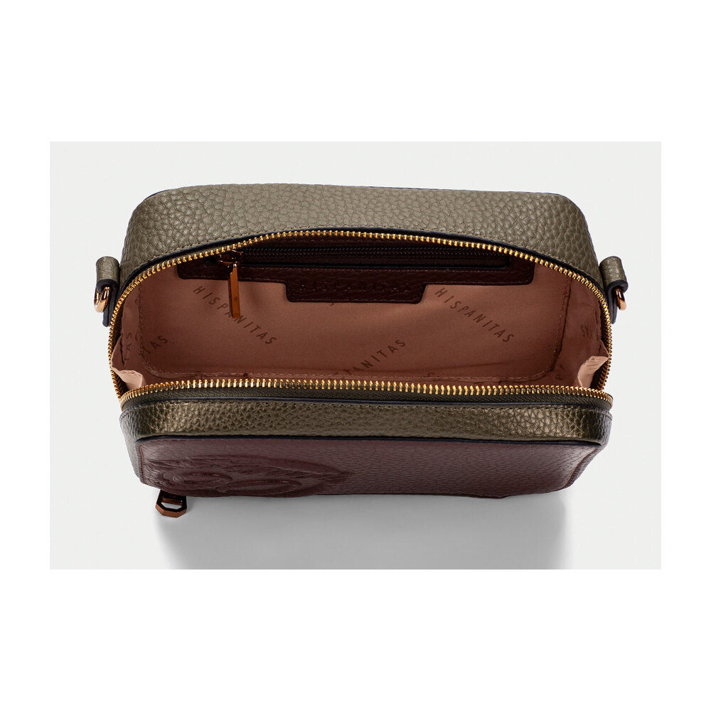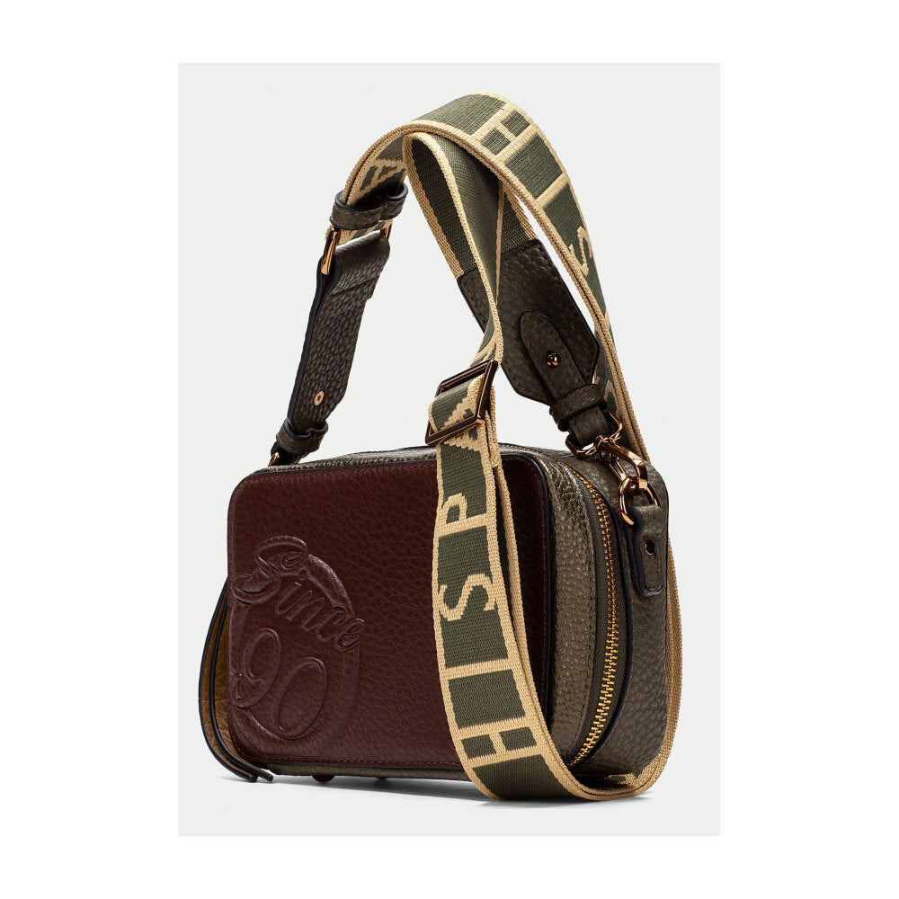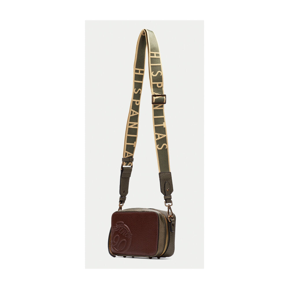 Bolso bandolera compacto de Hispanitas en una elegante combinación de marrón chocolate y verde oliva con textura granulada. El diseño destaca por su frontal con el grabado en relieve “Since 90” que aporta personalidad y estilo. Incluye una correa ancha ajustable en tonos caqui y beige con el logo HISPANITAS integrado, ideal para llevar al hombro o cruzado. Su estructura rígida y sus compartimentos interiores con cremallera permiten una organización práctica sin renunciar al diseño. Perfecto para el día a día o escapadas urbanas con un toque sofisticado.