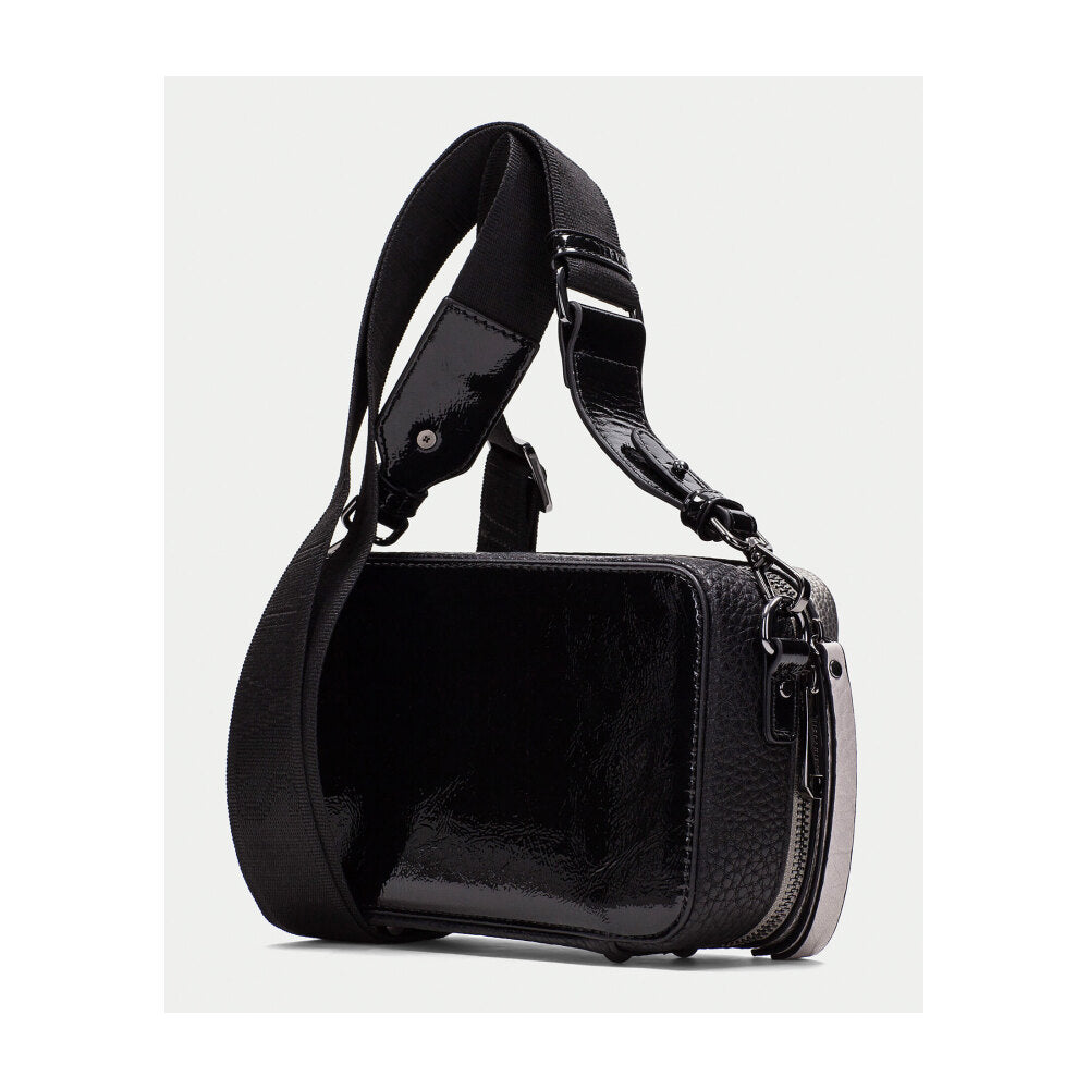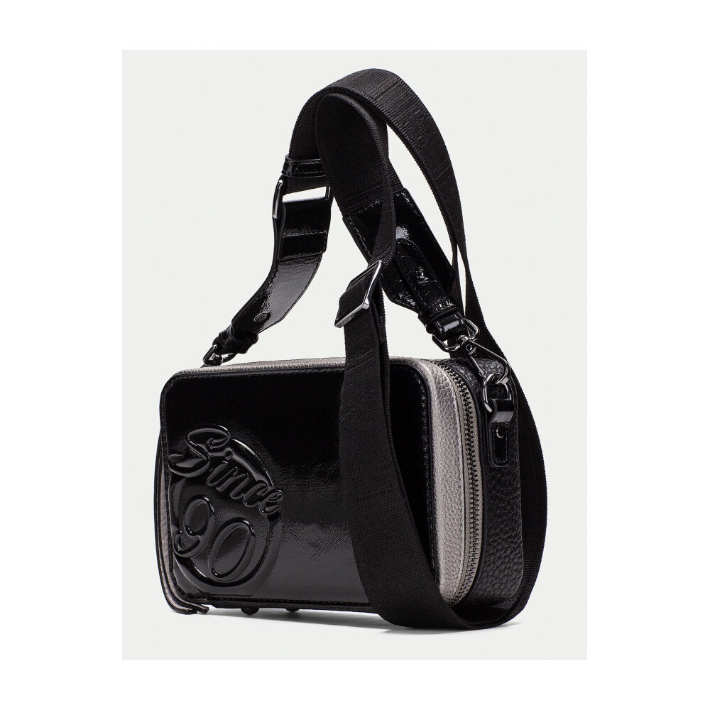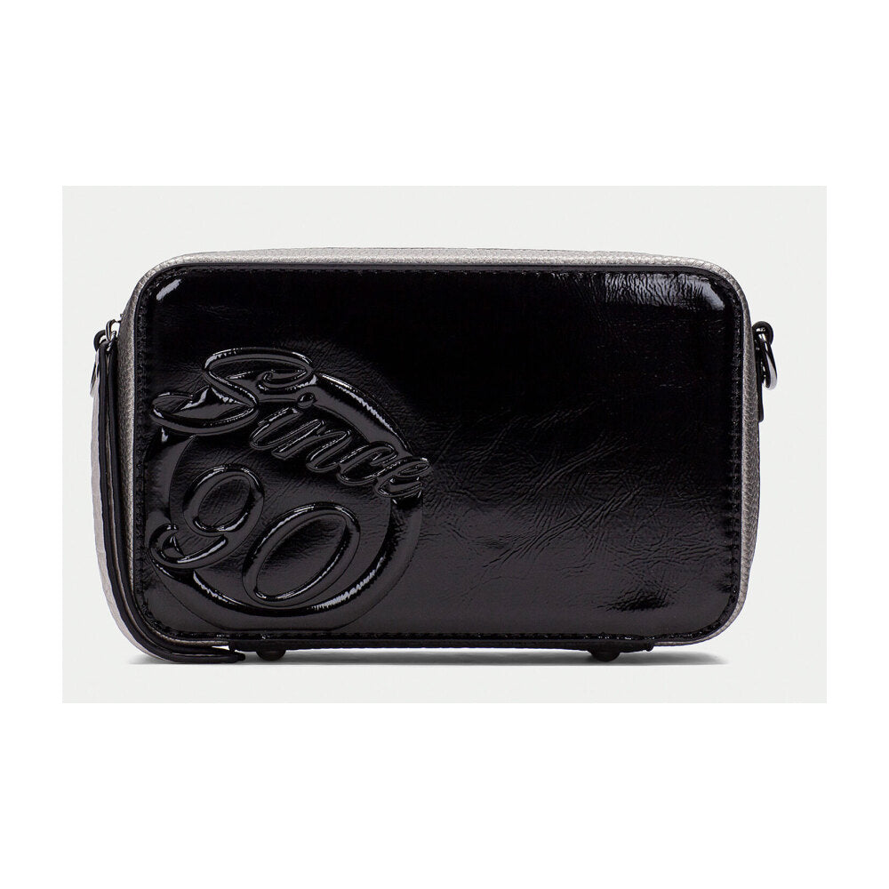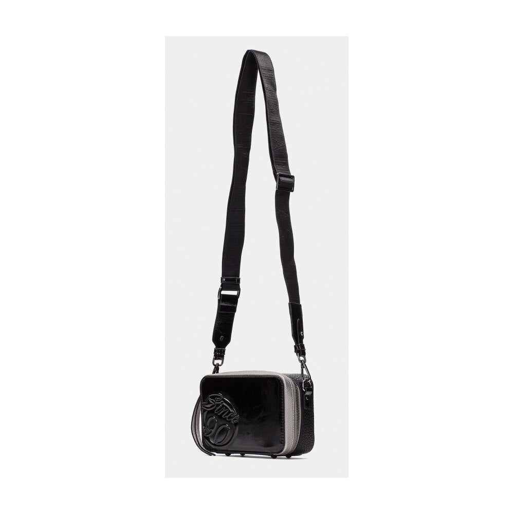 Bolso bandolera compacto de la marca Hispanitas en elegante acabado negro charolado con textura brillante y detalles en relieve. El frontal presenta el distintivo grabado “Since 90” en el mismo tono, aportando sofisticación y carácter al diseño. Incluye una correa ancha ajustable con detalles en negro a juego que permite llevarlo cómodamente al hombro o cruzado. Dispone de cierre con cremallera, estructura rígida que mantiene la forma y varios compartimentos interiores que facilitan la organización. Un accesorio versátil ideal tanto para looks urbanos como para estilismos de noche.