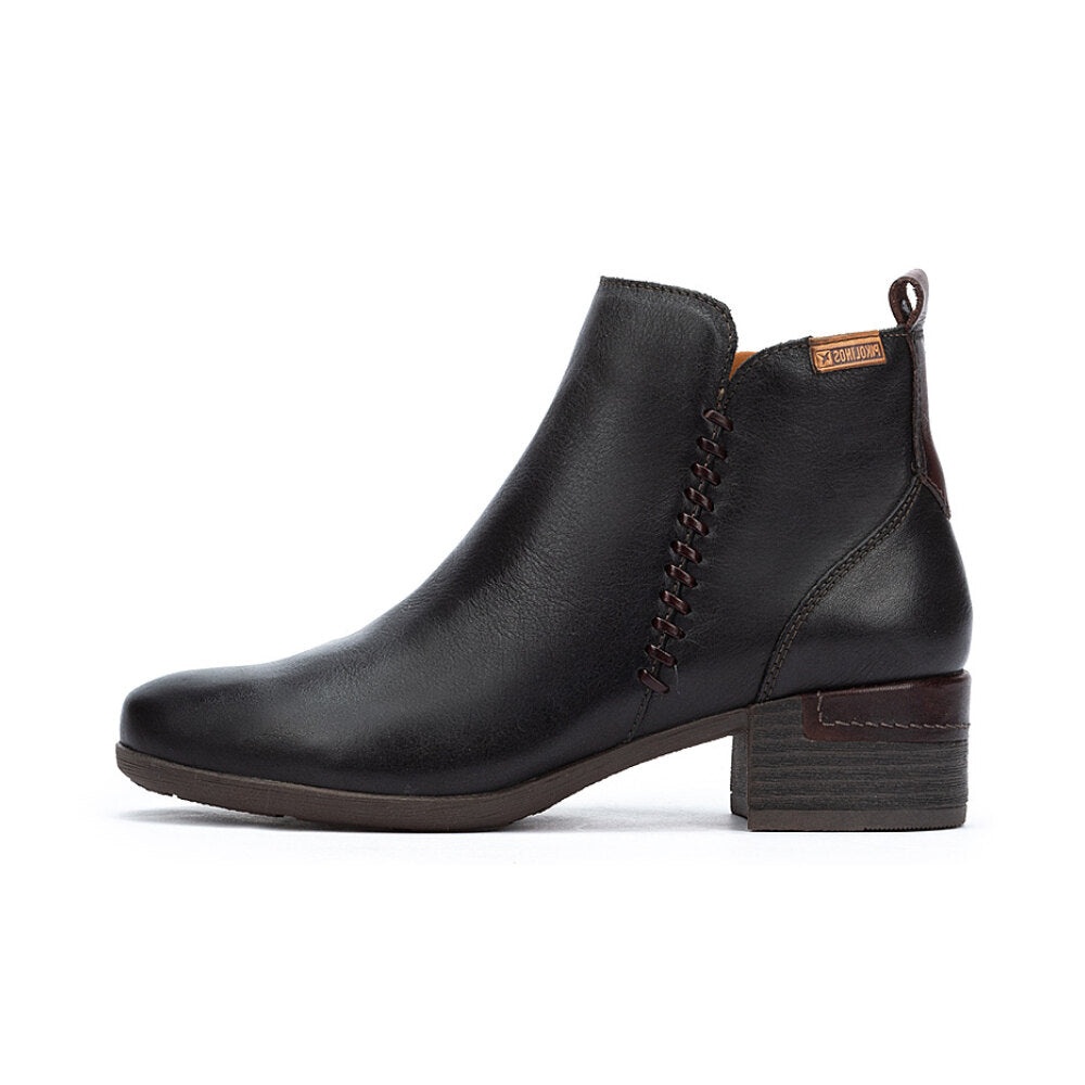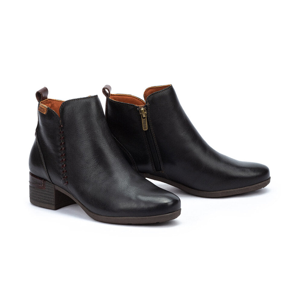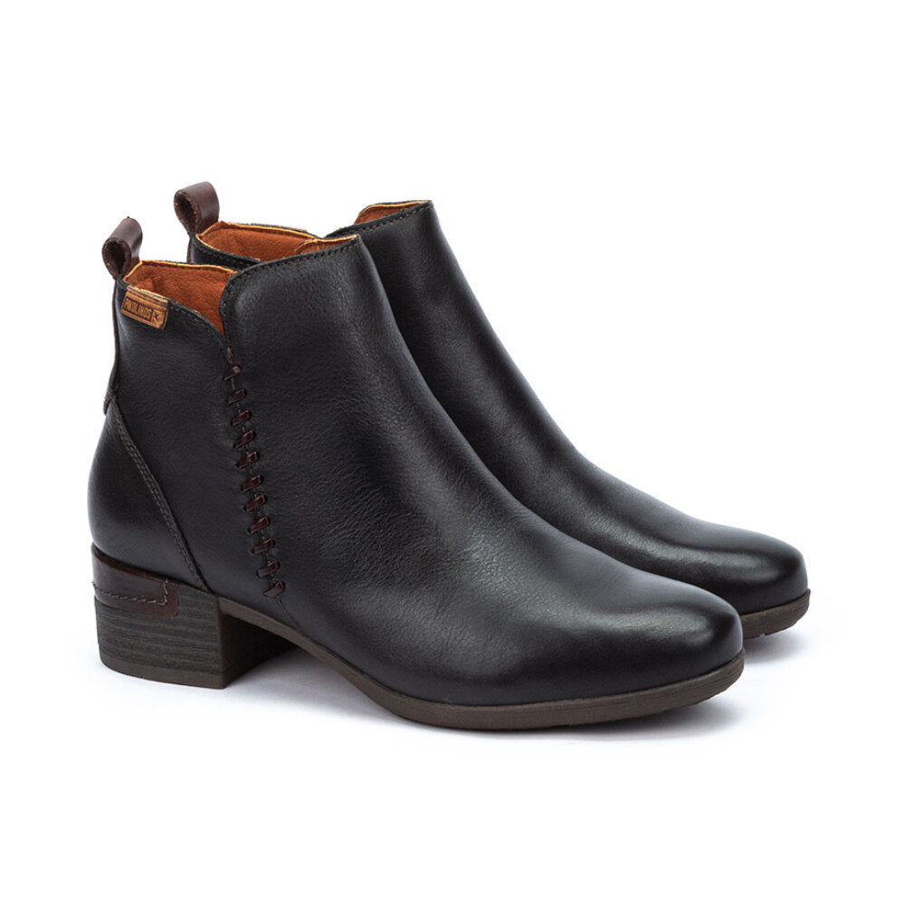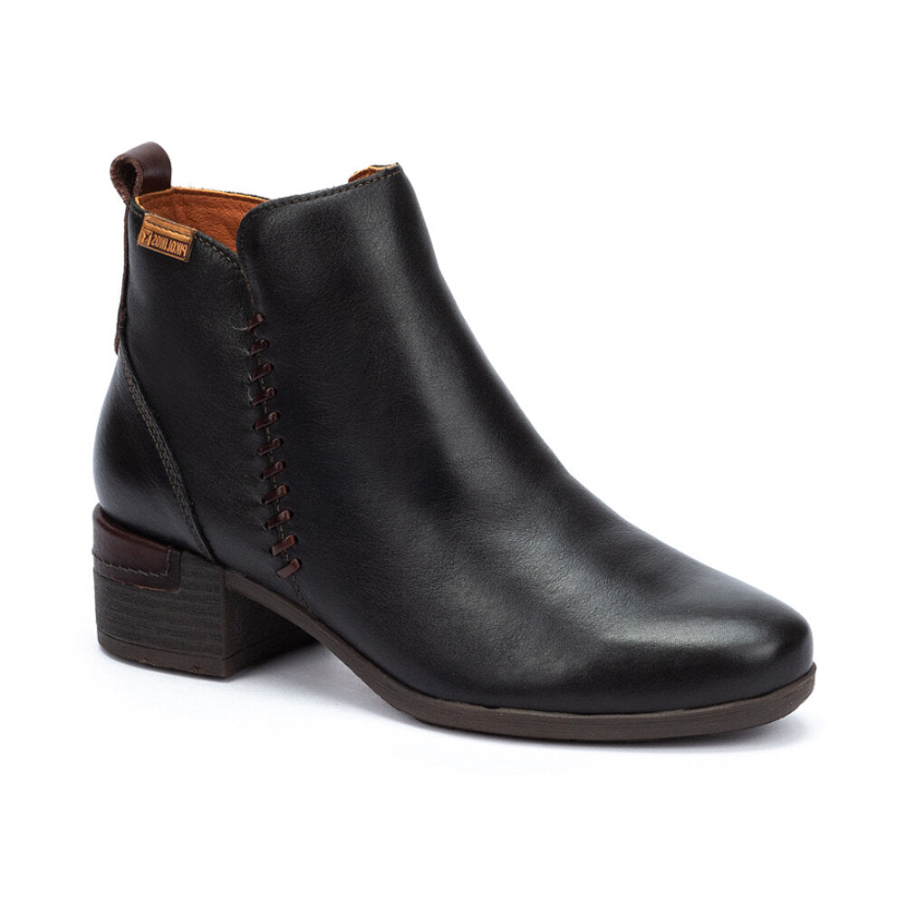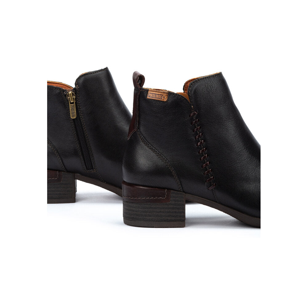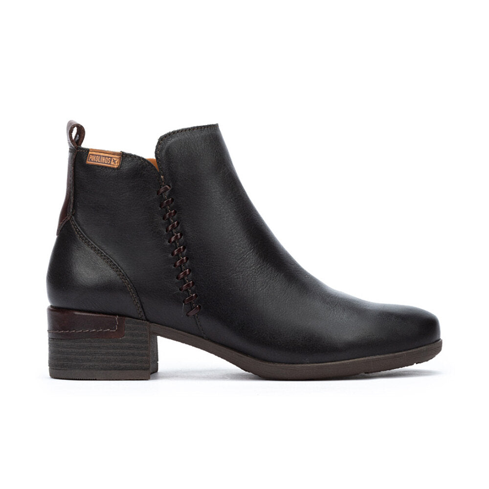 Botín para mujer en piel negra suave con un detalle decorativo de costura lateral que aporta un toque original y elegante. Incluye tirador trasero para facilitar el calce.