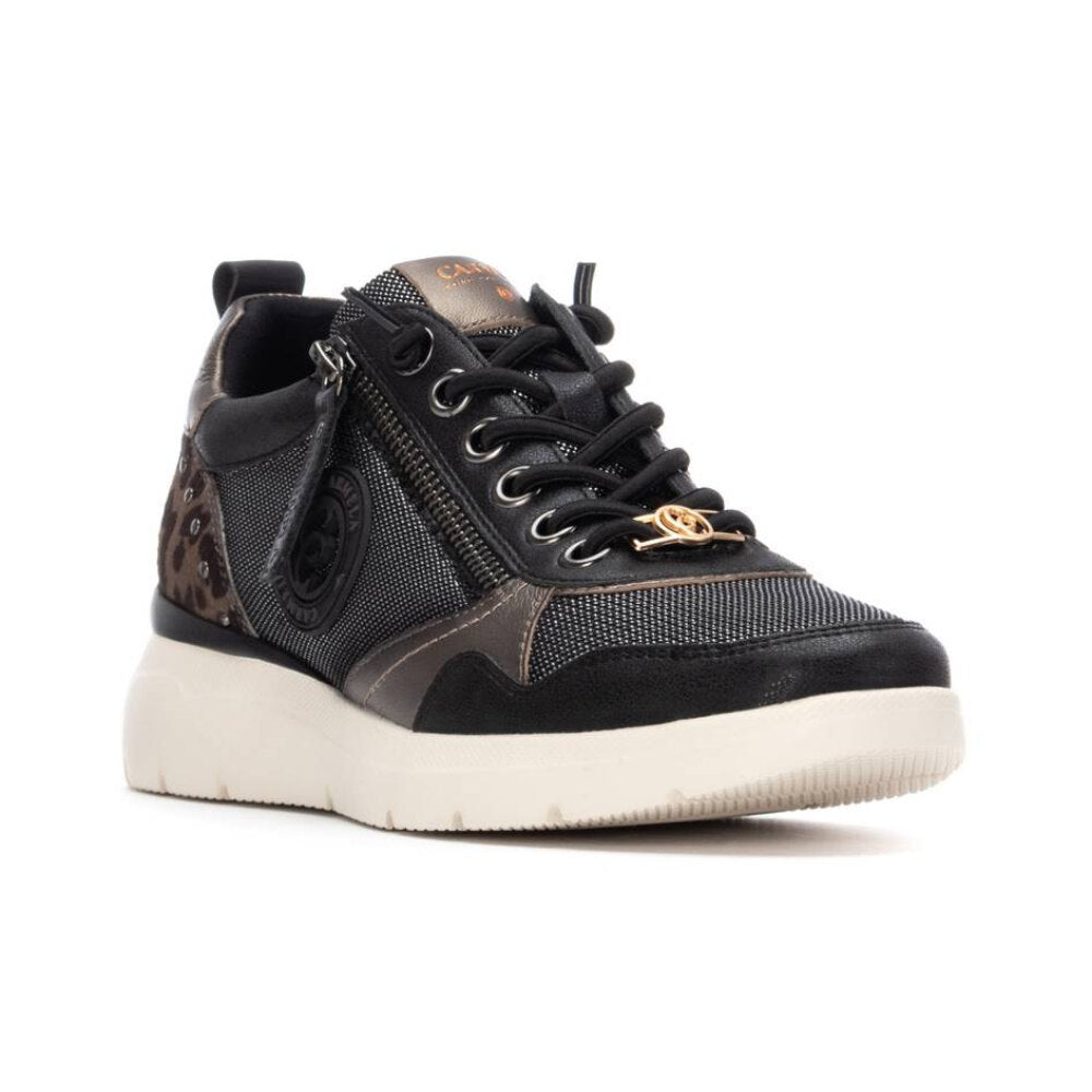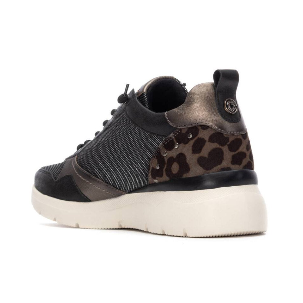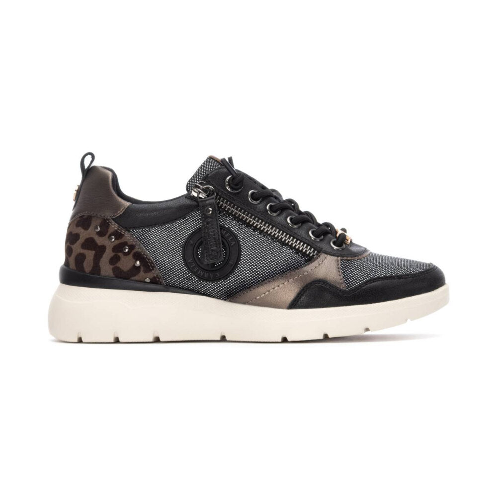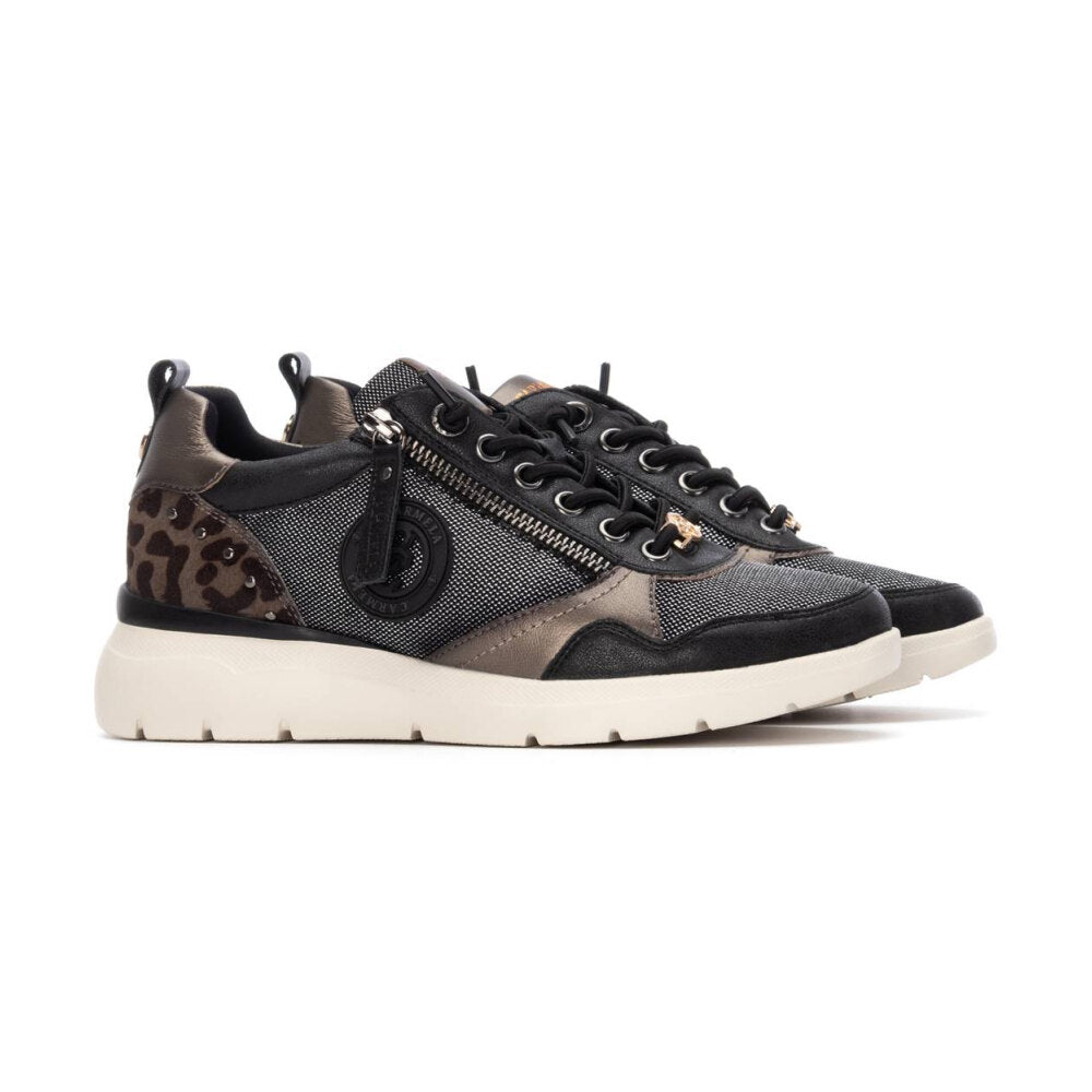 zapatilla de mujer estilo casual en tonos negros y metalizados, con tejido técnico combinado y detalles en charol y serraje. incorpora cremallera lateral funcional y parche decorativo en el lateral. destaca por el talón con estampado animal print y pequeños tachuelas metálicas. suela blanca ligera y cómoda para uso diario.
