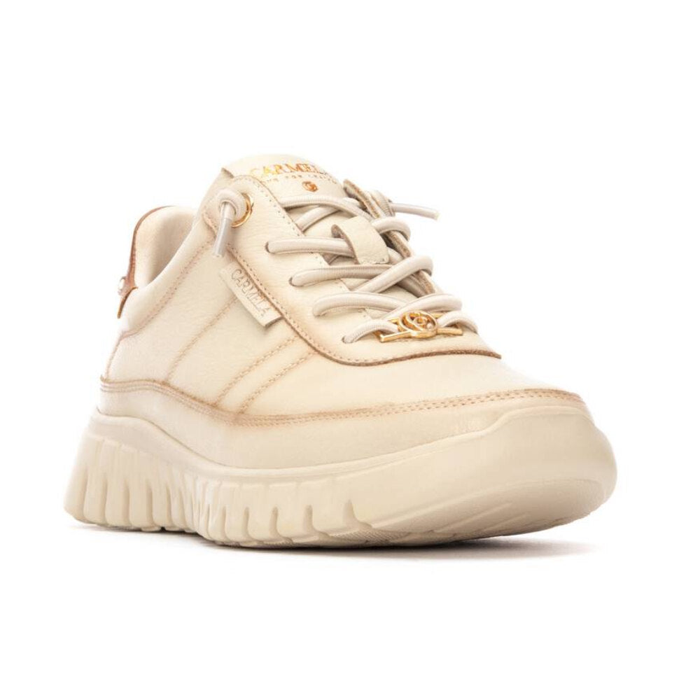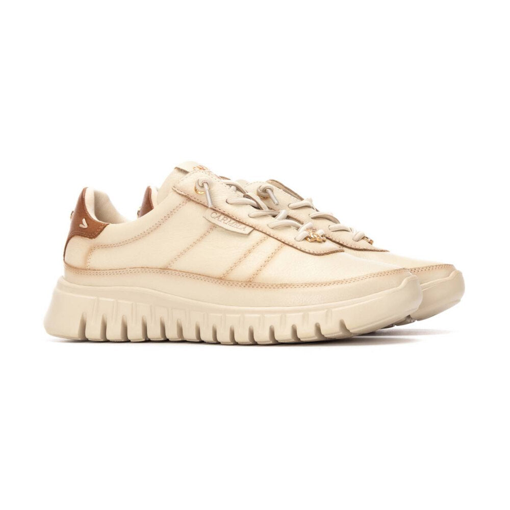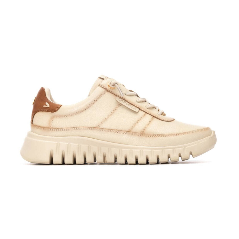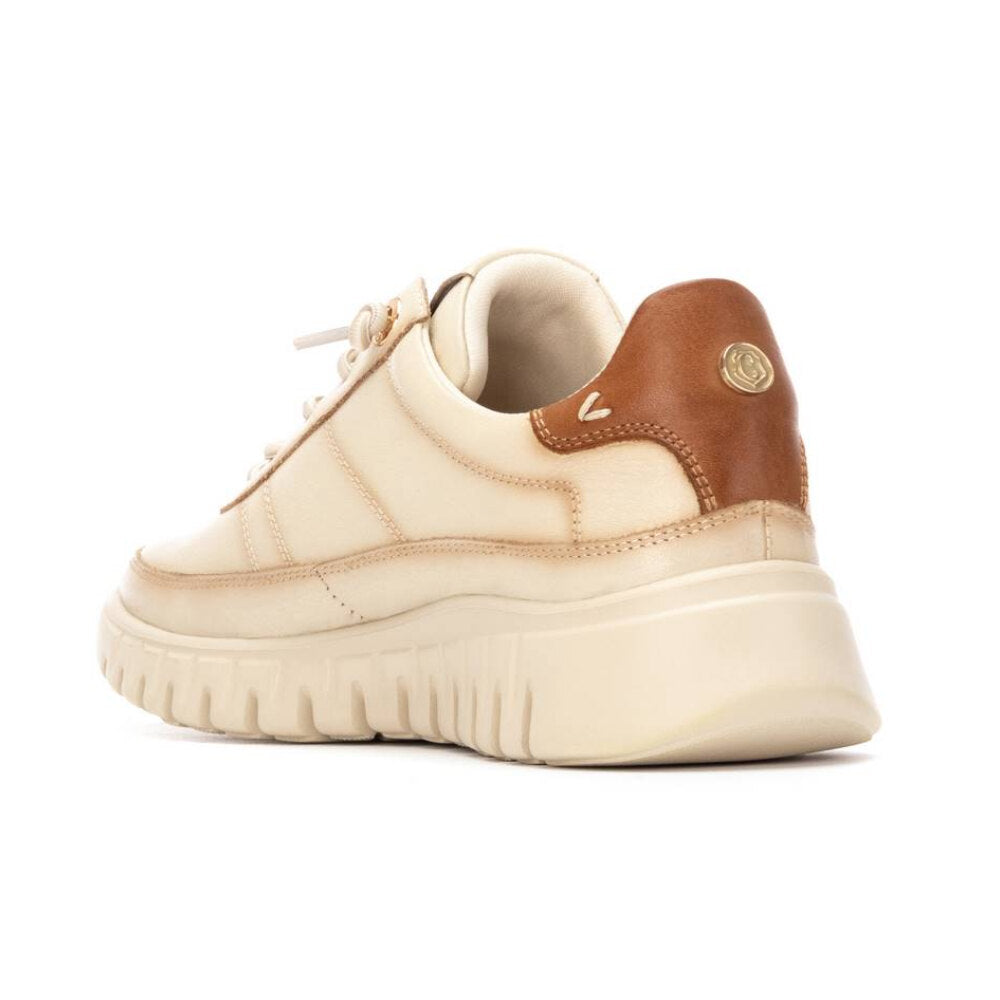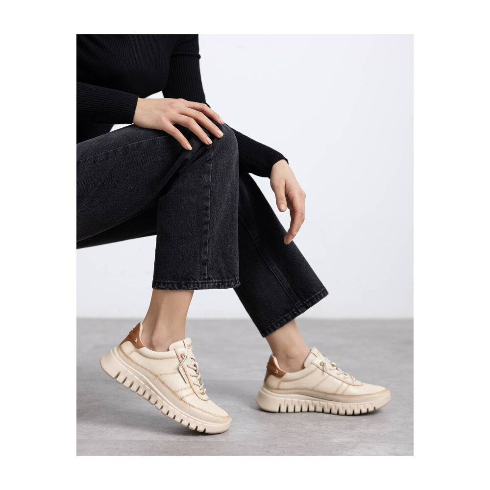 zapatilla de mujer en tono beige claro con detalles en contraste marrón claro en el talón. confeccionada en piel suave y transpirable, presenta suela dentada oversize para mayor estilo y amortiguación. diseño versátil y urbano, ideal para combinar con looks casuales o sport chic. cierre con cordones y lengüeta con detalle de marca.
