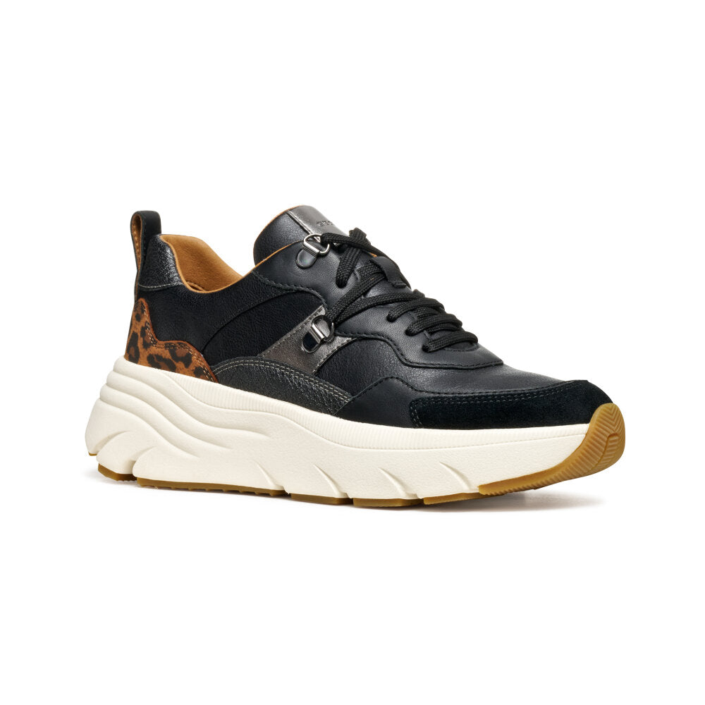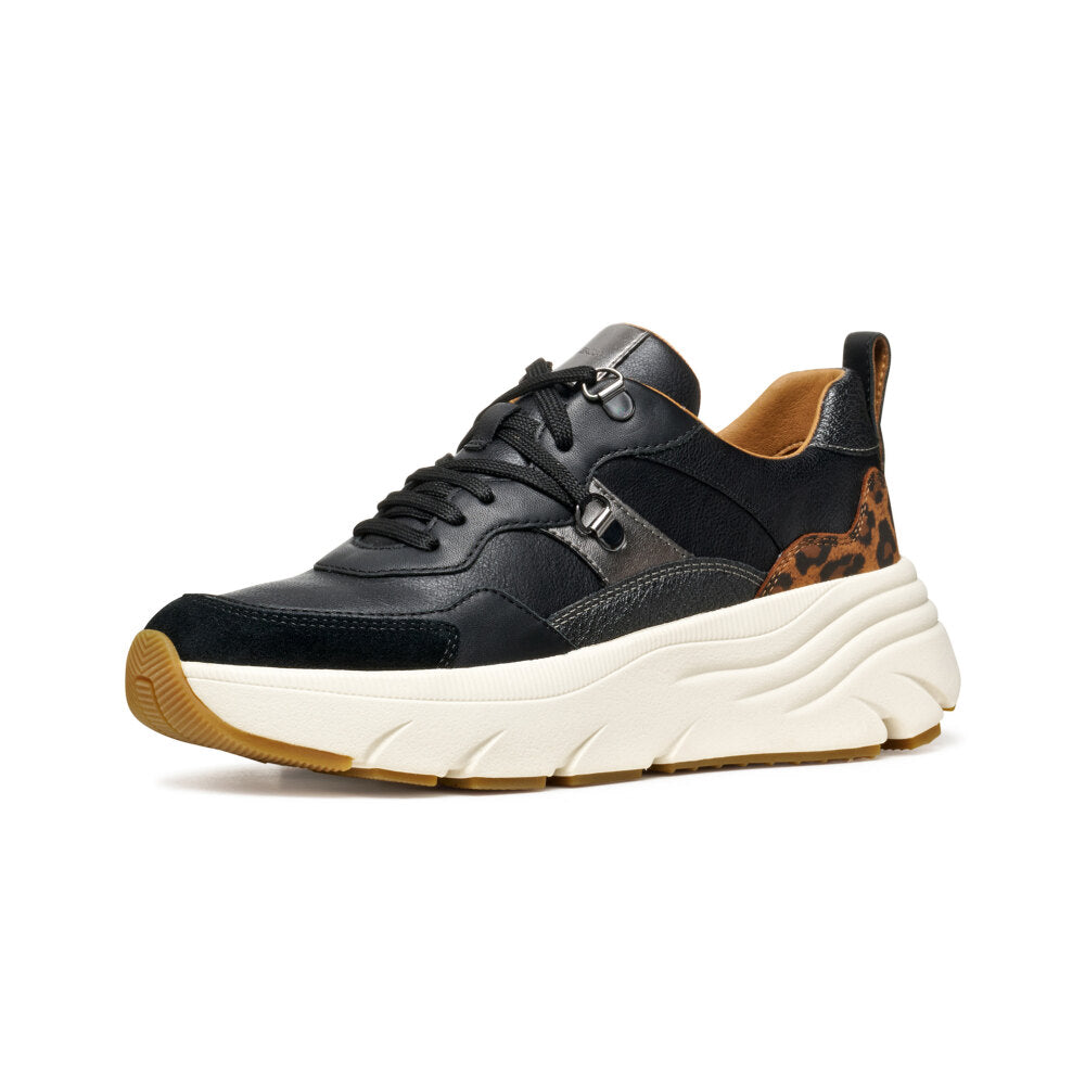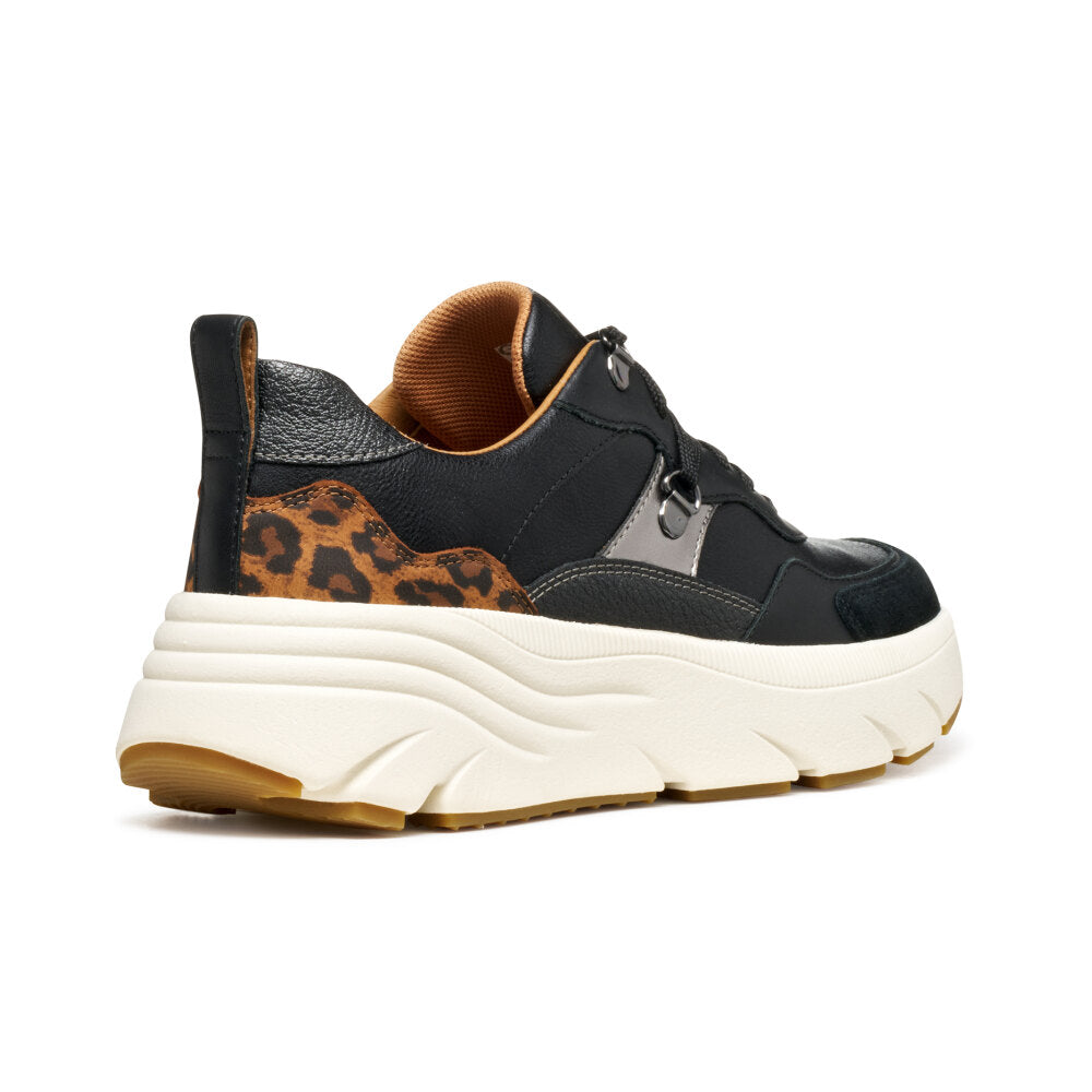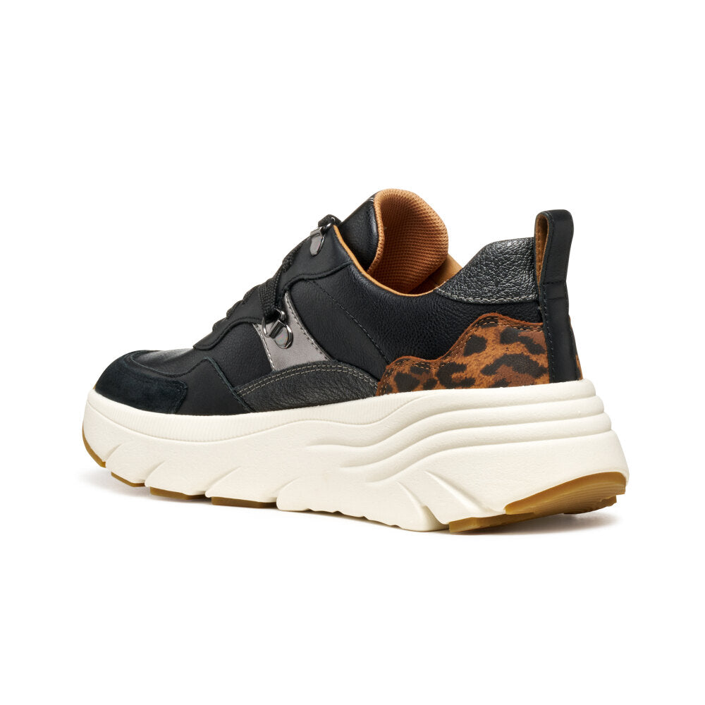 Zapatilla deportiva para mujer de la marca Geox con diseño urbano, moderno y lleno de personalidad. Fabricada en materiales sintéticos de alta calidad y detalles en piel, esta sneaker combina tonalidades negras con detalles en animal print y toques metálicos, logrando un estilo sofisticado y actual. La suela gruesa tipo chunky aporta altura y comodidad, ideal para el día a día o para looks más atrevidos. Con tecnología transpirable Geox y cierre con cordones.