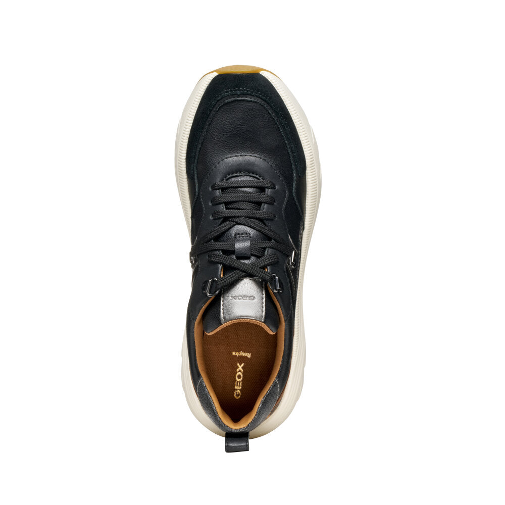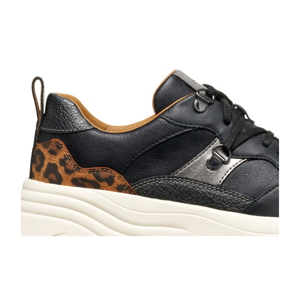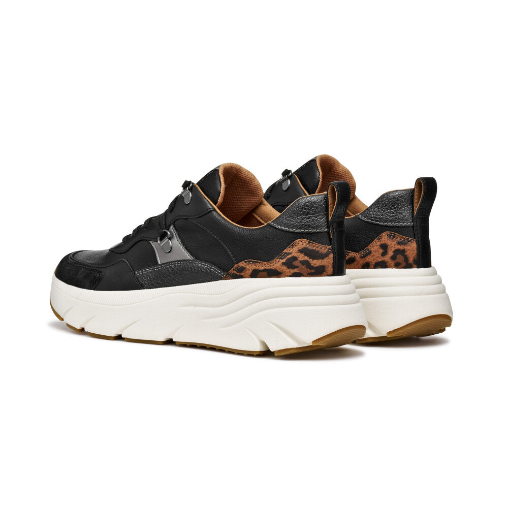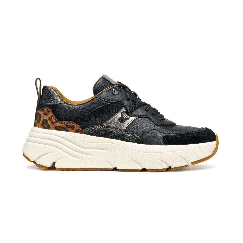 Zapatilla deportiva para mujer de la marca Geox con diseño urbano, moderno y lleno de personalidad. Fabricada en materiales sintéticos de alta calidad y detalles en piel, esta sneaker combina tonalidades negras con detalles en animal print y toques metálicos, logrando un estilo sofisticado y actual. La suela gruesa tipo chunky aporta altura y comodidad, ideal para el día a día o para looks más atrevidos. Con tecnología transpirable Geox y cierre con cordones.