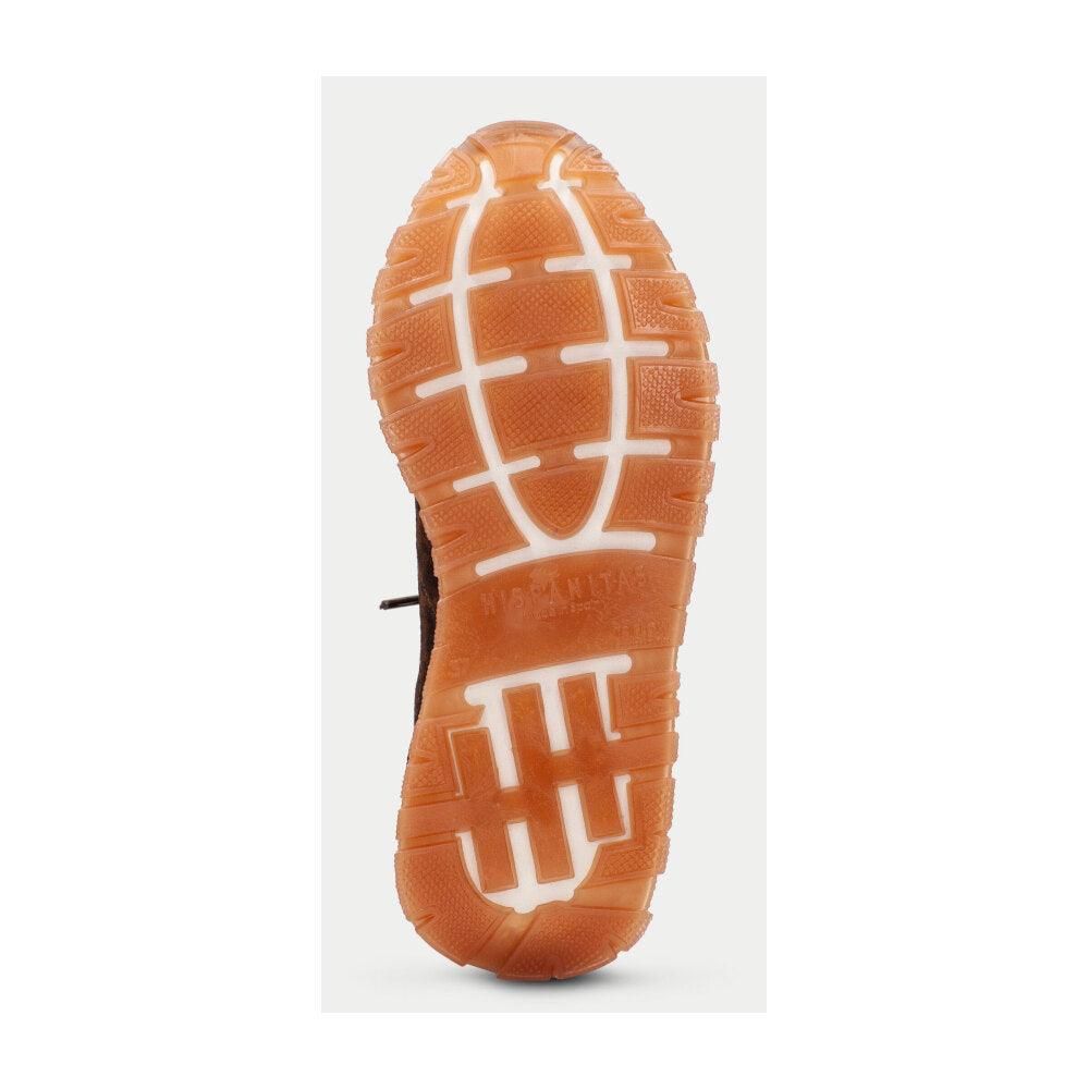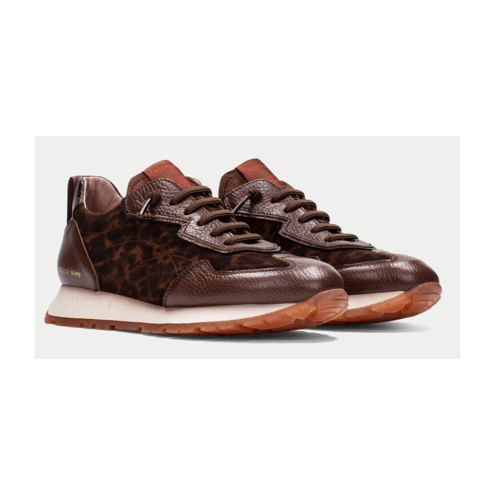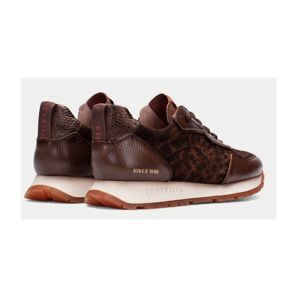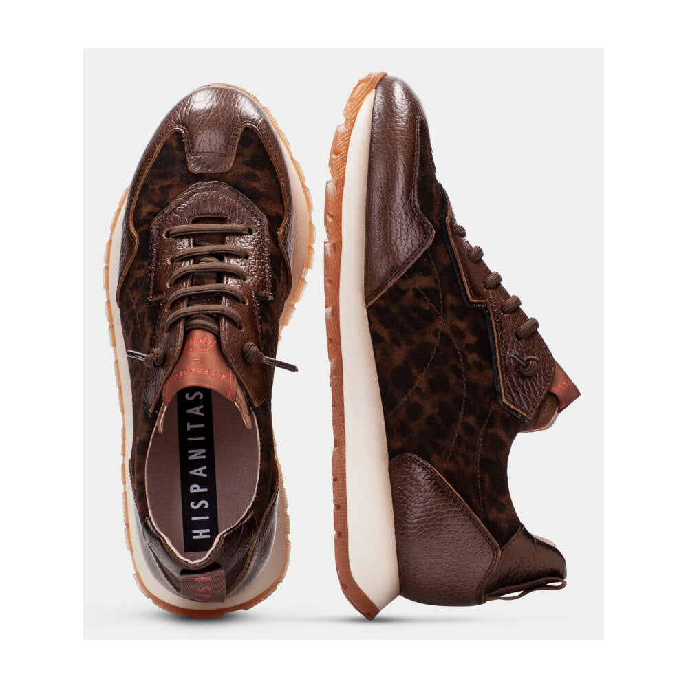 Zapatilla deportiva de mujer de la marca Hispanitas con cierre de cordones, confeccionada en una elegante combinación de piel marrón chocolate y estampado animal print. El diseño mezcla texturas con toques de charol y nobuck que aportan carácter y estilo. Incluye la tecnología TRIFLOW que garantiza comodidad y amortiguación en cada paso. Ideal para combinar con outfits urbanos y dar un toque sofisticado a tu día a día.