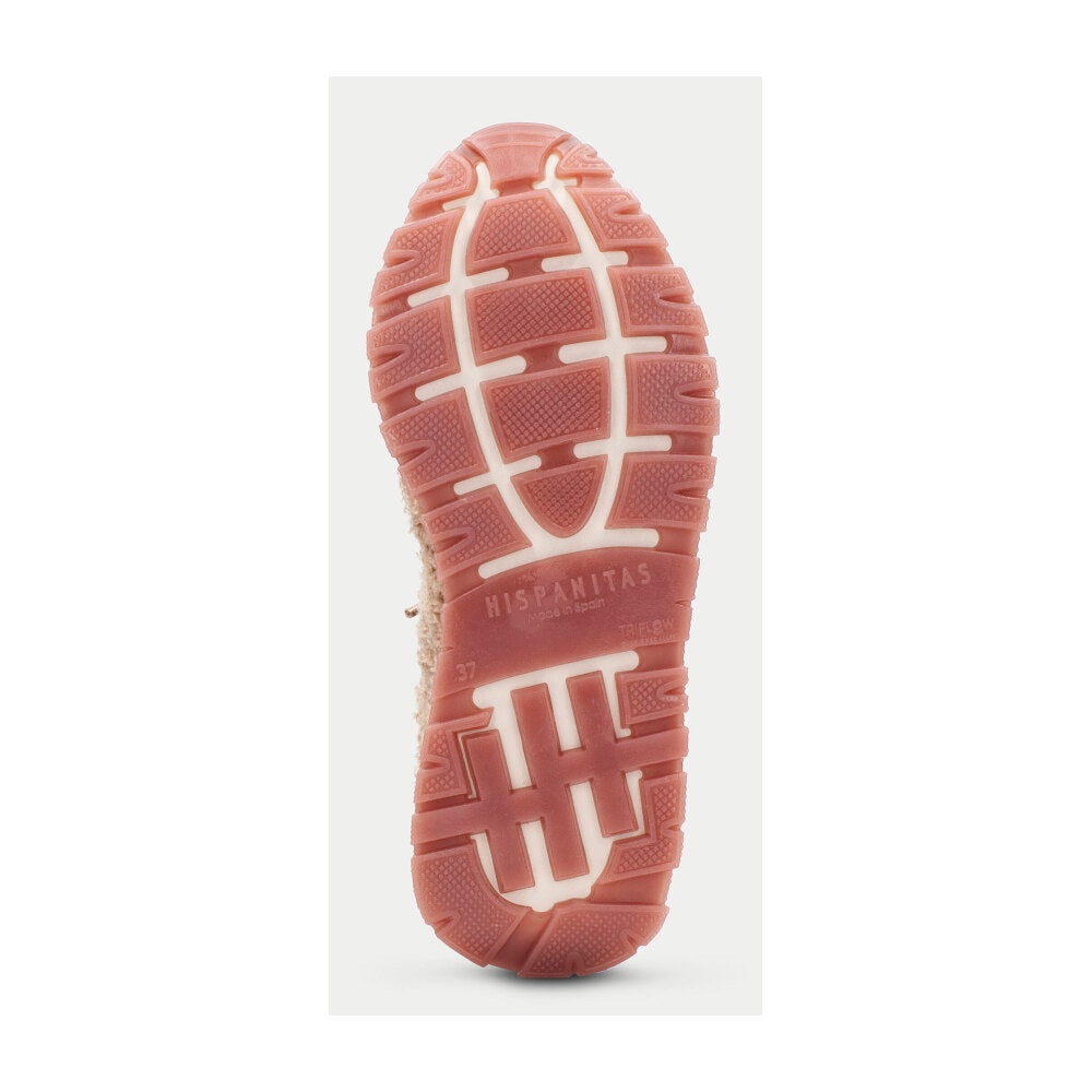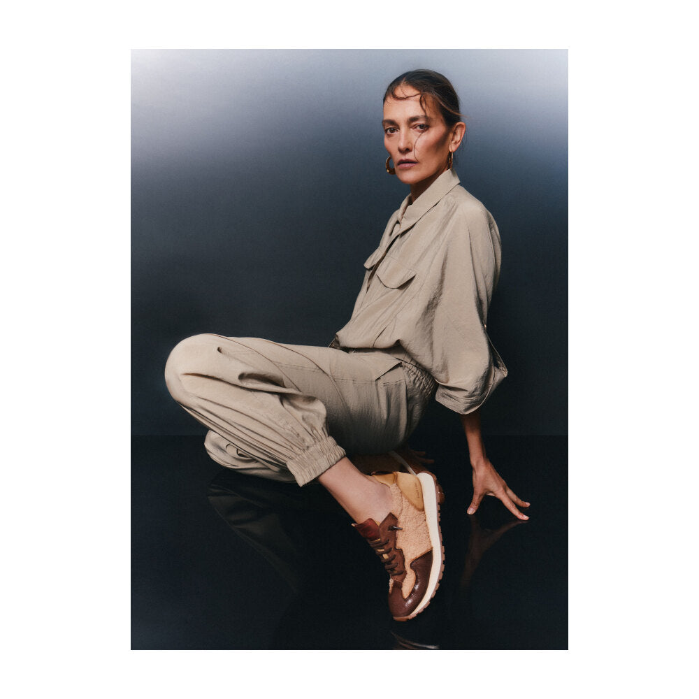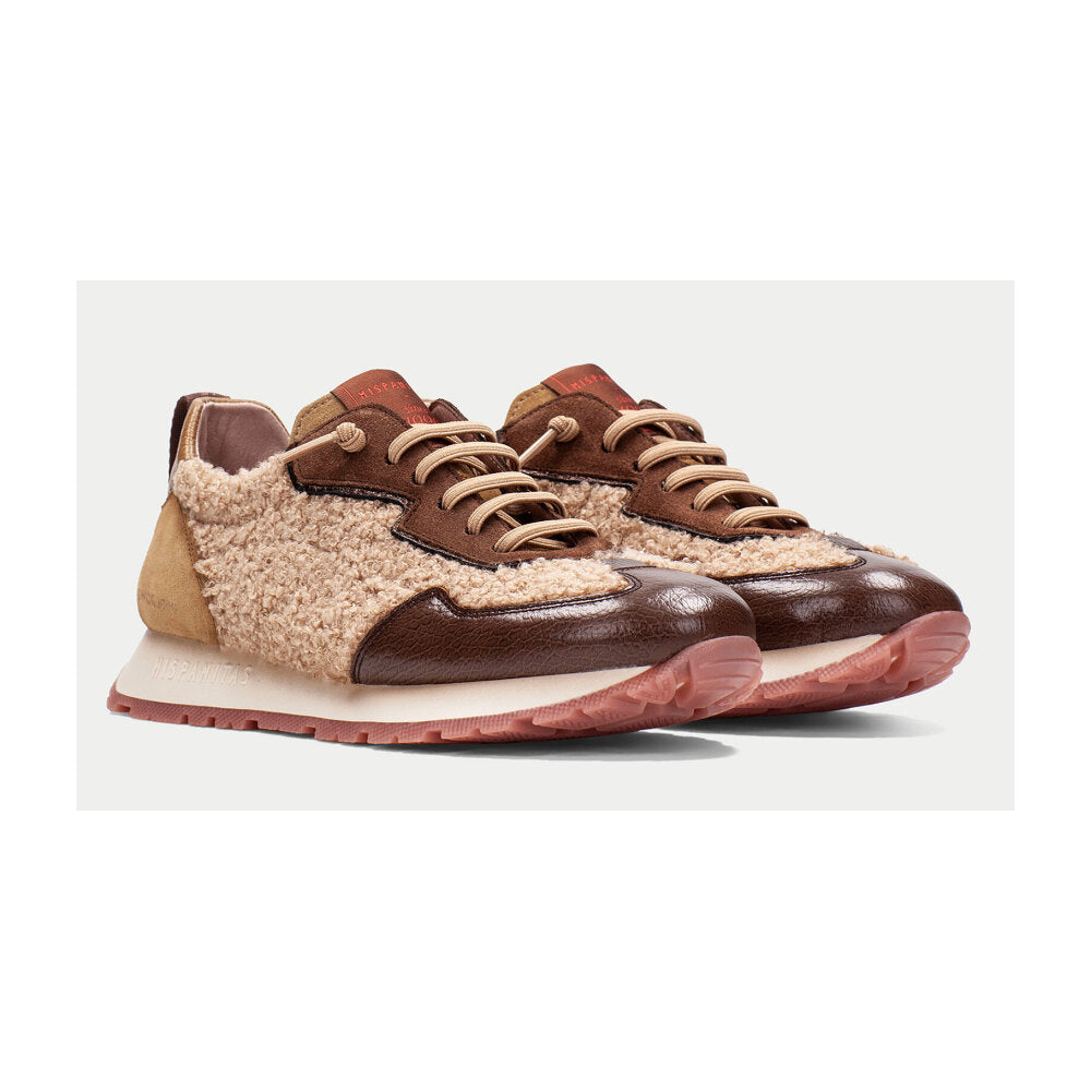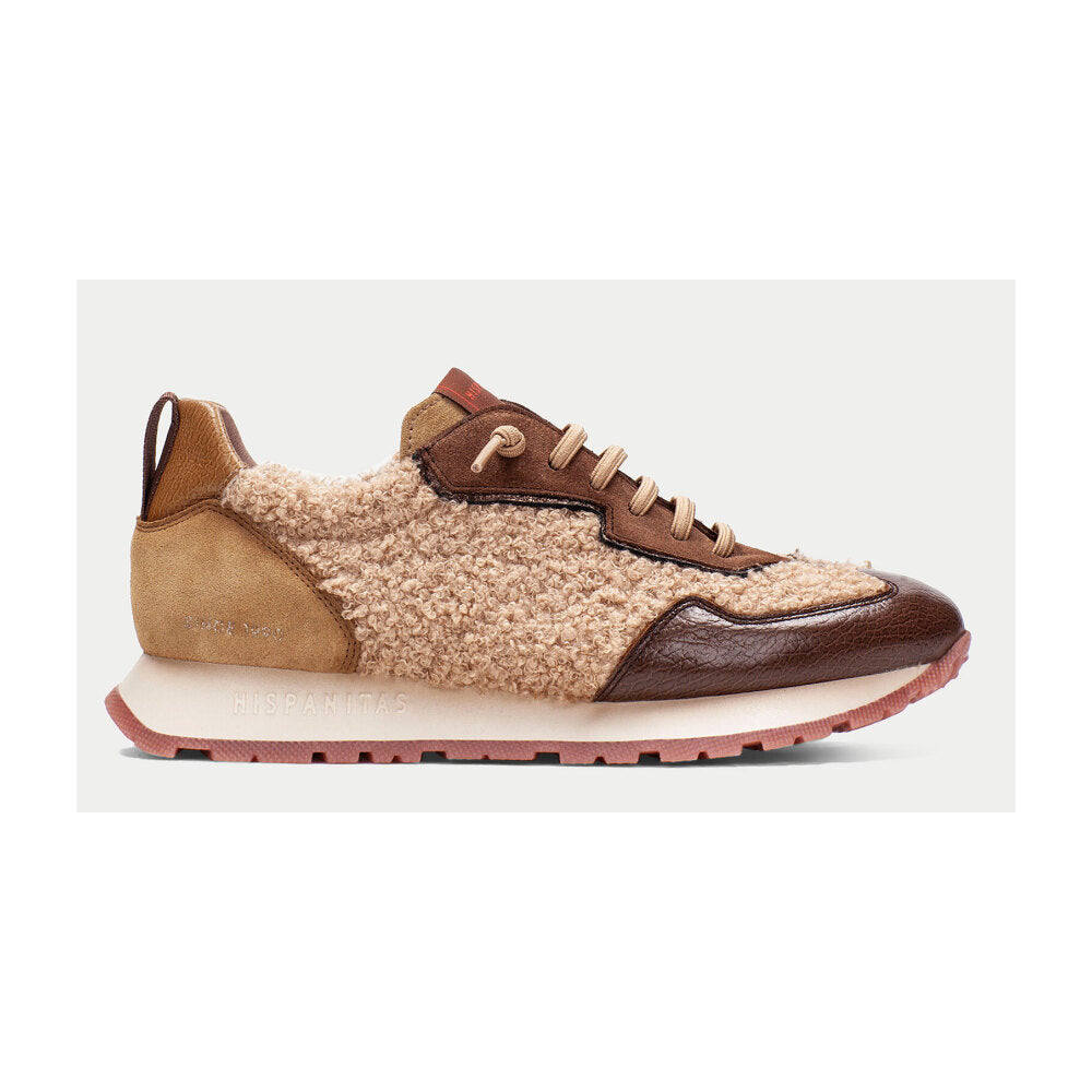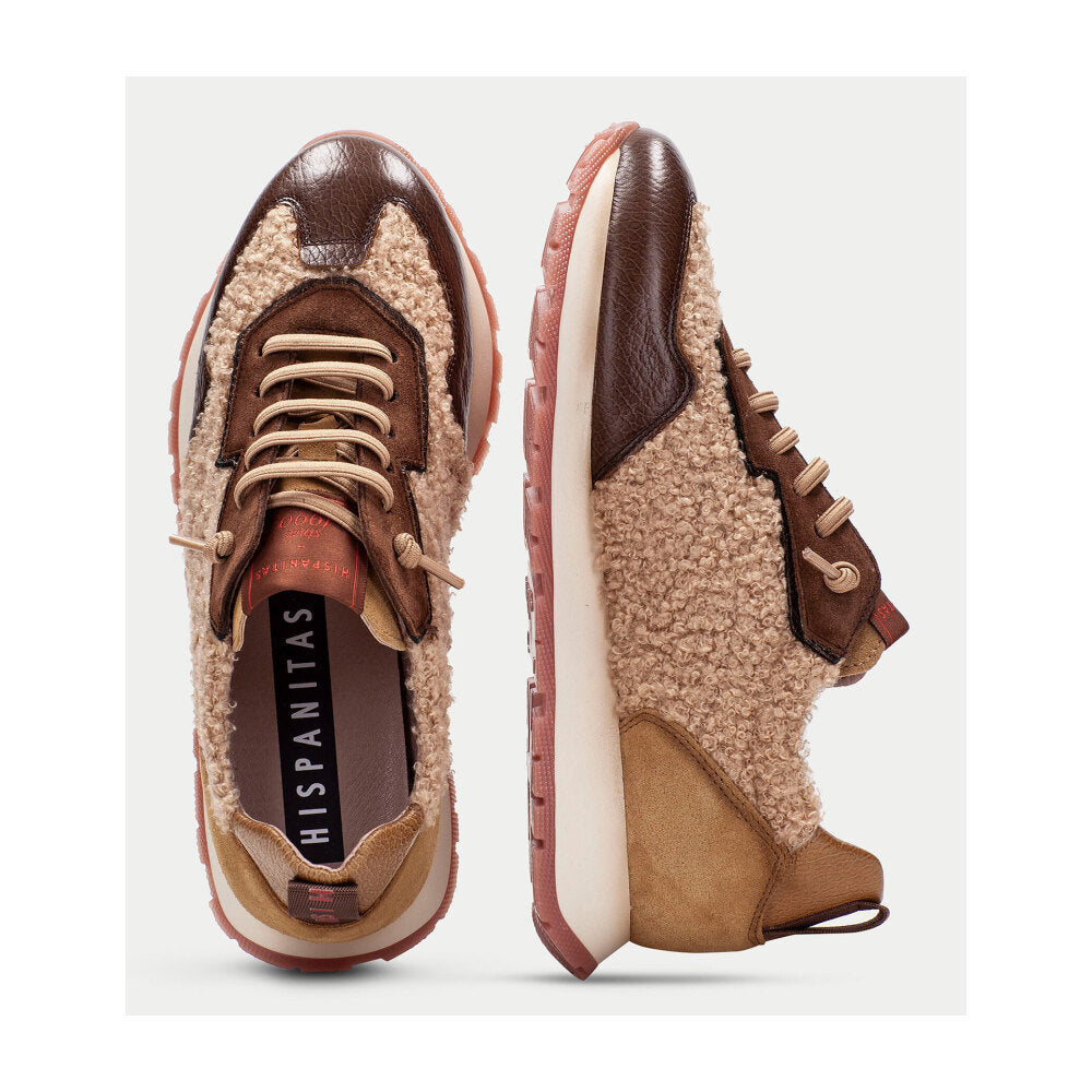 Zapatillas deportivas de mujer de la marca Hispanitas, elaboradas en una original combinación de piel auténtica marrón, ante beige y textil rizado tipo borreguito en tono crema. Este modelo destaca por su diseño moderno y urbano con inspiración retro, ideal para el día a día gracias a su comodidad y estilo único. Dispone de suela de goma con sistema TRIFLOW para una pisada amortiguada, ligera y flexible. Cierre con cordones al tono y detalles cuidados que reflejan la calidad de fabricación de Hispanitas. Fabricadas en España.