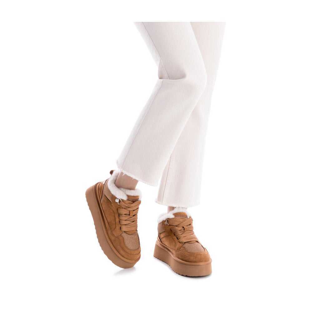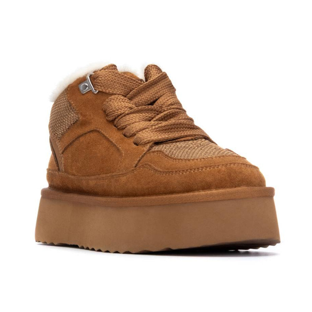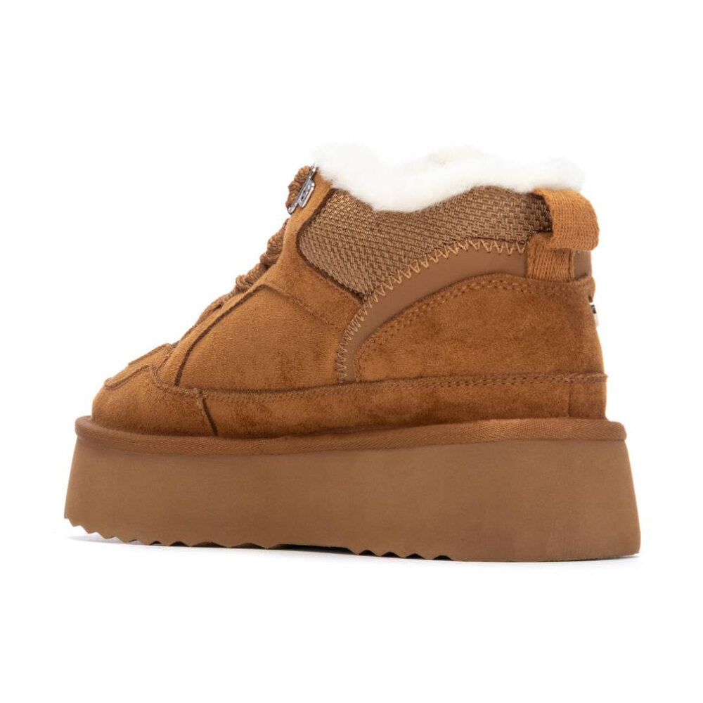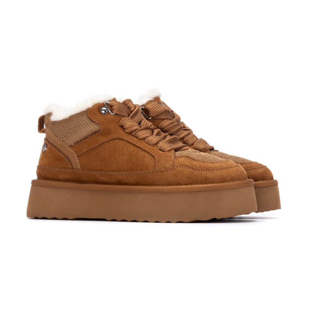 zapatilla de inspiración montaña en textil técnico de alta resistencia, disponible en camel o marrón tostado. interior forrado con suave pelo para máxima calidez en los días fríos. cierre con cordones gruesos y enganches metálicos que aportan estilo y sujeción. suela de plataforma con base dentada para un mejor agarre. perfecta para uso diario en climas fríos, combina diseño urbano con estética outdoor.