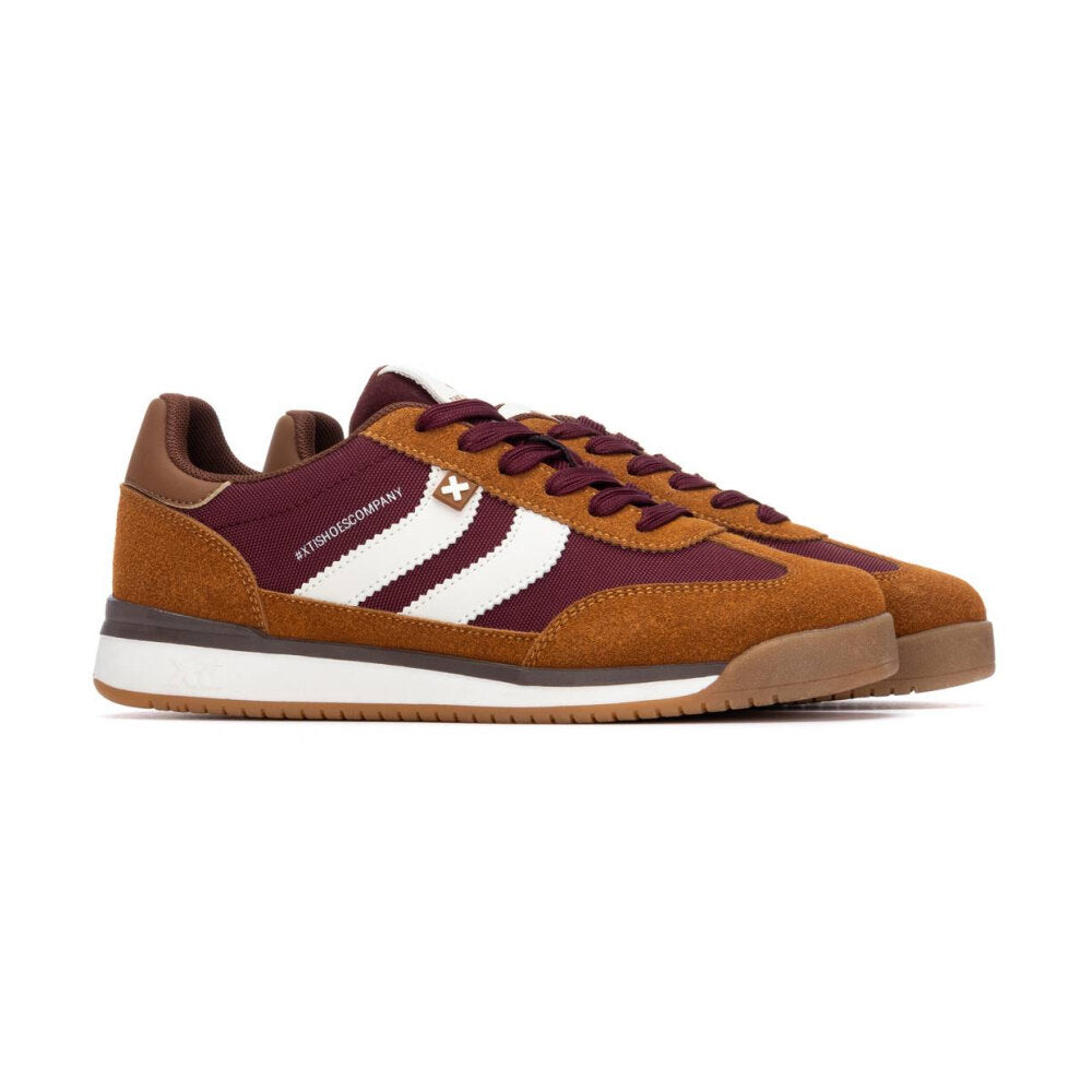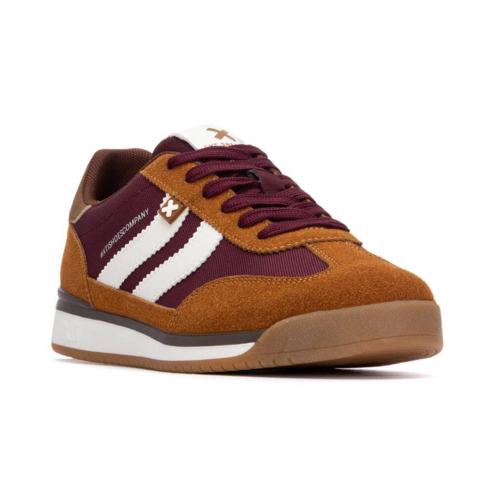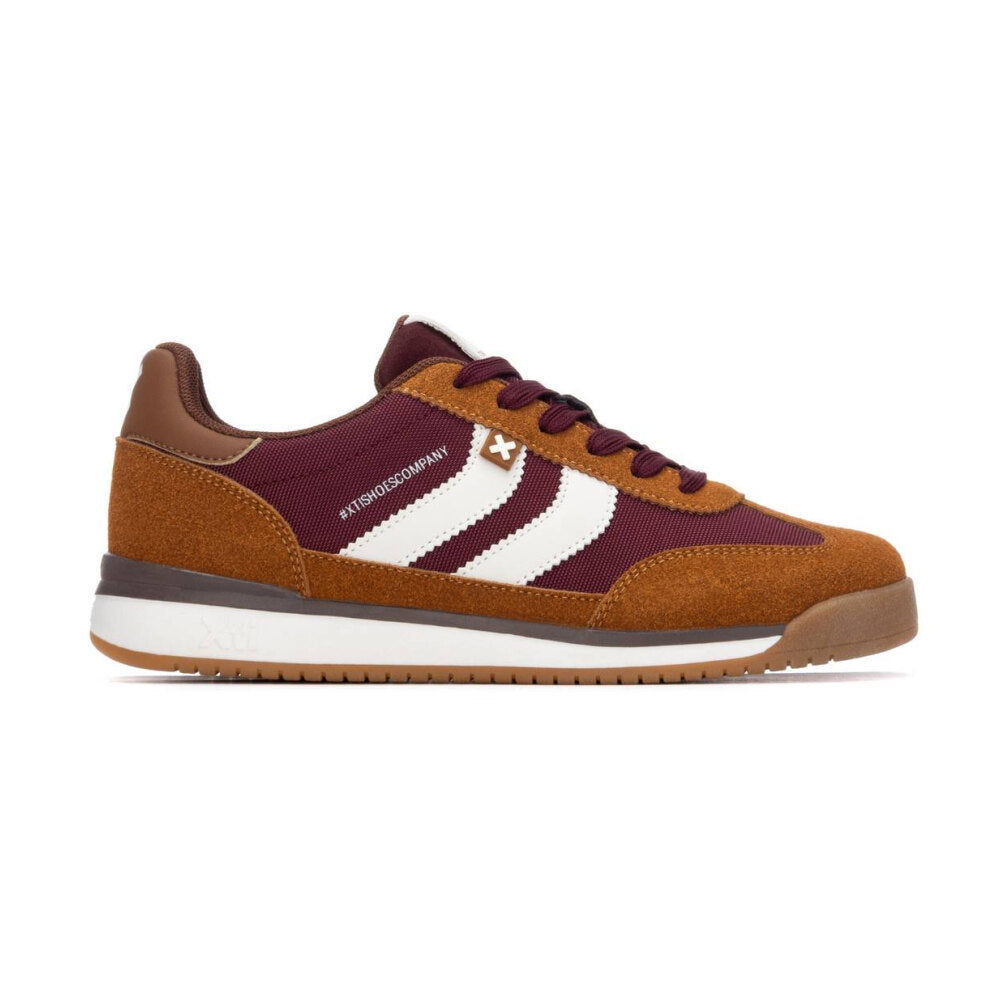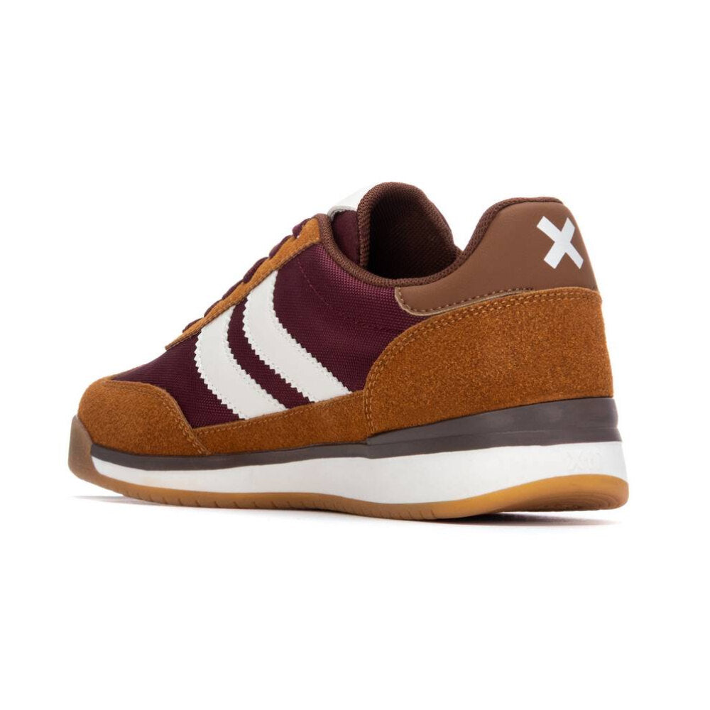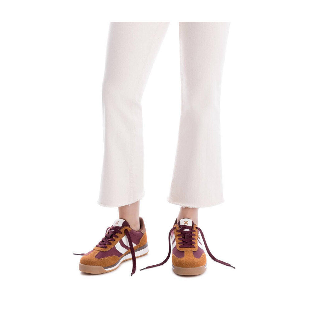 zapatilla estilo running vintage en textil técnico color burdeos, con refuerzos en camel y detalles en blanco crudo. suela bicolor con base de goma que asegura buena tracción y confort. un diseño inspirado en las sneakers clásicas de los 80, ideal para darle un toque deportivo a tus looks diarios sin perder estilo.