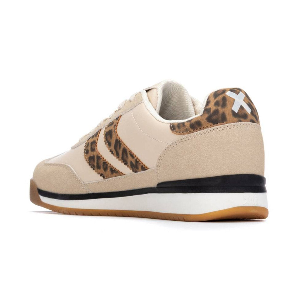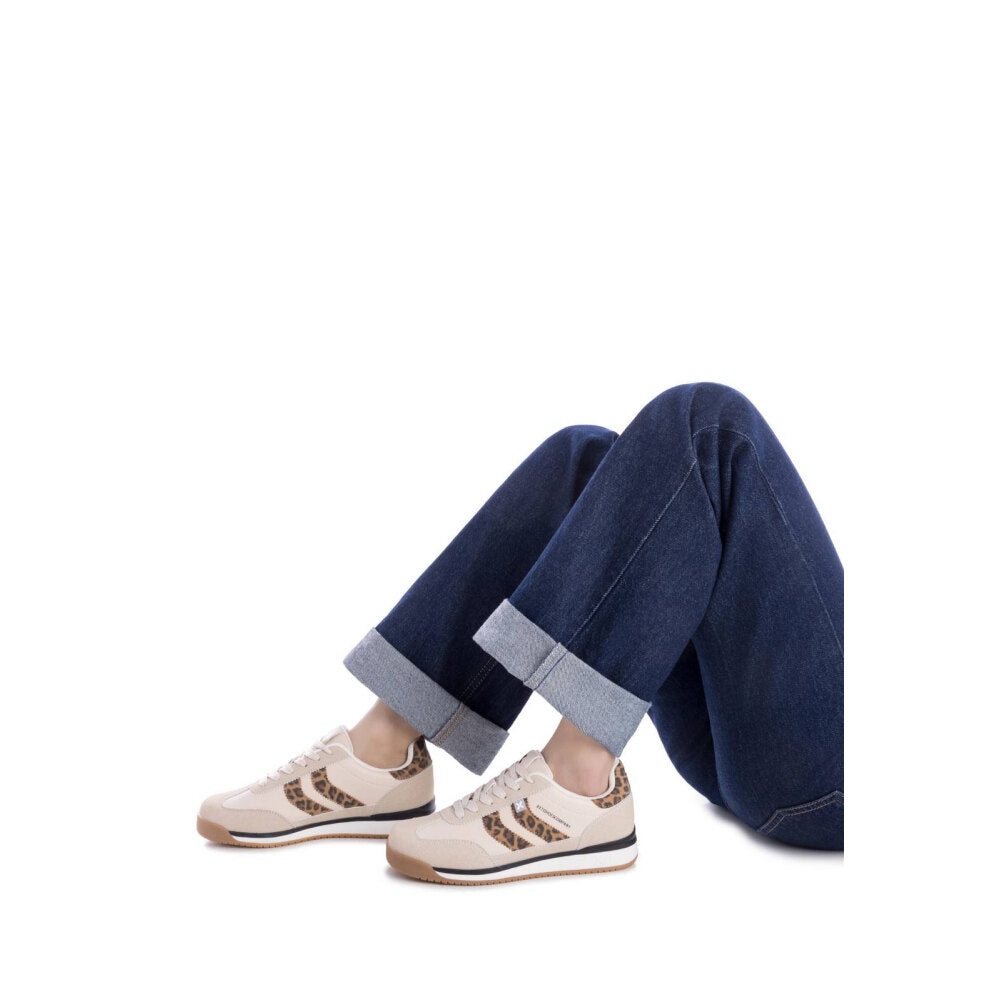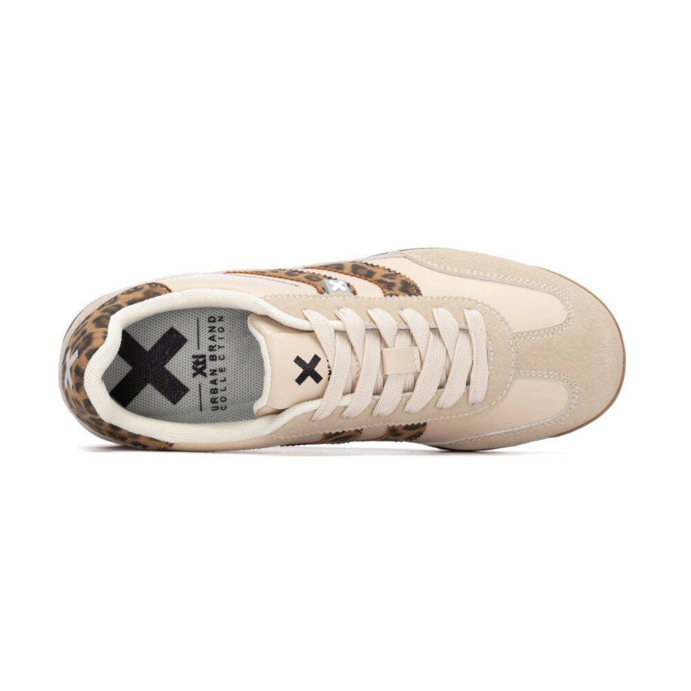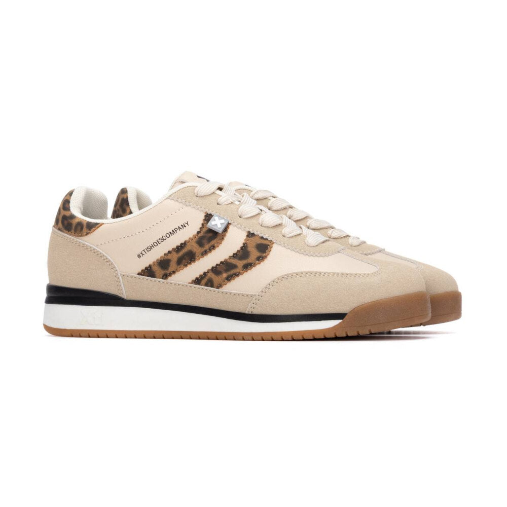 zapatilla de inspiración retro en tonos beige con detalles de estampado leopardo en las bandas laterales y el talón. fabricada en textil técnico combinado con piezas sintéticas, ofrece ligereza y transpirabilidad. suela de goma bicolor con acabado dentado para mejor agarre. perfecta para añadir un toque salvaje y moderno a tus looks diarios.