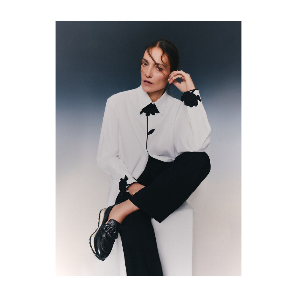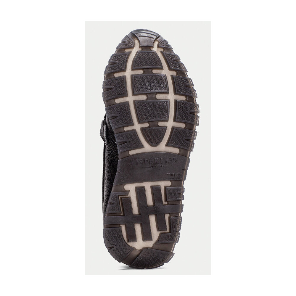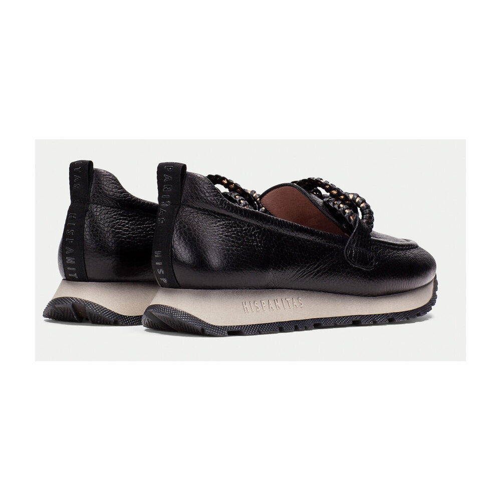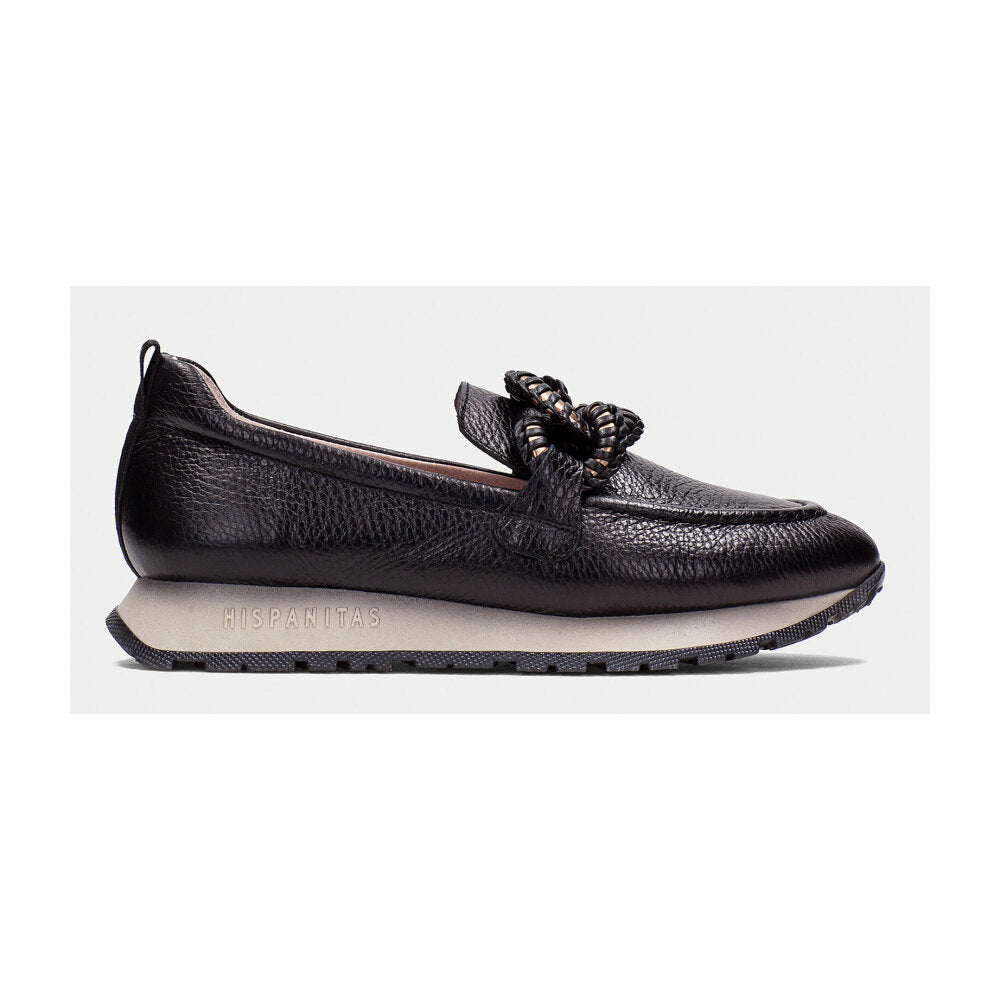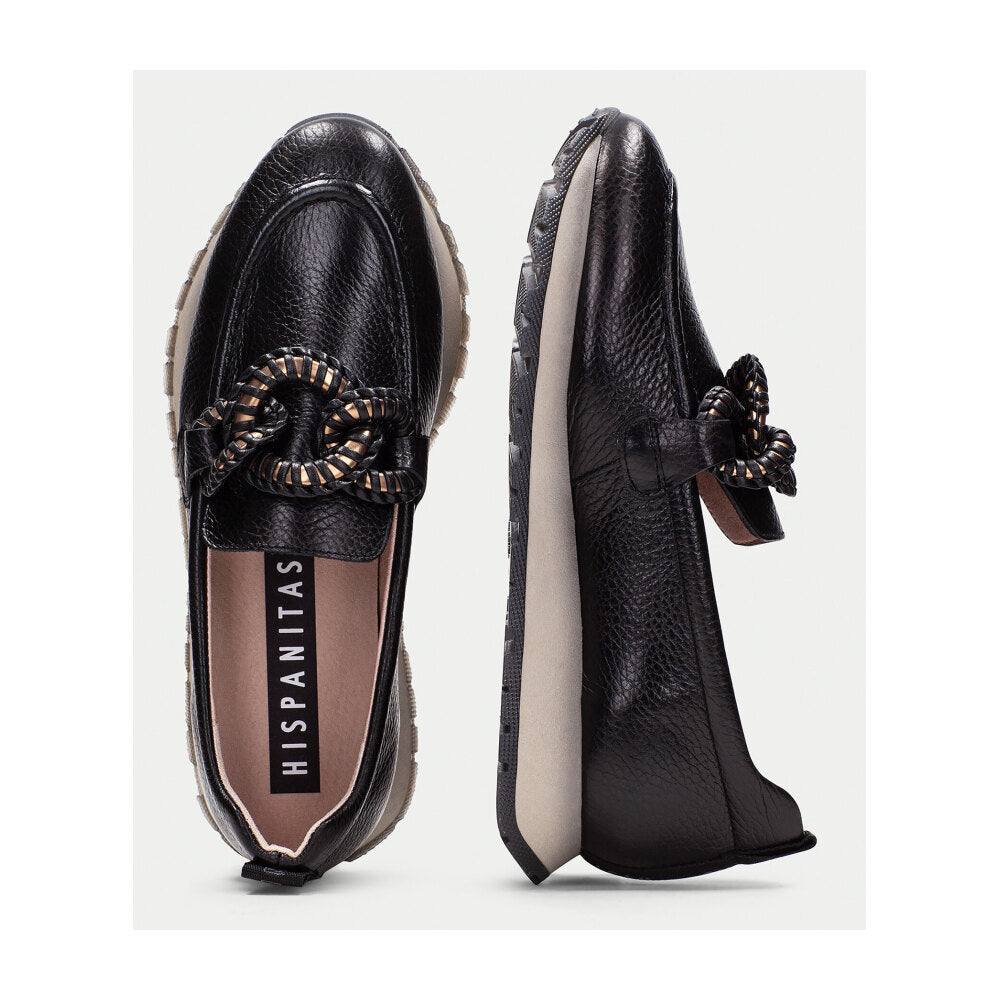 Mocasín de piel negra de la marca Hispanitas con diseño sport y suela tipo sneaker. Incorpora detalle decorativo de cordón entrelazado en la parte frontal, aportando un toque original y sofisticado. La suela bicolor con plataforma ligera y tecnología TRIFLOW ofrece máxima comodidad, flexibilidad y absorción de impactos. Perfecto para combinar estilo y confort en tu día a día.