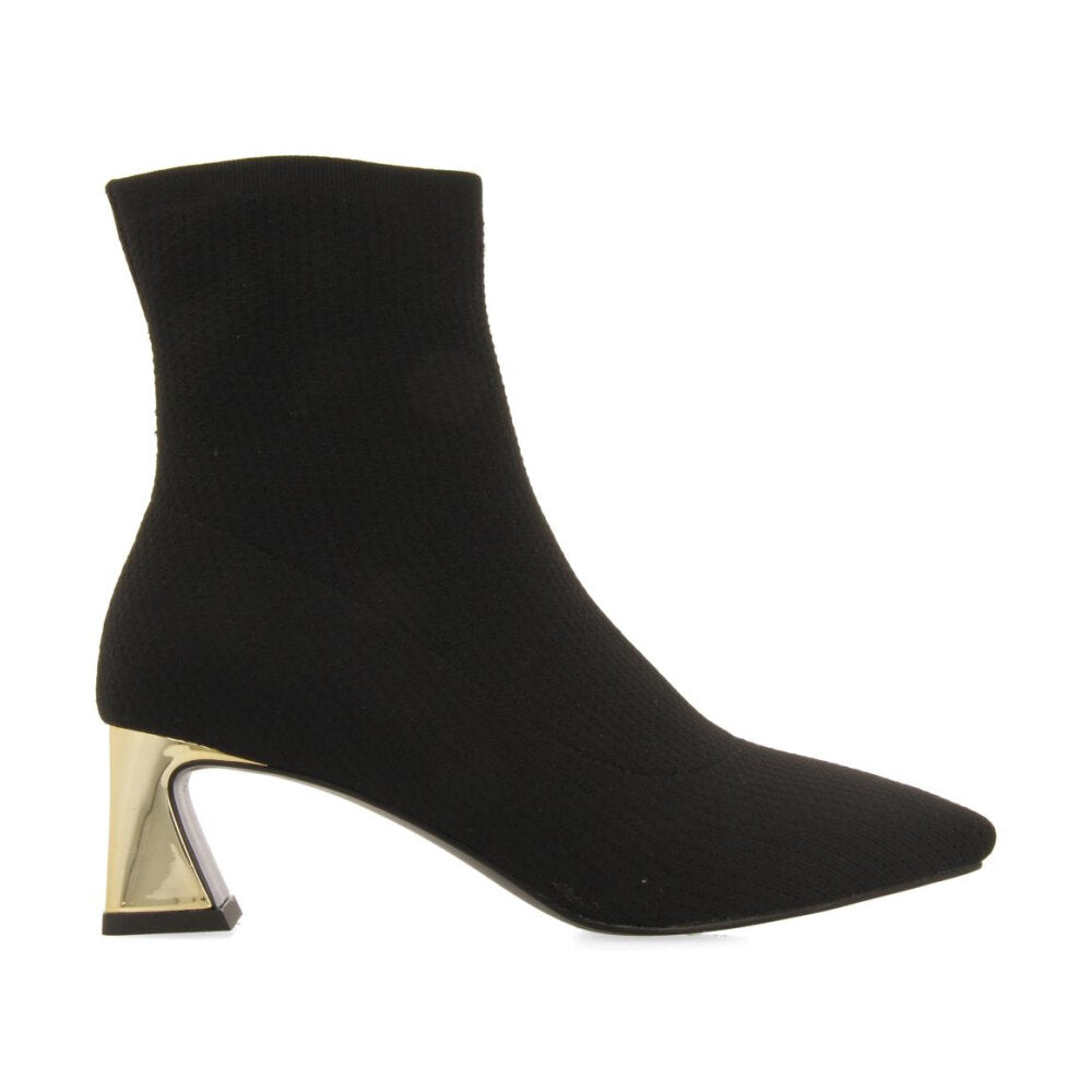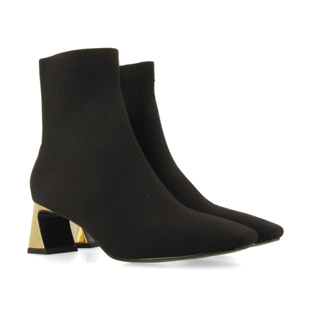 botín tipo calcetín en tejido elástico negro que se adapta al tobillo como una segunda piel. diseño sofisticado con punta afilada y tacón geométrico dorado de acabado brillante que aporta un toque vanguardista y glamuroso. ideal para estilismos de noche o looks urbanos con personalidad. cierre sin cremallera para un ajuste fácil y cómodo.