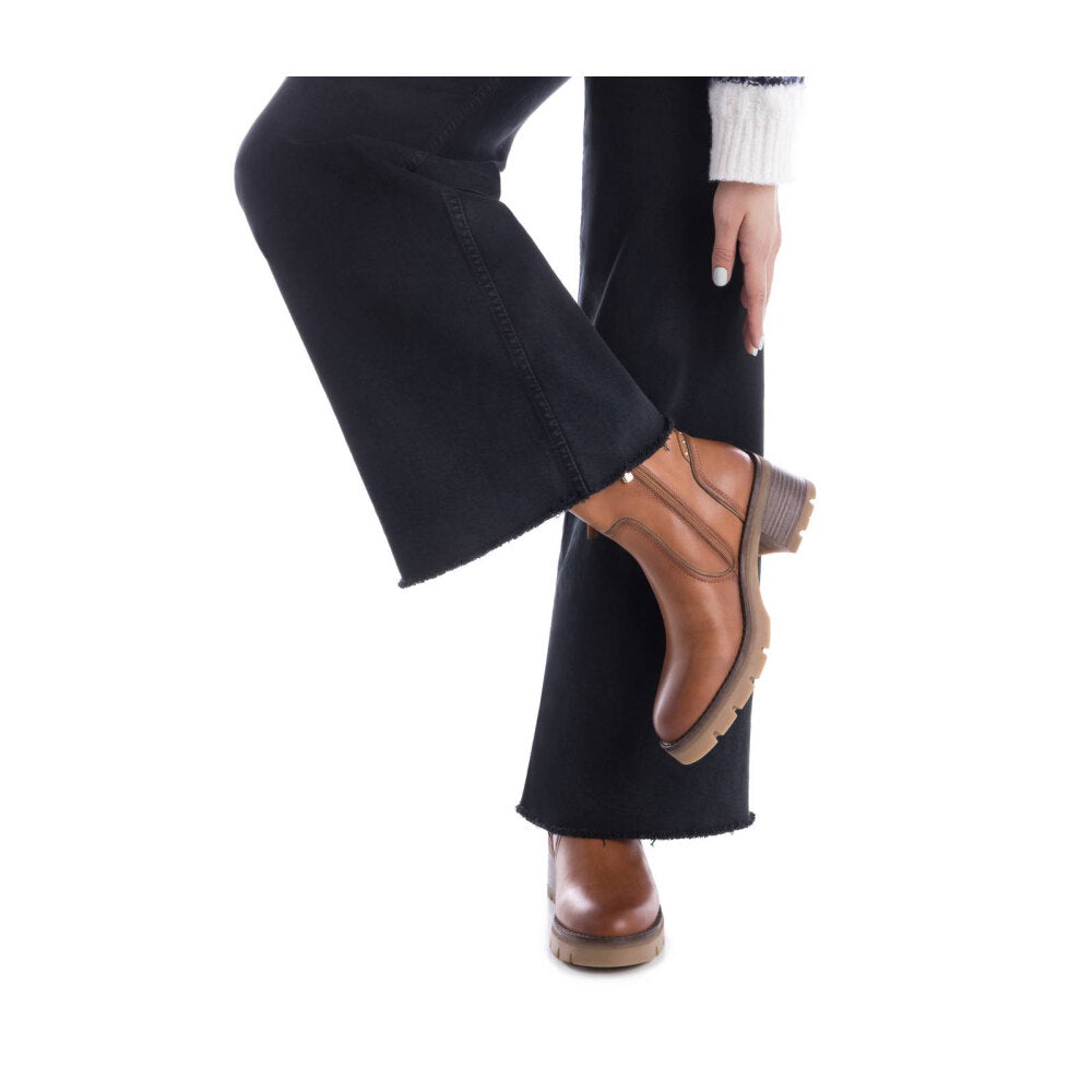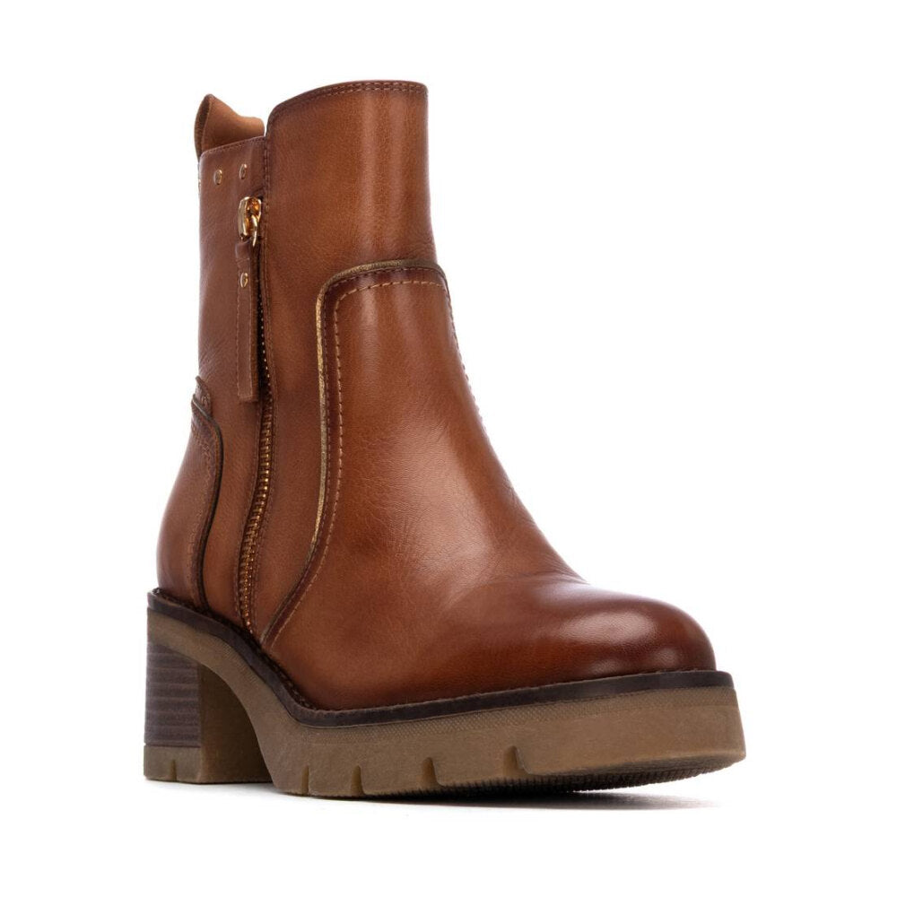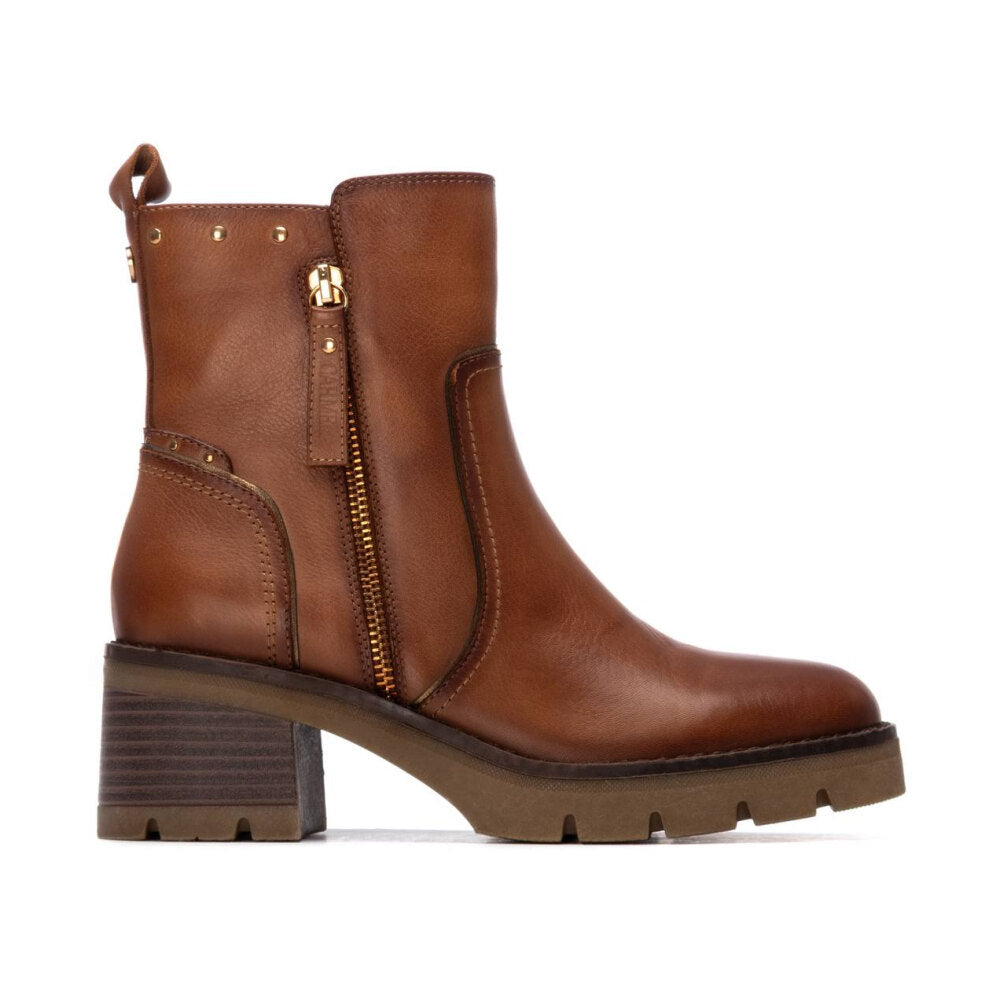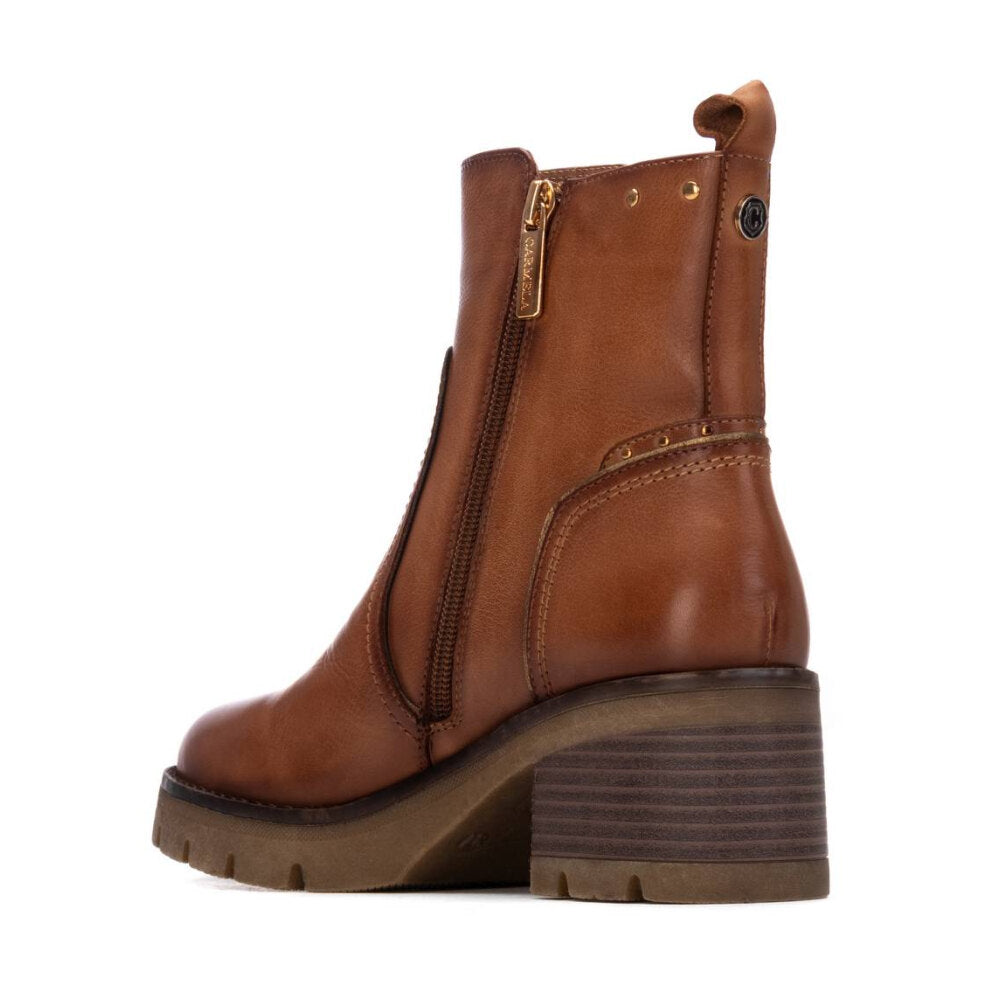 botín de mujer de la marca carmela, confeccionado en piel color cuero de gran calidad. incorpora cremallera lateral dorada decorativa y cierre interior funcional para mayor comodidad. su tacón ancho y suela dentada proporcionan estabilidad y estilo, mientras que los detalles metálicos aportan un toque moderno y urbano. ideal para looks casuales, de diario o para combinar con estilismos otoñales con carácter.