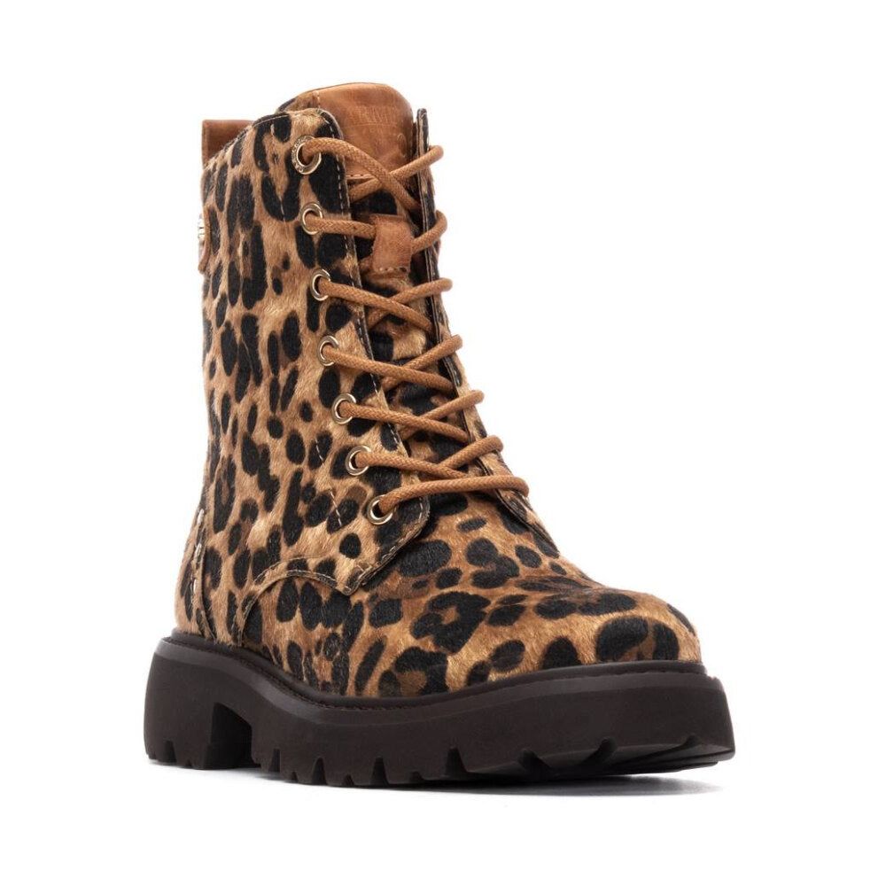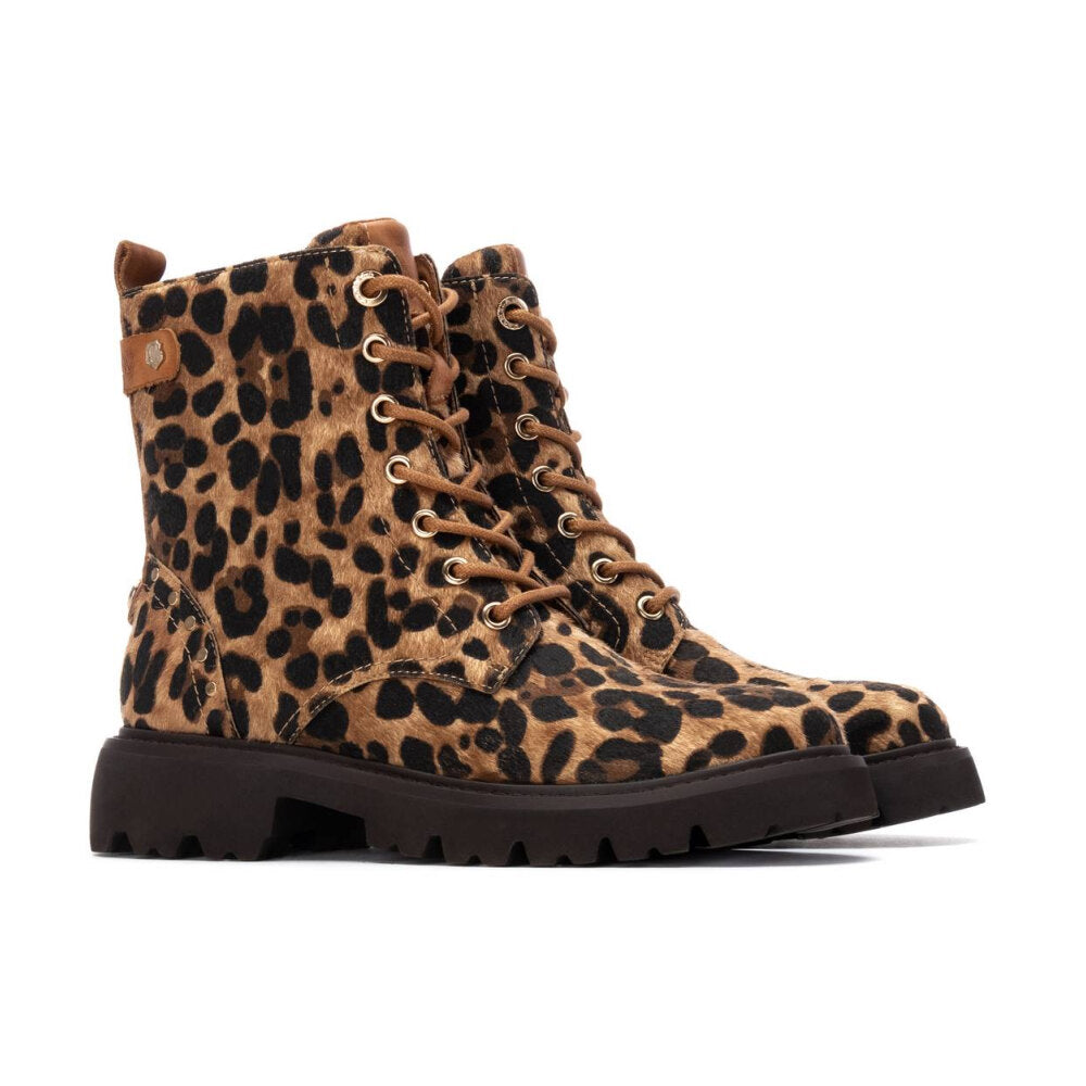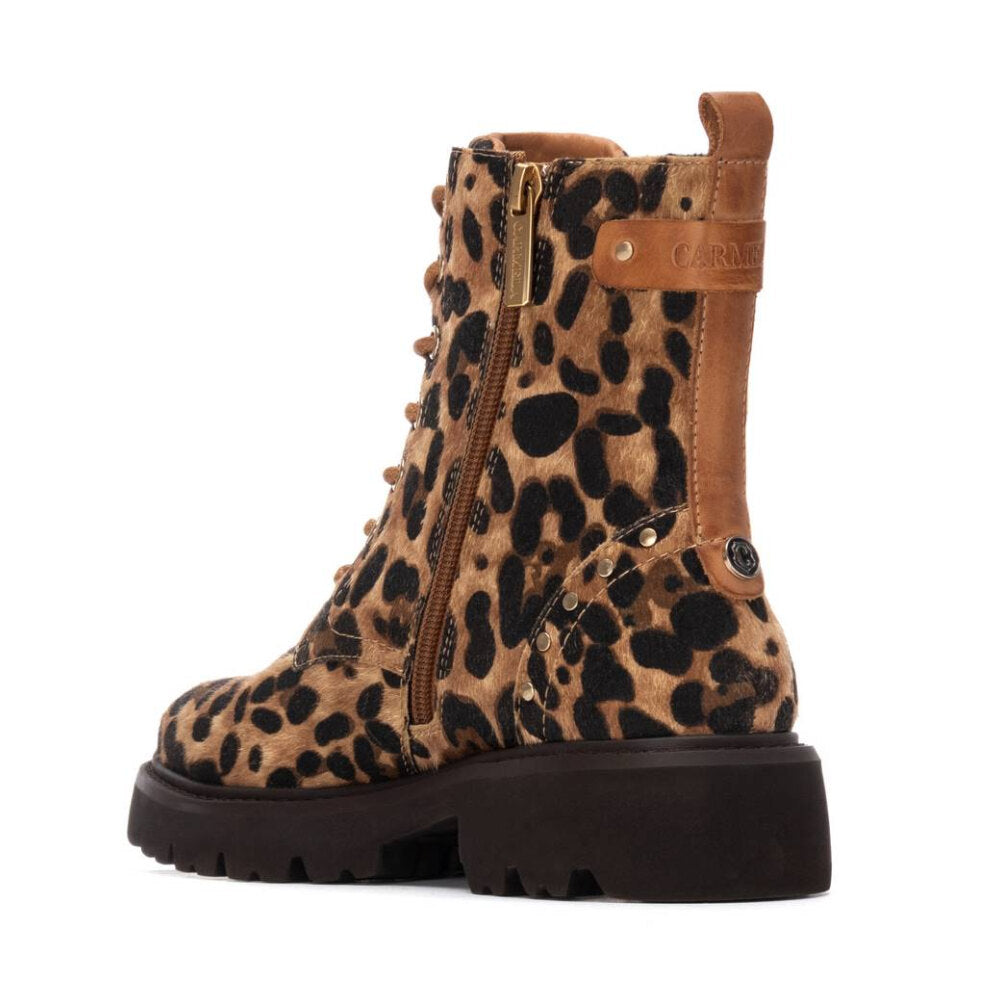 botín de mujer de la marca carmela con diseño de inspiración militar, confeccionado en material efecto pelo con estampado animal print. cuenta con cierre de cordones, tirador trasero y suela gruesa tipo track para una pisada firme y segura. una propuesta atrevida y moderna para looks urbanos con personalidad. ideal para combinar con jeans, vestidos o conjuntos casuales de otoño e invierno.