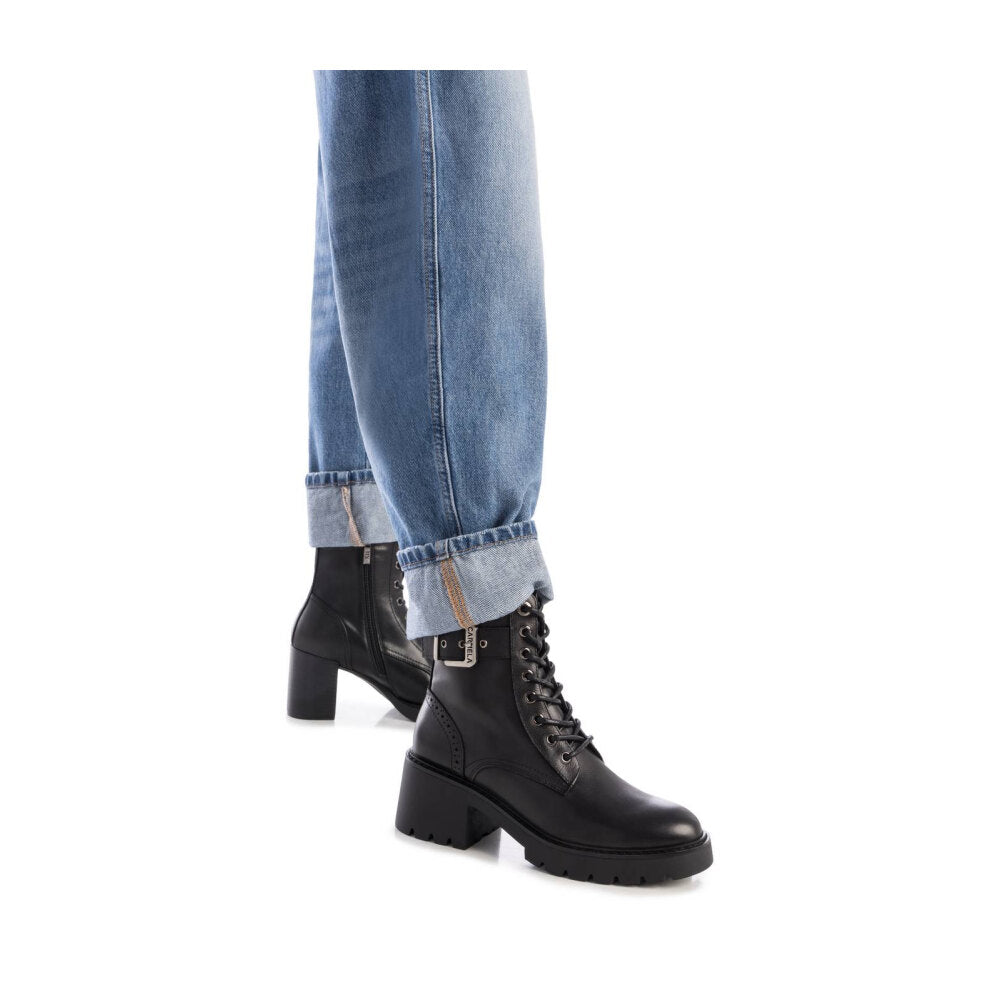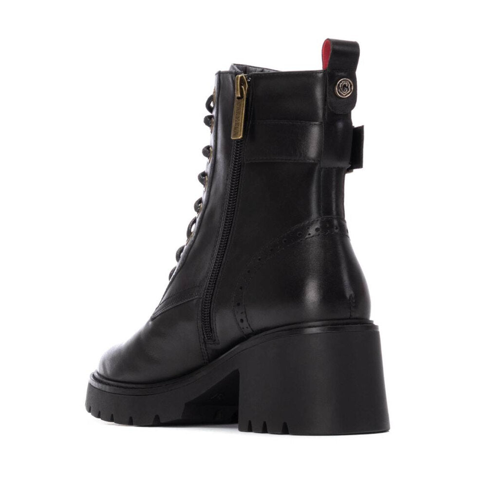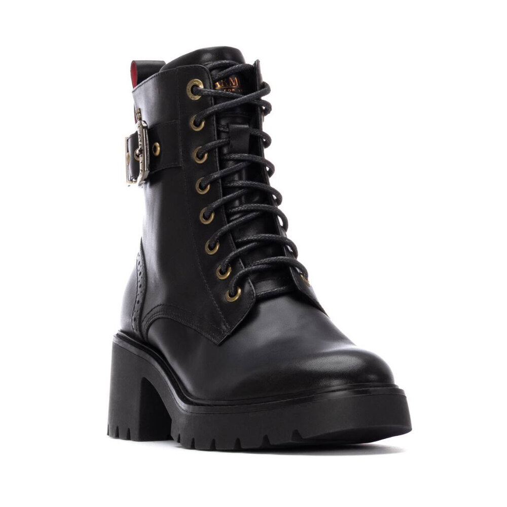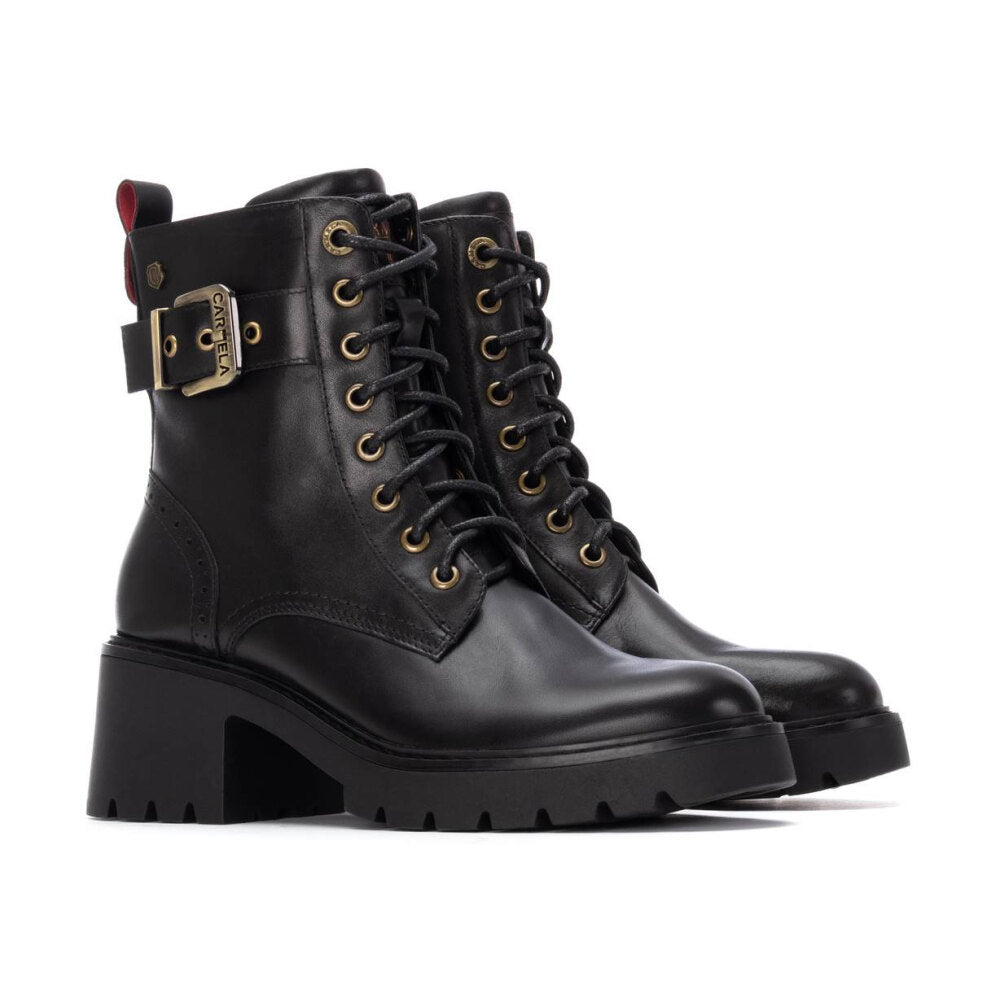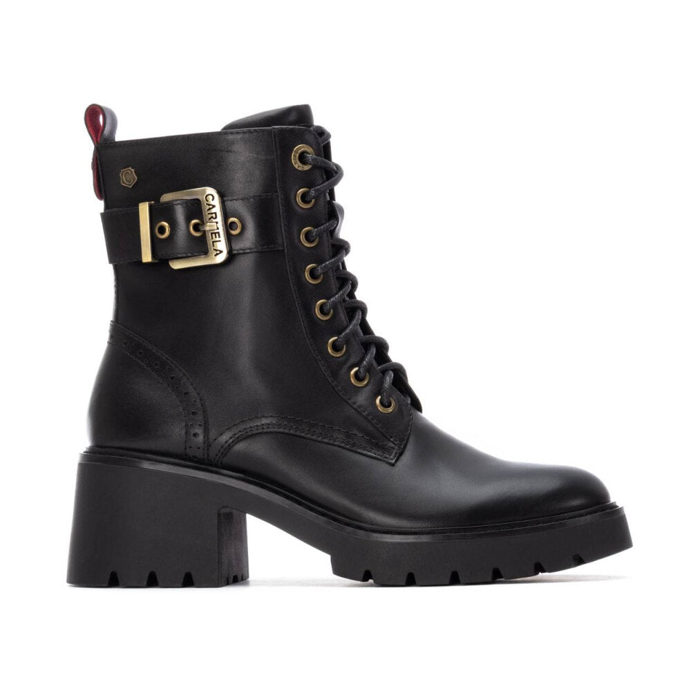 botín de mujer de la marca carmela con diseño de inspiración militar. confeccionado en piel negra de alta calidad, presenta cierre con cordones, detalle de hebilla metálica dorada con logo grabado y tirador trasero en contraste. incorpora tacón ancho con suela dentada para una pisada firme, estable y con estilo. perfecto para looks urbanos, casuales o con un toque rockero.