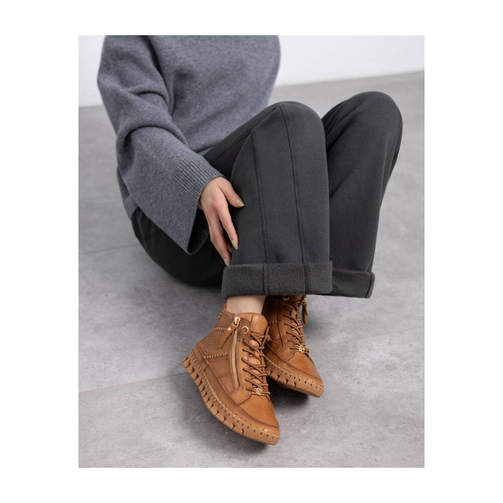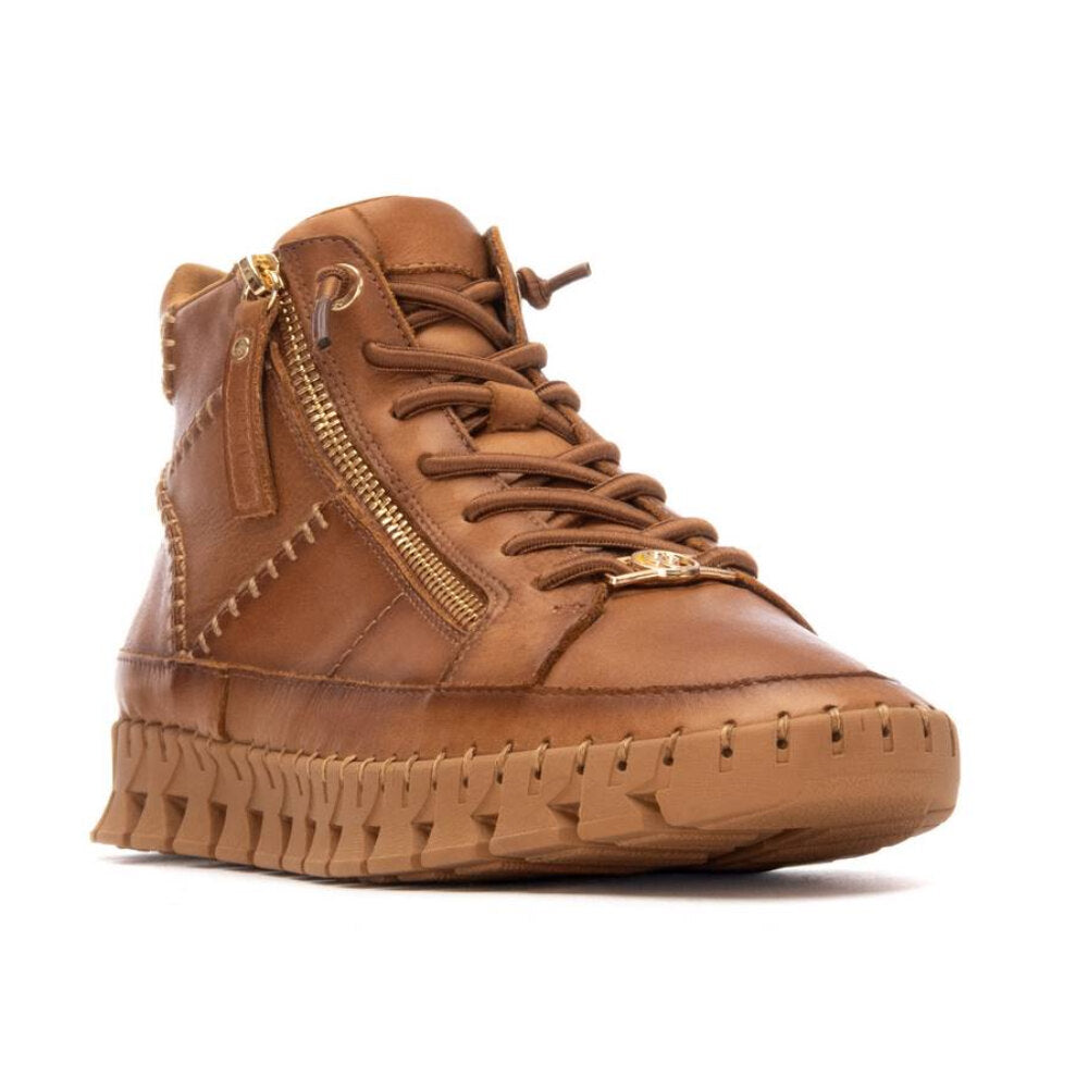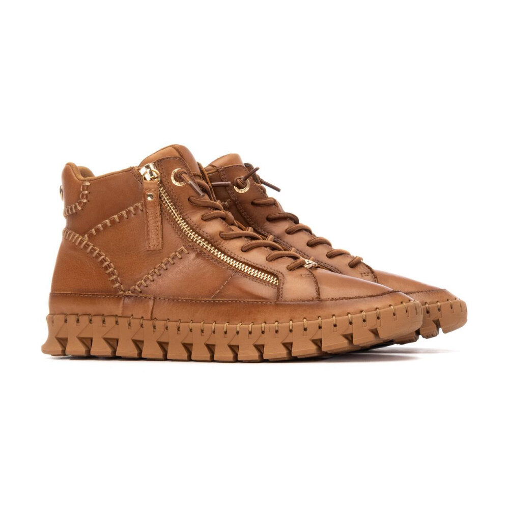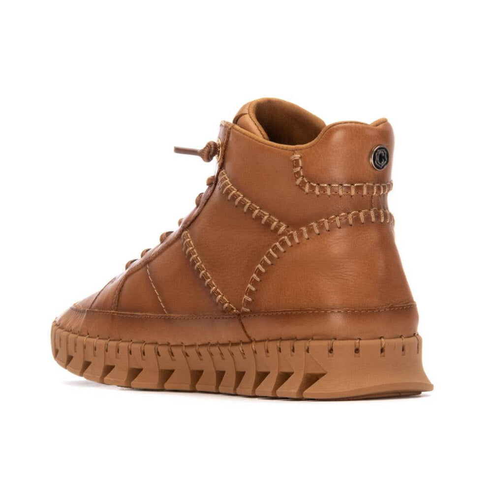 zapatilla alta de mujer con diseño urbano y sofisticado, confeccionada en piel marrón de gran calidad. destaca por sus costuras artesanales vistas y su original suela dentada con efecto volumen. cierre con cordones y cremallera lateral dorada para mayor comodidad y ajuste rápido. una sneaker diferente para quienes buscan estilo, confort y originalidad en su día a día.