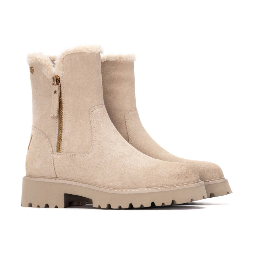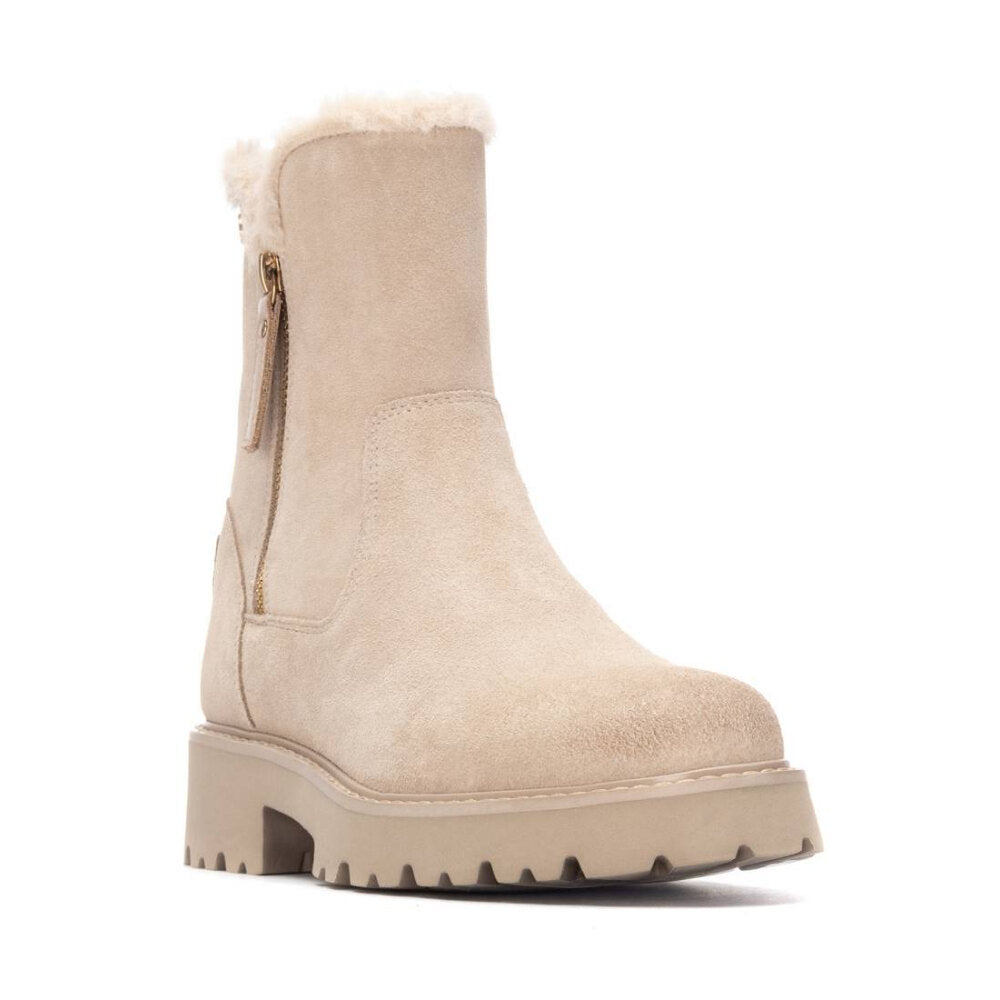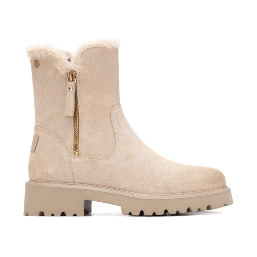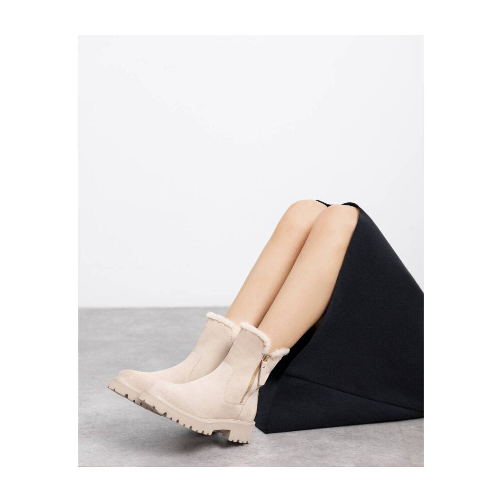 bota de mujer en suave serraje beige con cremallera lateral dorada y forro interior de pelo sintético a tono. diseño cálido, ligero y confortable con suela gruesa de goma dentada para mayor estabilidad. perfecta para combinar con looks de invierno en tonos neutros y naturales.