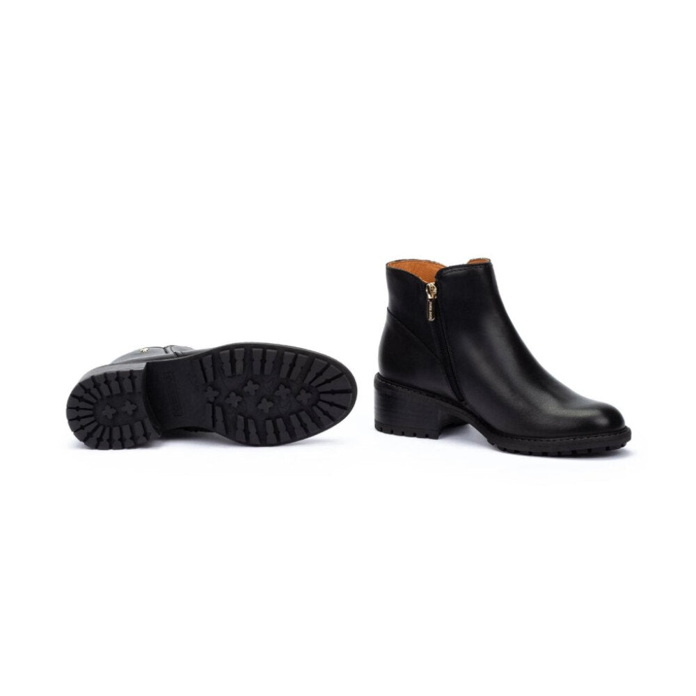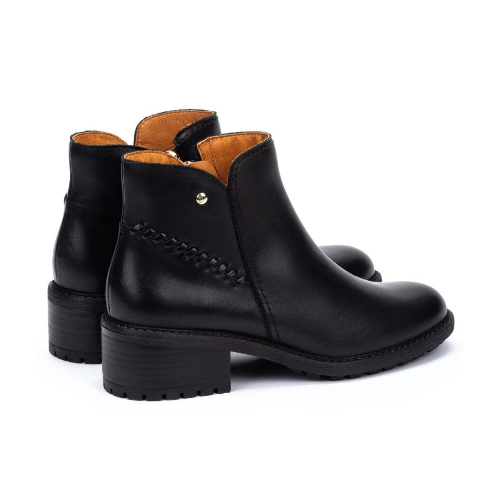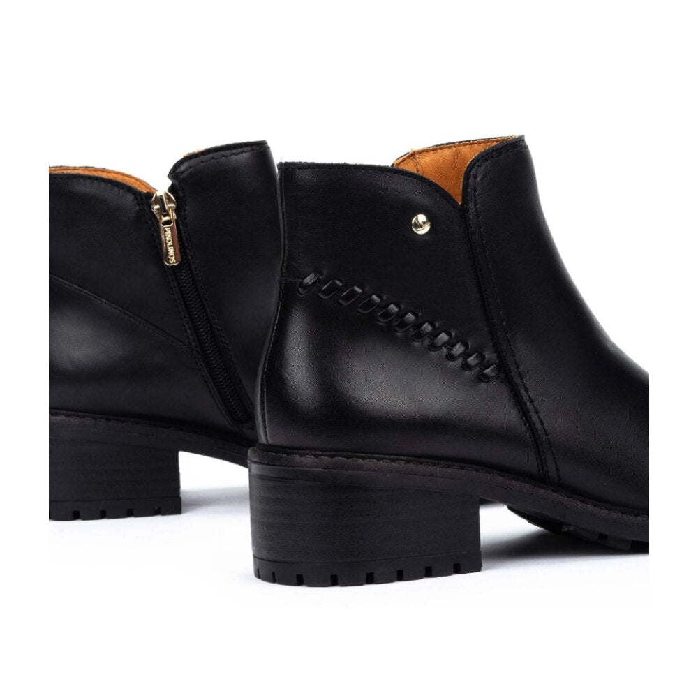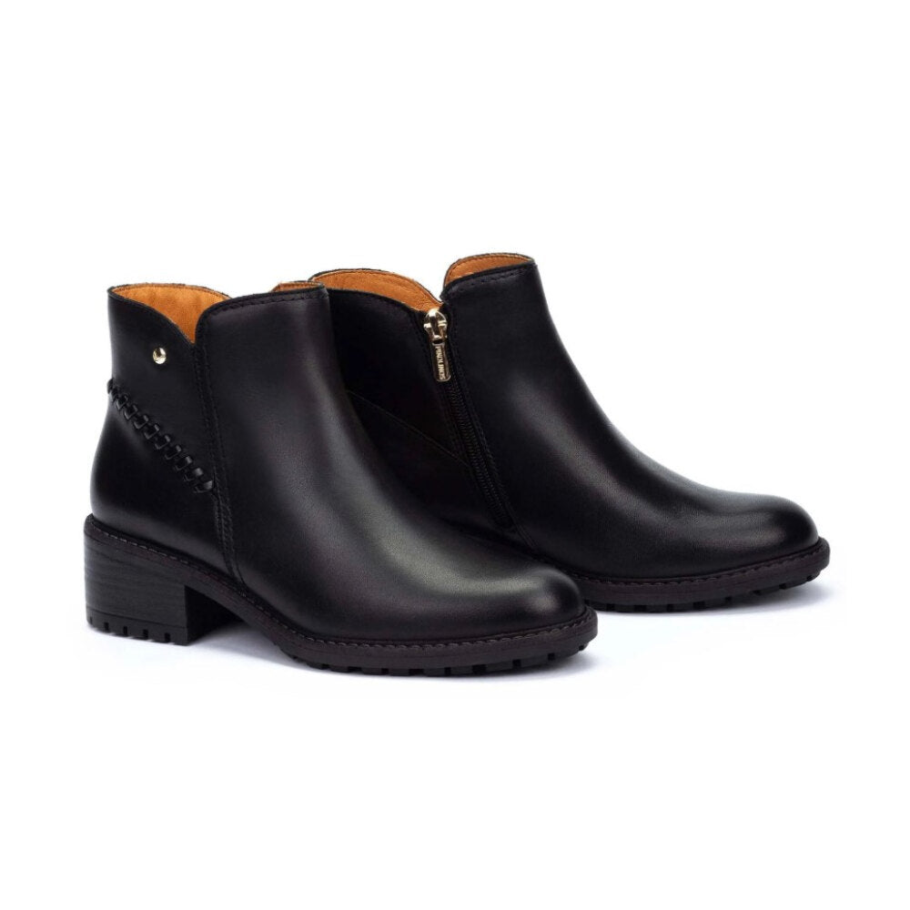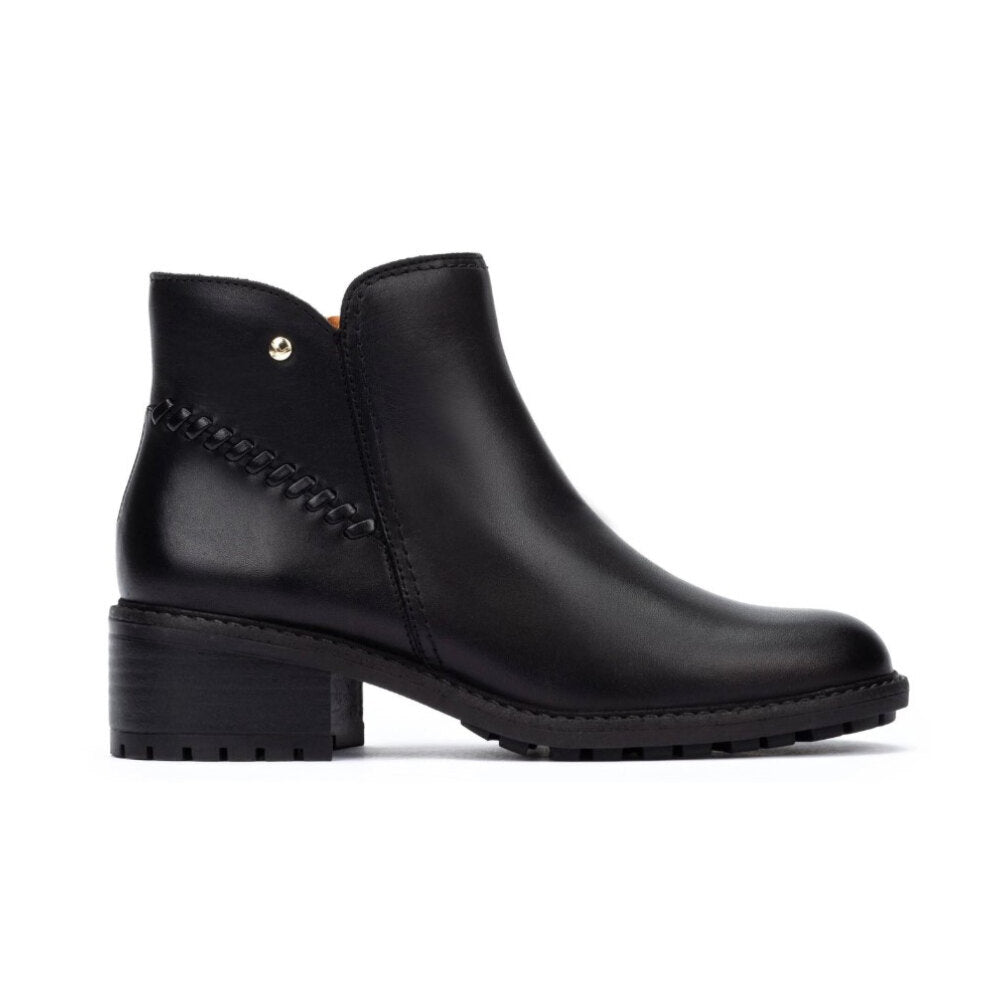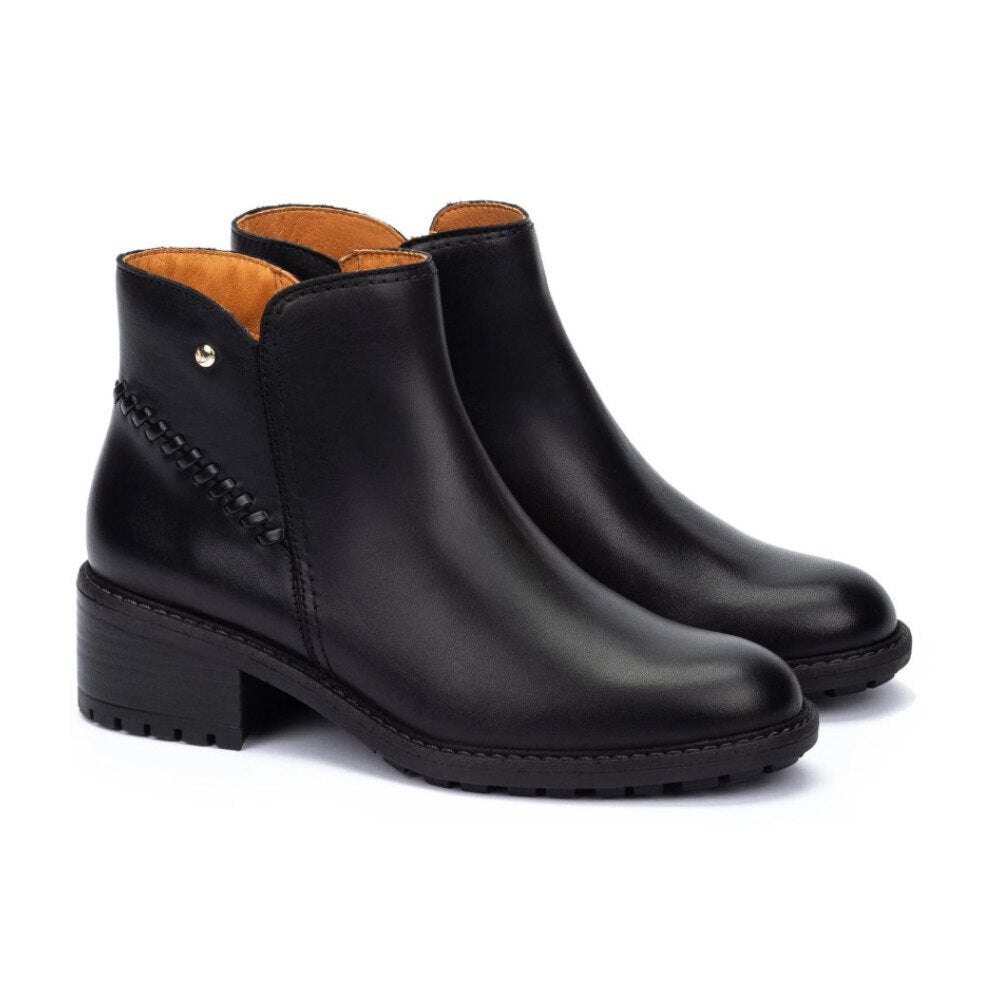 Botín de piel en color negro con un diseño atemporal y sofisticado. Incorpora un detalle trenzado lateral con remache metálico que realza su estilo único. Su tacón medio ancho garantiza comodidad durante todo el día, mientras que la suela track dentada aporta mayor seguridad y agarre en cada paso. Con caña baja y acabado pulido, es el calzado perfecto para combinar tanto con looks casual como más elegantes en la temporada de otoño e invierno.