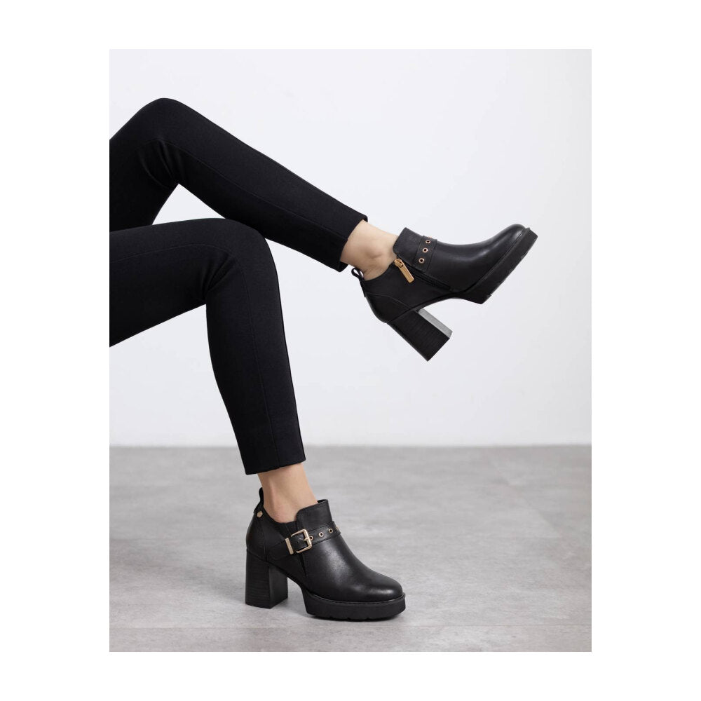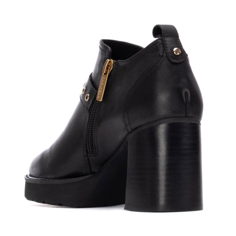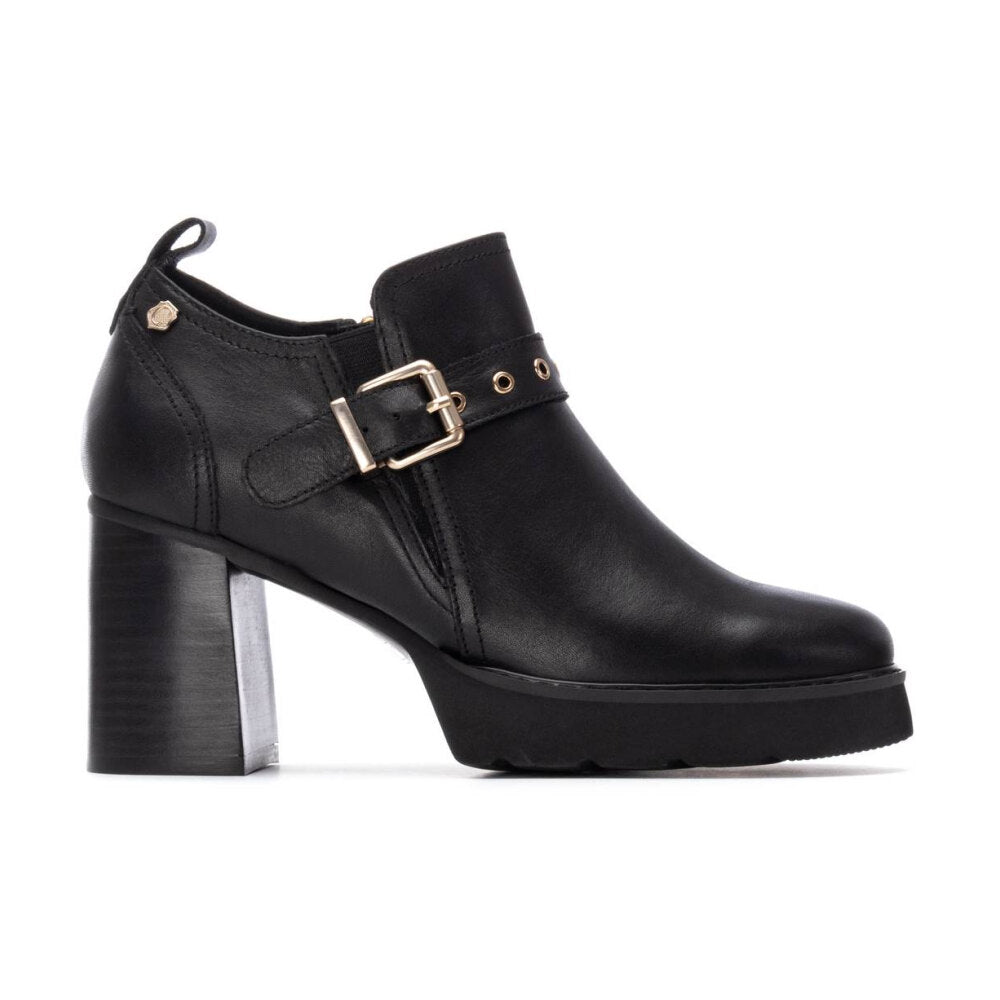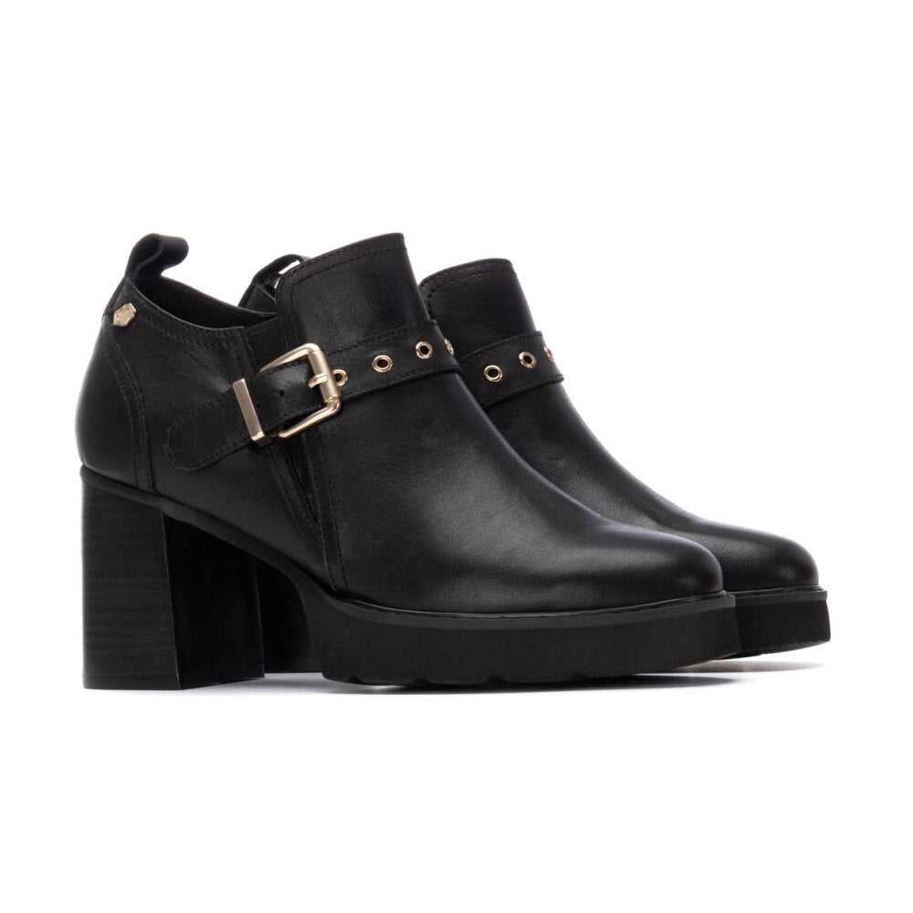 botín de mujer de estilo sofisticado de la marca carmela, fabricado en piel negra de alta calidad. diseño con tacón ancho y plataforma delantera para una pisada estable y cómoda. incorpora hebilla metálica decorativa lateral y cremallera interior para un calce fácil. ideal para looks urbanos, de oficina o para combinar con vaqueros o vestidos.
